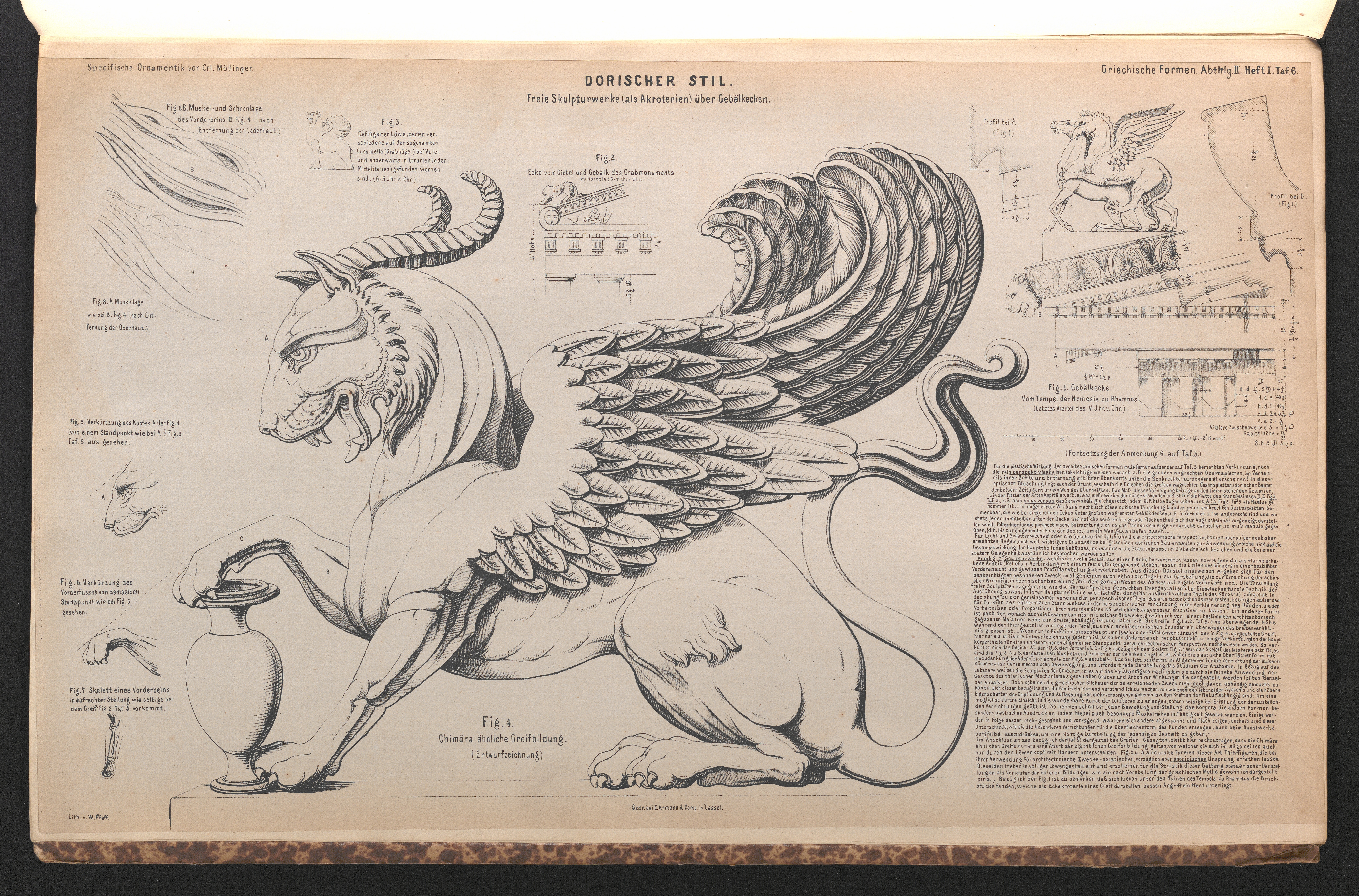 Tafel VI. Fig. 1. Gebälkecke vom Tempel der Nemesis zu Rhamnus, nebst Durchschnitt des Giebelgesimses. Fig. 1. A. und B. Profil des Traufgesimses der hängenden Platte des Krönungsgleides und der Rinnleiste in grossem Masstabe. Fig. 2. Ecke vom Giebel und Gebälk eines Grabmonuments zu Norchia. - Fig. 3. Geflügelter Löwe (mit scharfgezeichneter Muskulatur in der Stilistik des 6-5 Jahres v. Chr.) von der Cucumella (Grabhügel) bei Vulci in Mittelitalien (Etrurien). Fig. 4. Entwurf eines der Chimära ähnlich(...)