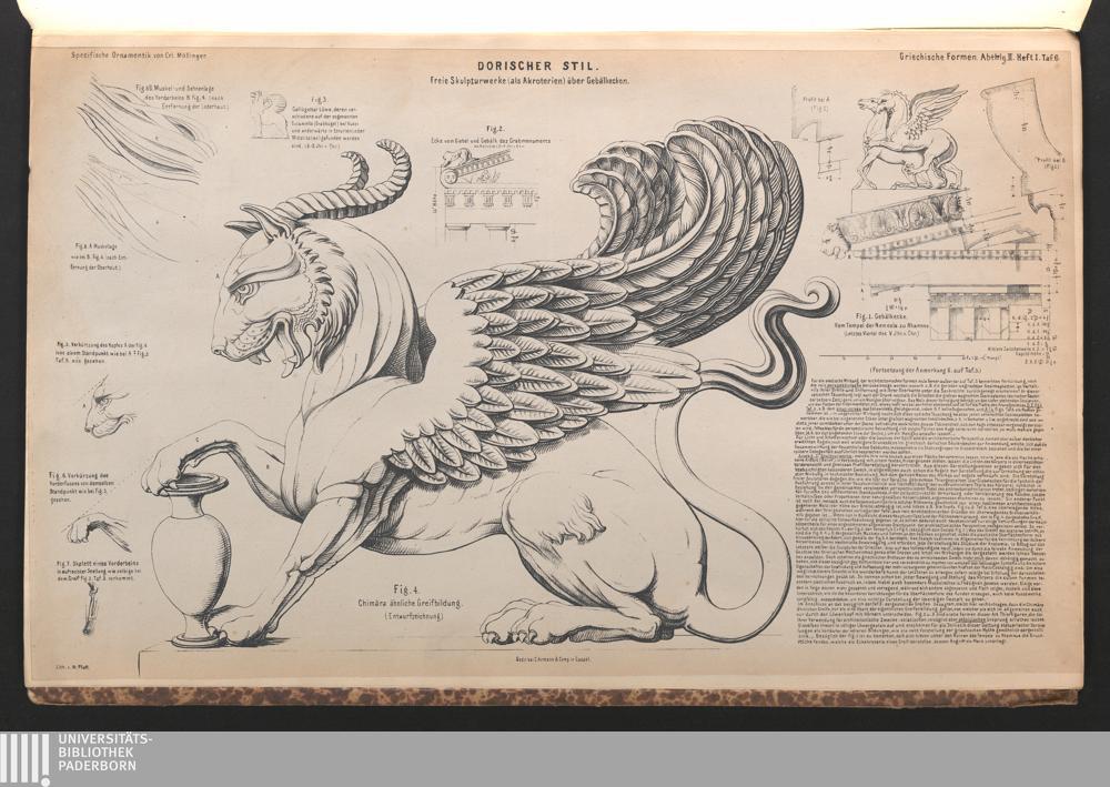 Tafel V. Fig. 1. Giebelecke vom Tempel der Pallas aud Aegina, nebst Durchschnitt des Giebelgesimses. Fig. 1. A.B.C. Profile der Sima, der Traufe der hängenden Platte und des Krönungsgliedes der h. P.; Detail der Triglyphen in gr. Masstabe. Fig. 2. Greif als Eckbekrönung in grossem Masstabe. Fig. 2. Greif als Eckbekrönung in grossem Masstabe. Fig. 3. Skelett der ionischen Durchgangshalle oder der Propyläen zu Priene. Fig. 4. Abgewickeltes Wellenprofil der Rinnleiste an den Propyläen, in Bezug auf die (...)