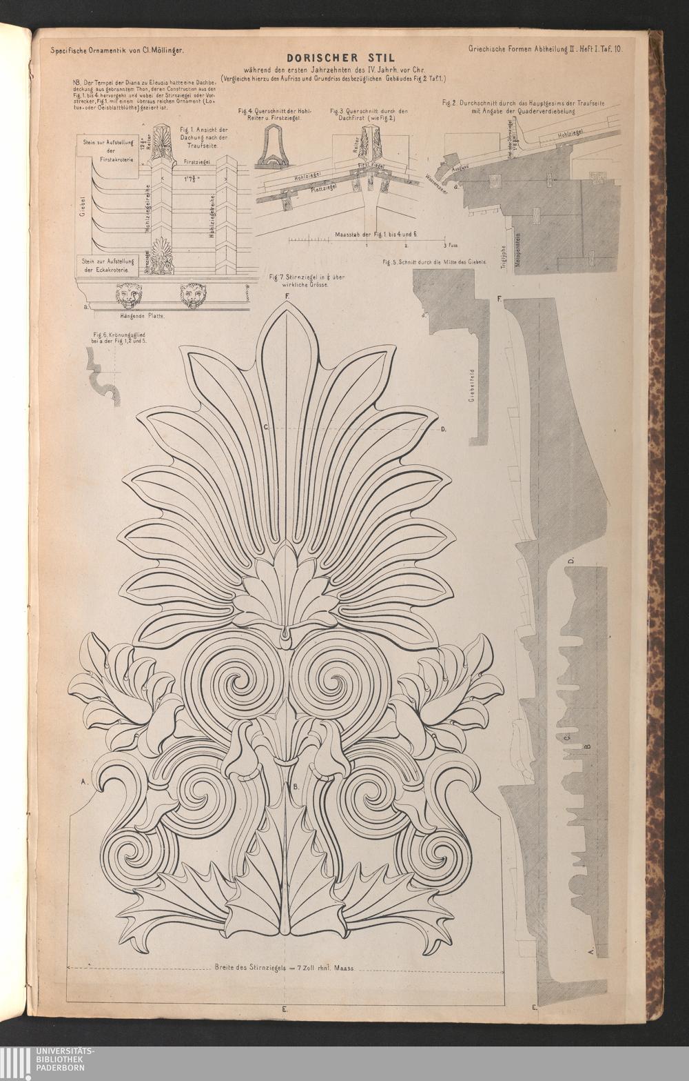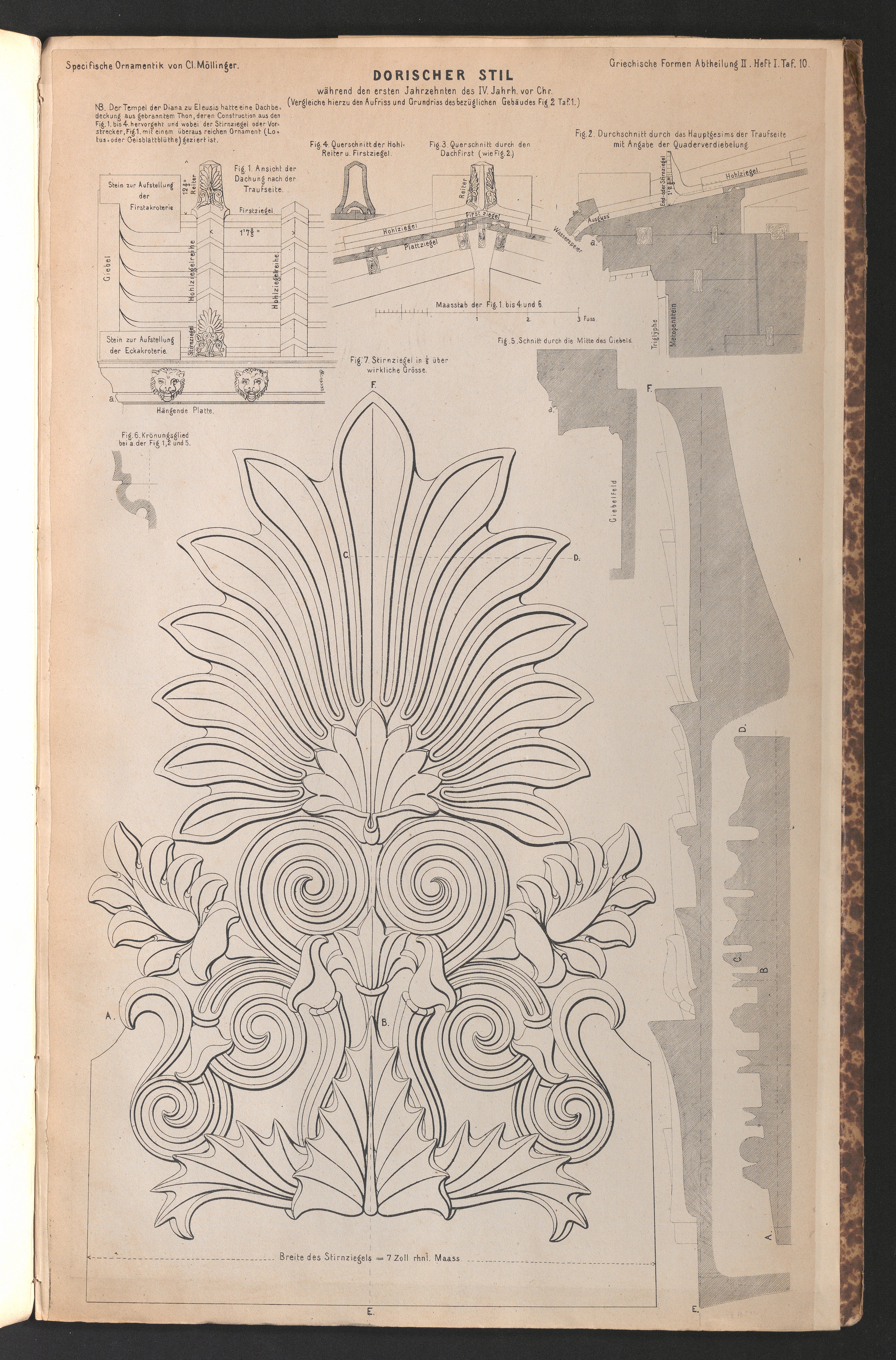 Tafel X. Dachbedeckung des Tempels der Dianazu Eleusis aus gebranntem Thon. Fig. 1. Ansicht der Dachung gegen die Traufseite, mit Angabe der Quaderverdiebelungen. Fig. 3. Querschnitt durch den Dachfirst. Fig. 4. Querschnitt der Dachreiter und First-Hohlziegel. Fig. 5. Schnitt durch die Mitte des Giebelfeldes. Fig. 6. Profil des Krönungsgliedes der hängenden Platte. Fig. 7. Stirnziegel in 1/6 mehr denn wirklicher Grösse gezeichnet und mit drei Scnittrissen der zierratlichen Theile.