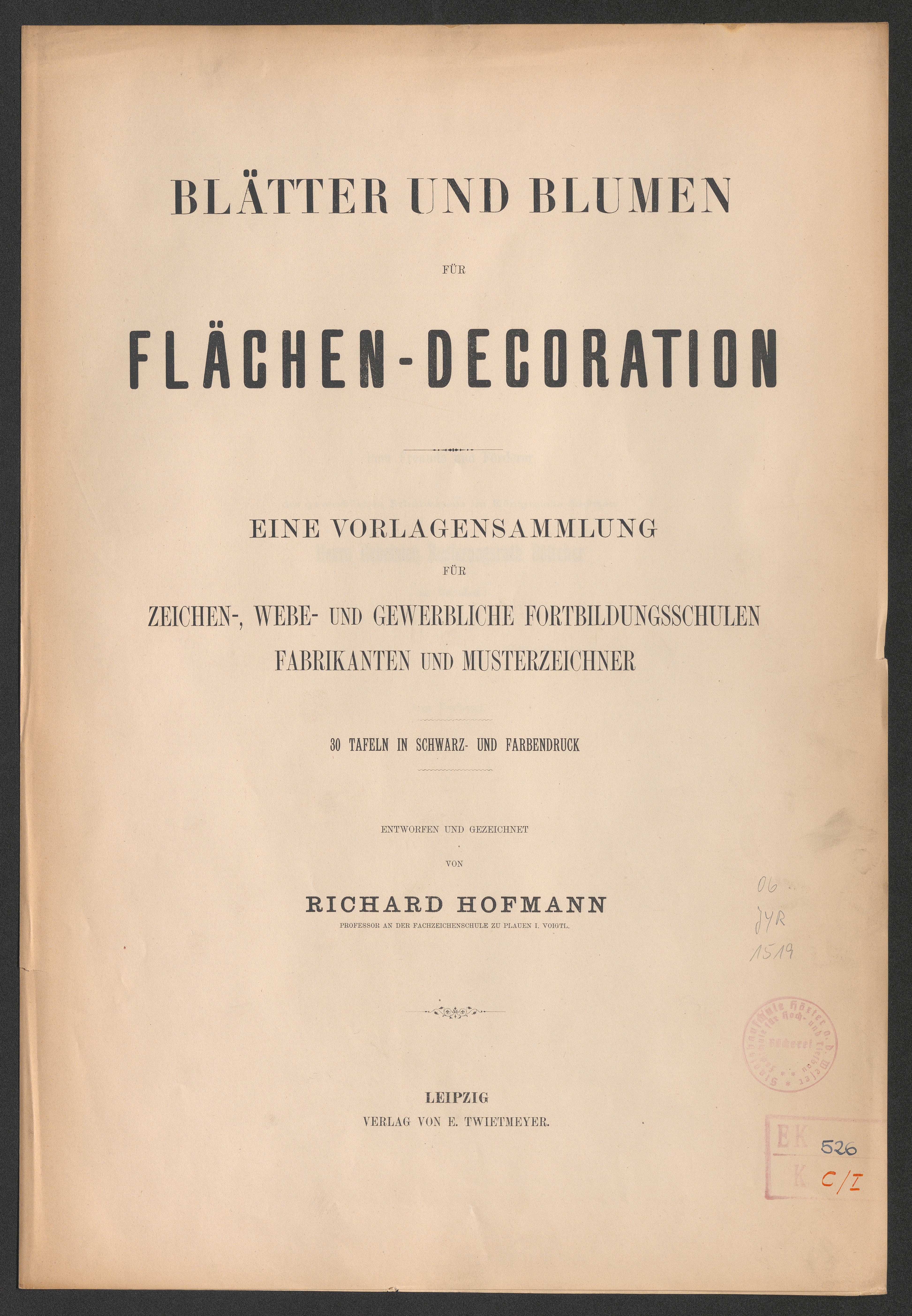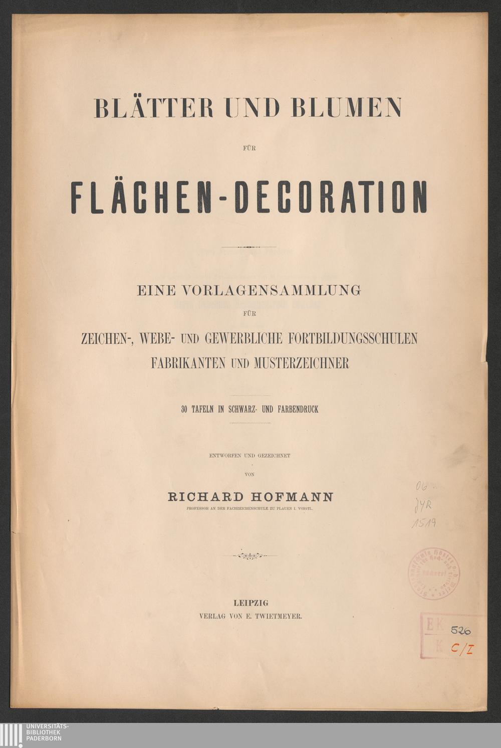 Blätter und Blumen für Flächen-Decoration : eine Vorlagensammlung für Zeichen-, Webe- und gewerbliche Fortbildungsschulen, Fabrikanten und Musterzeichner ; 30 Tafeln in Schwarz- und Farbendruck / entw. u. gez. von Richard Hofmann