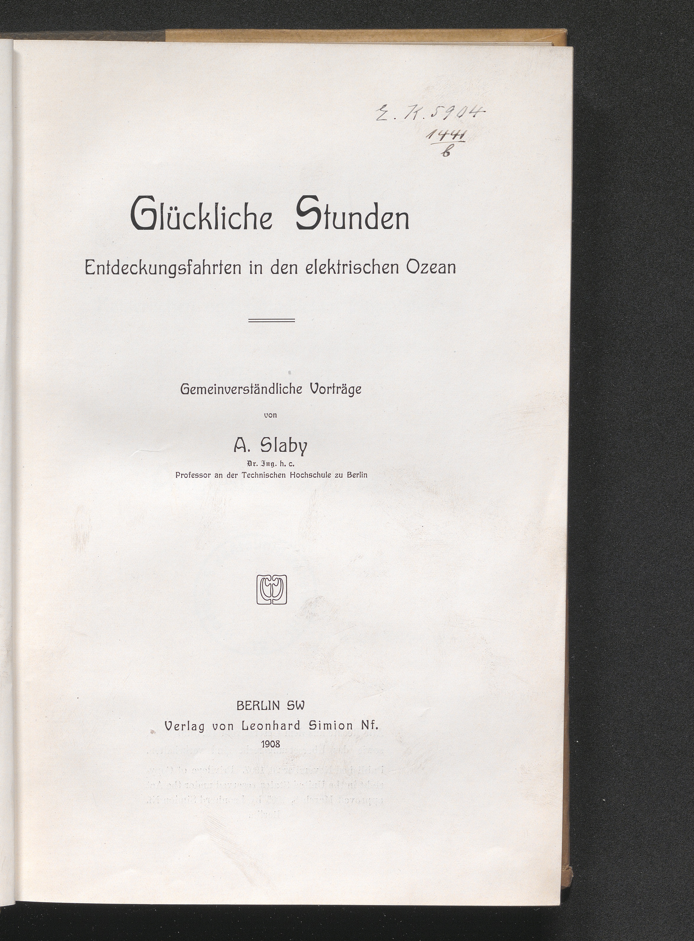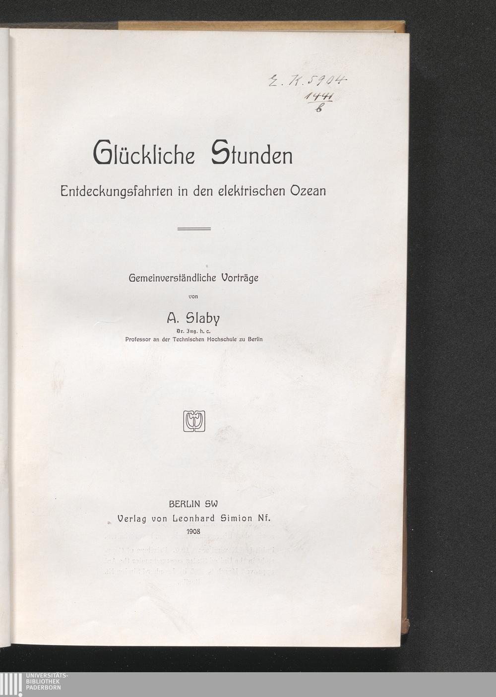 Glückliche Stunden : Entdeckungsfahrten in den elektrischen Ozean ; gemeinverständliche Vorträge / von A. Slaby