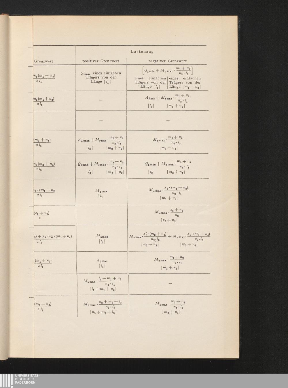 Tabelle für die Grenzwerte der Stütz- und Schnittkräfte eines Gerberbalkens