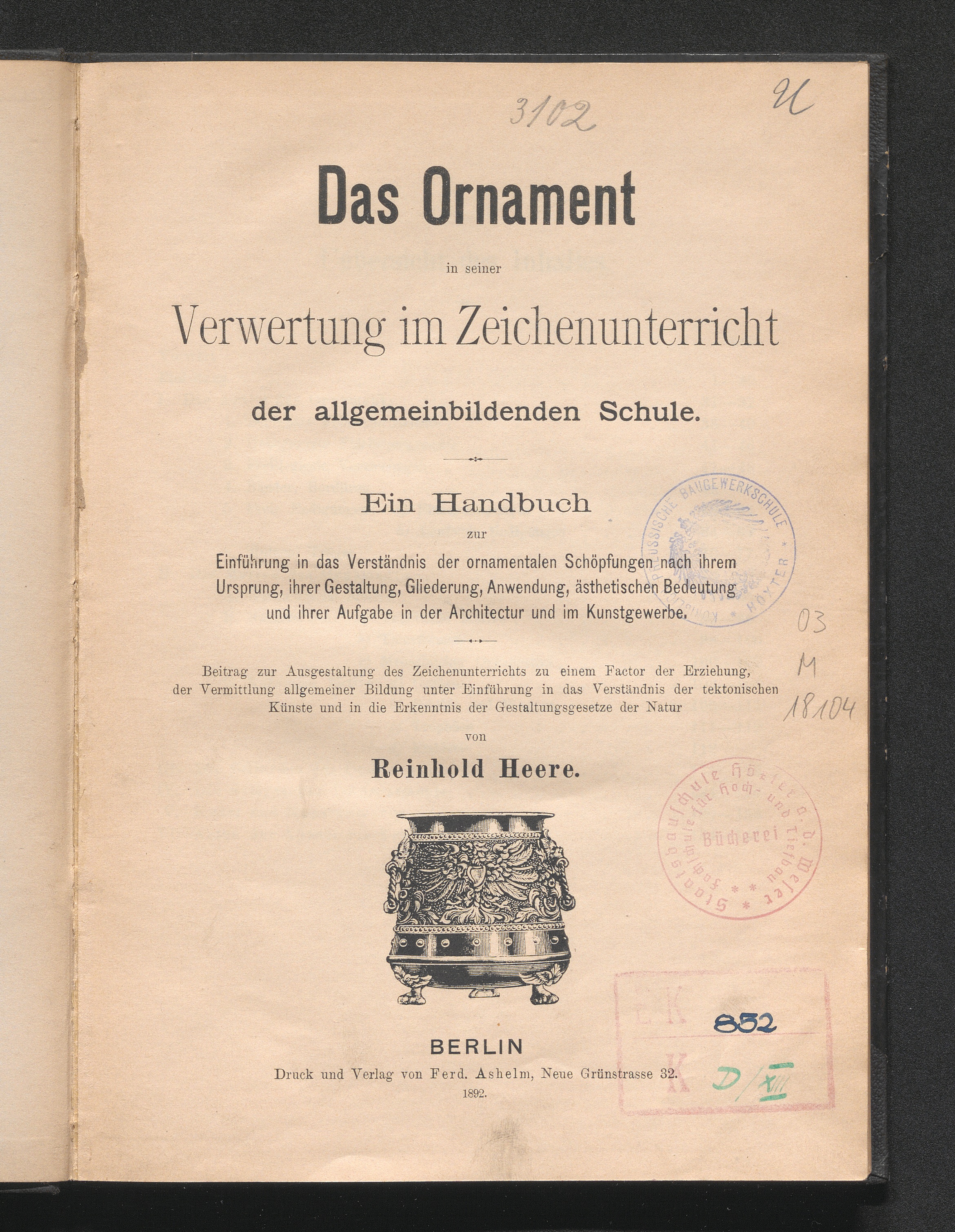 Das Ornament in seiner Verwertung im Zeichenunterricht der allgemeinbildenden Schulen : ein Handbuch zur Einführung in das Verständnis der ornamentalen Schöpfungen nach ihrem Ursprung, ihrer Gestaltung, Gliederung, Anwendung, ästhetischen Bedeutung und ihrer Aufgabe in der Architectur und im Kunstgewerbe ; Beitrag zur Ausgestaltung des Zeichenunterrichts zu einem Factor der Erziehung, der Vermittlung allgemeiner Bildung unter Einführung in das Verständnis der tektonischen Künste und in die Erkenntnis der Gestaltungsgesetze der Natur / von Reinhold Heere