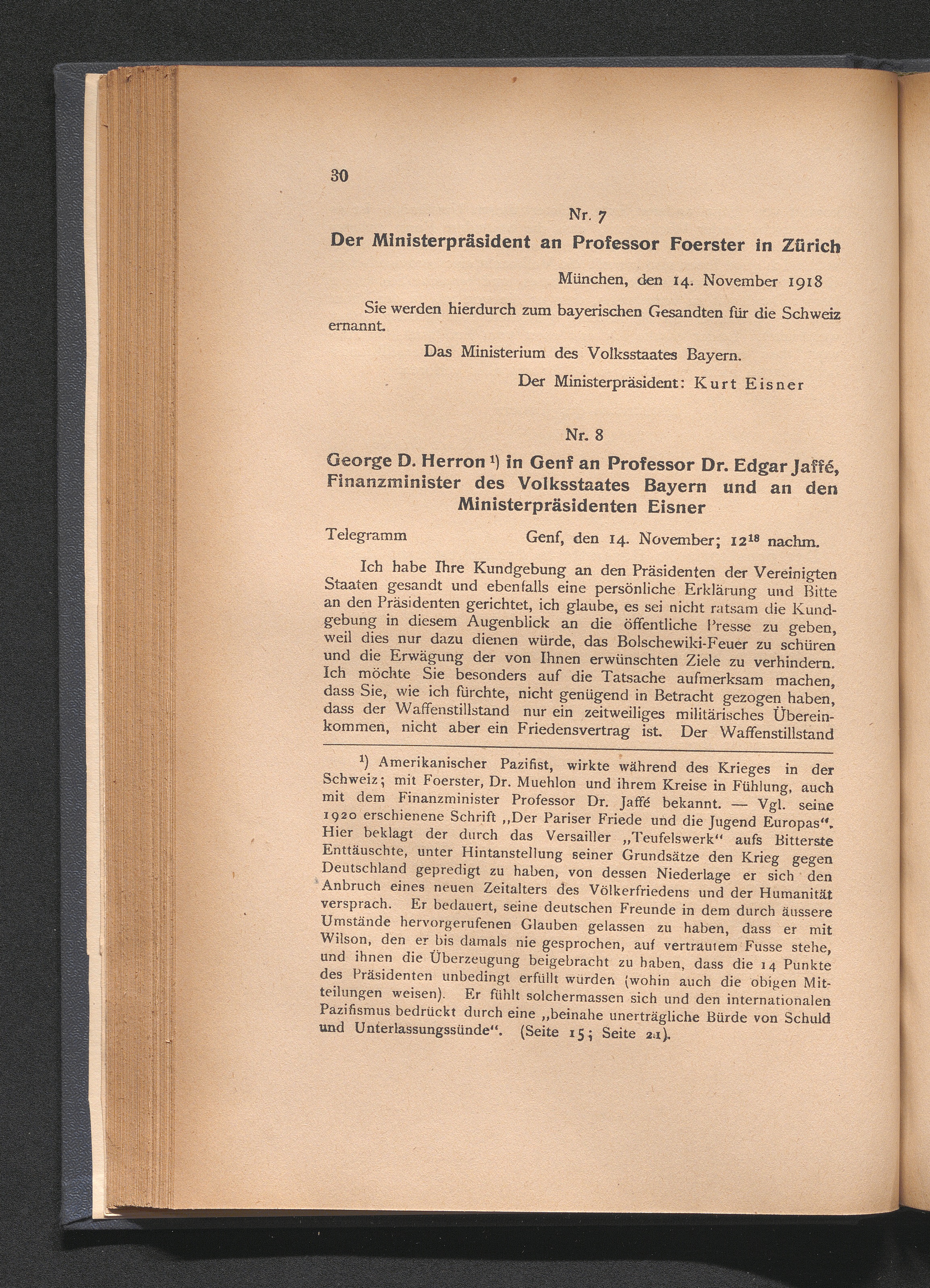 8. Telegramm George D. Herron’s in Genf an Professor Dr. Edgar Jaffé, Finanzminister[...]