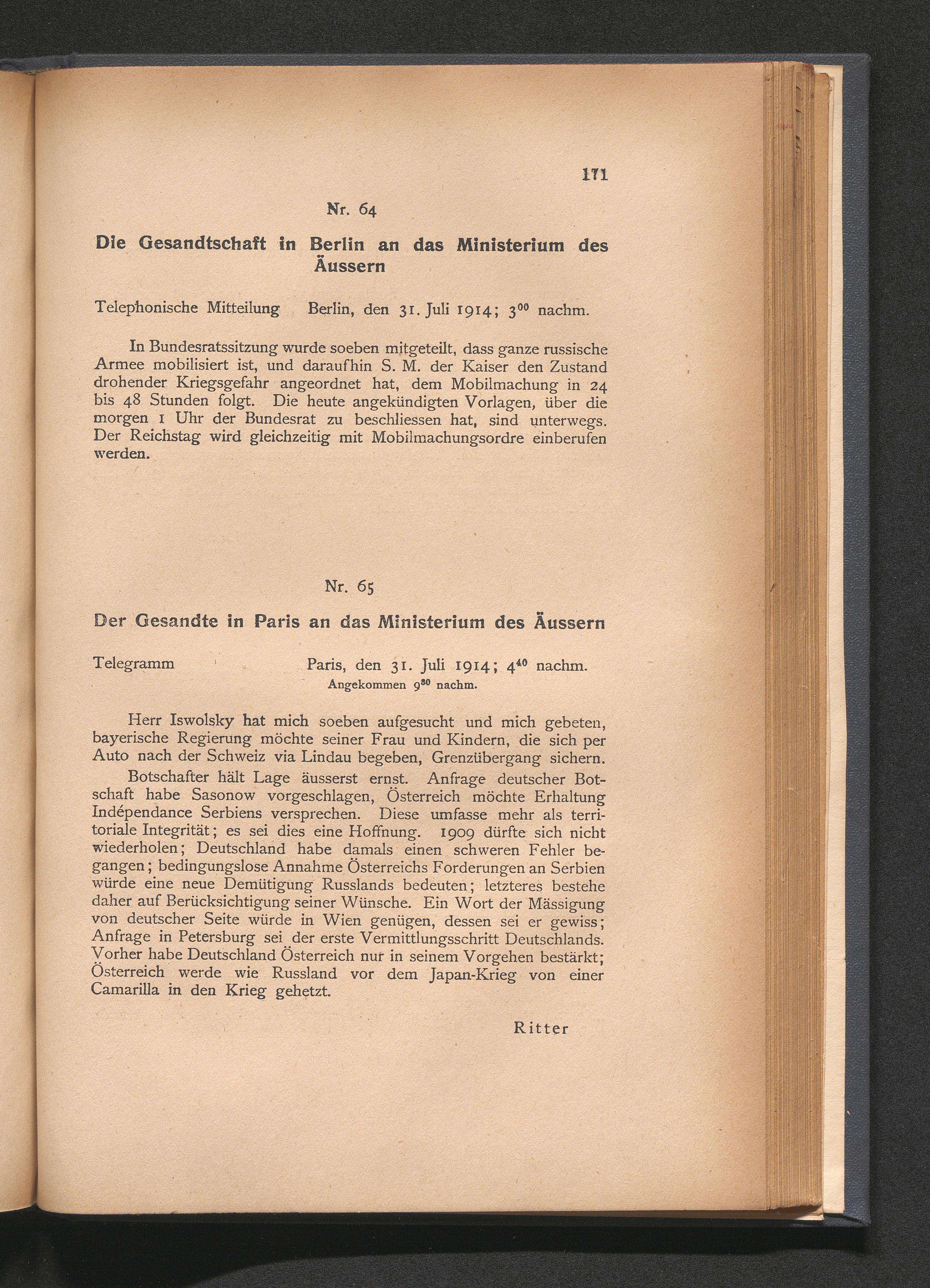 B Bayerische Gesandtenberichte aus den letzten Vorkriegswochen