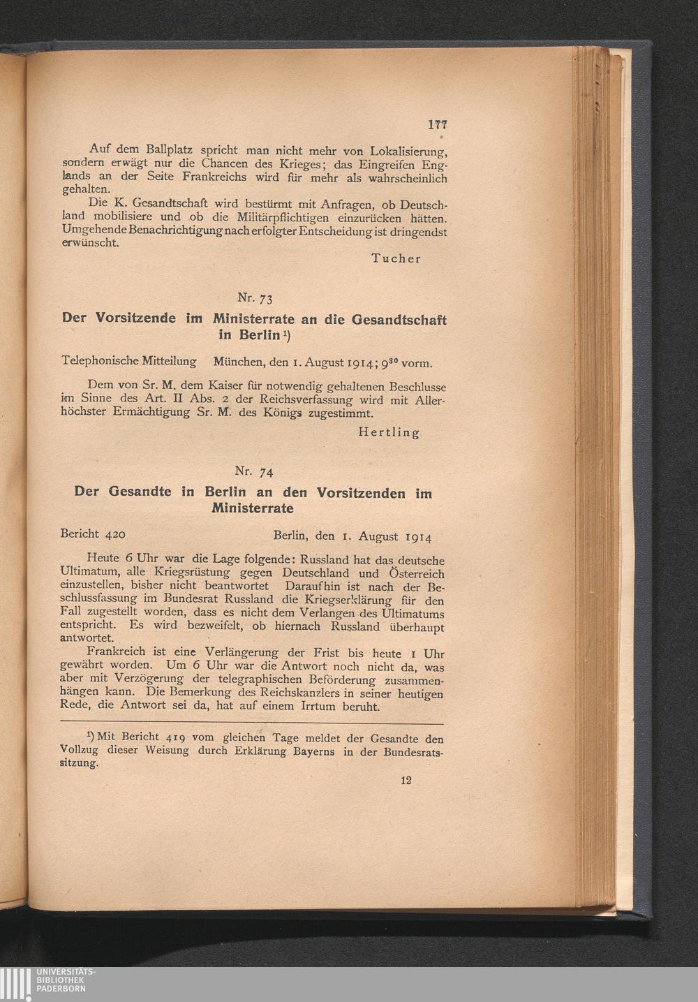 B Bayerische Gesandtenberichte aus den letzten Vorkriegswochen
