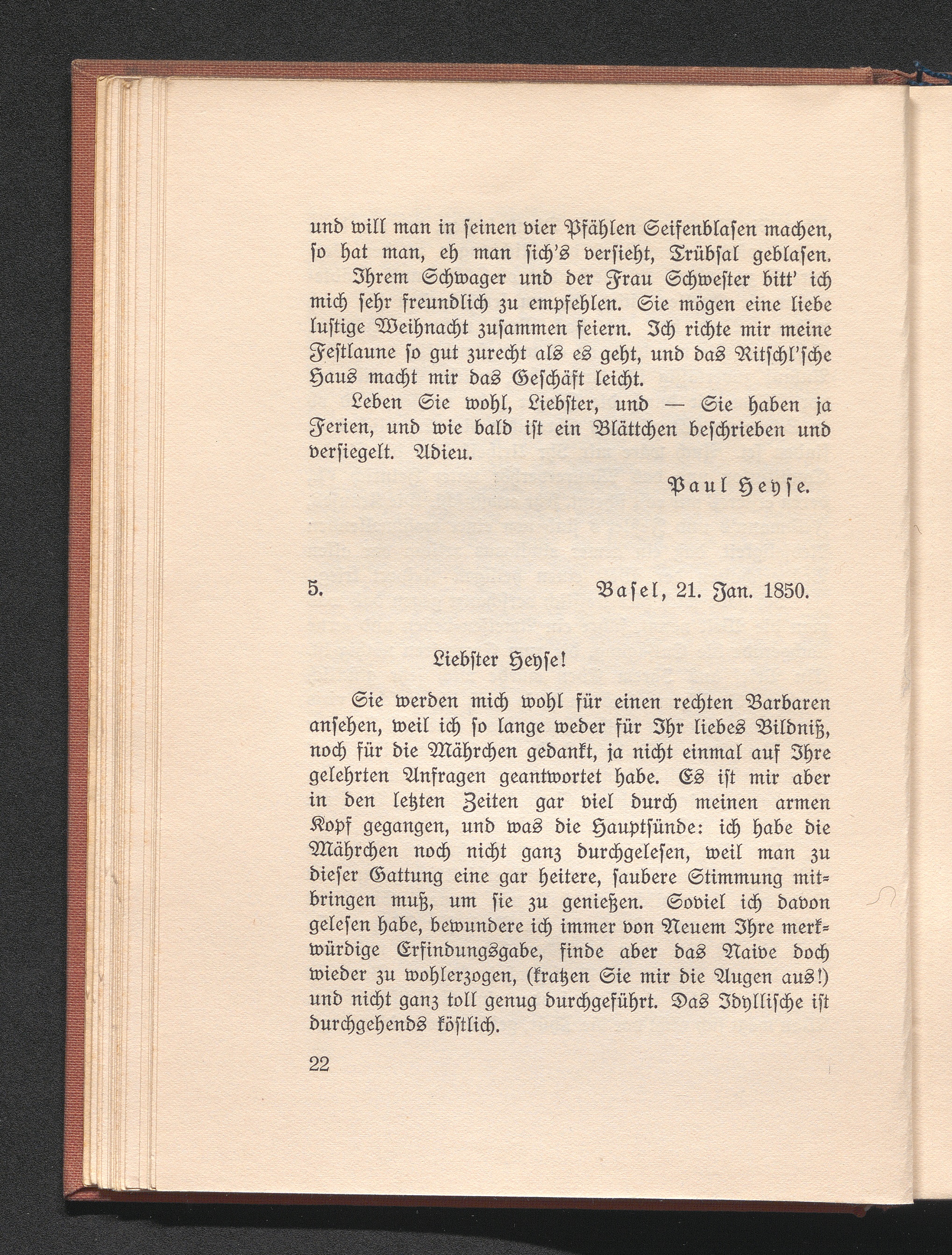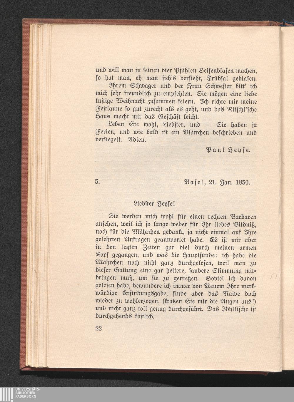 5. Burckhardt an Heyse. Basel 21. Januar 1850