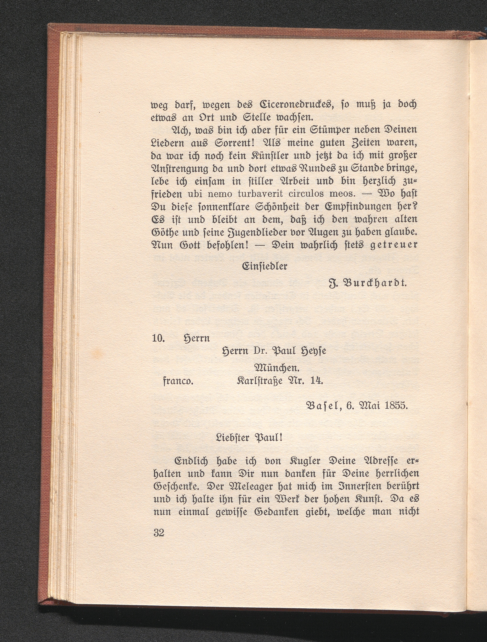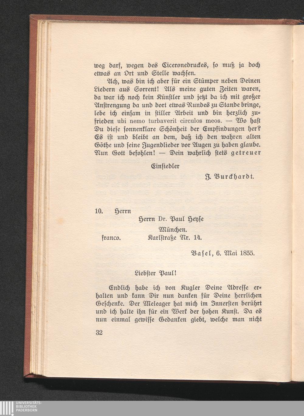10. Burckhardt an Heyse. Basel 6. Mai 1855