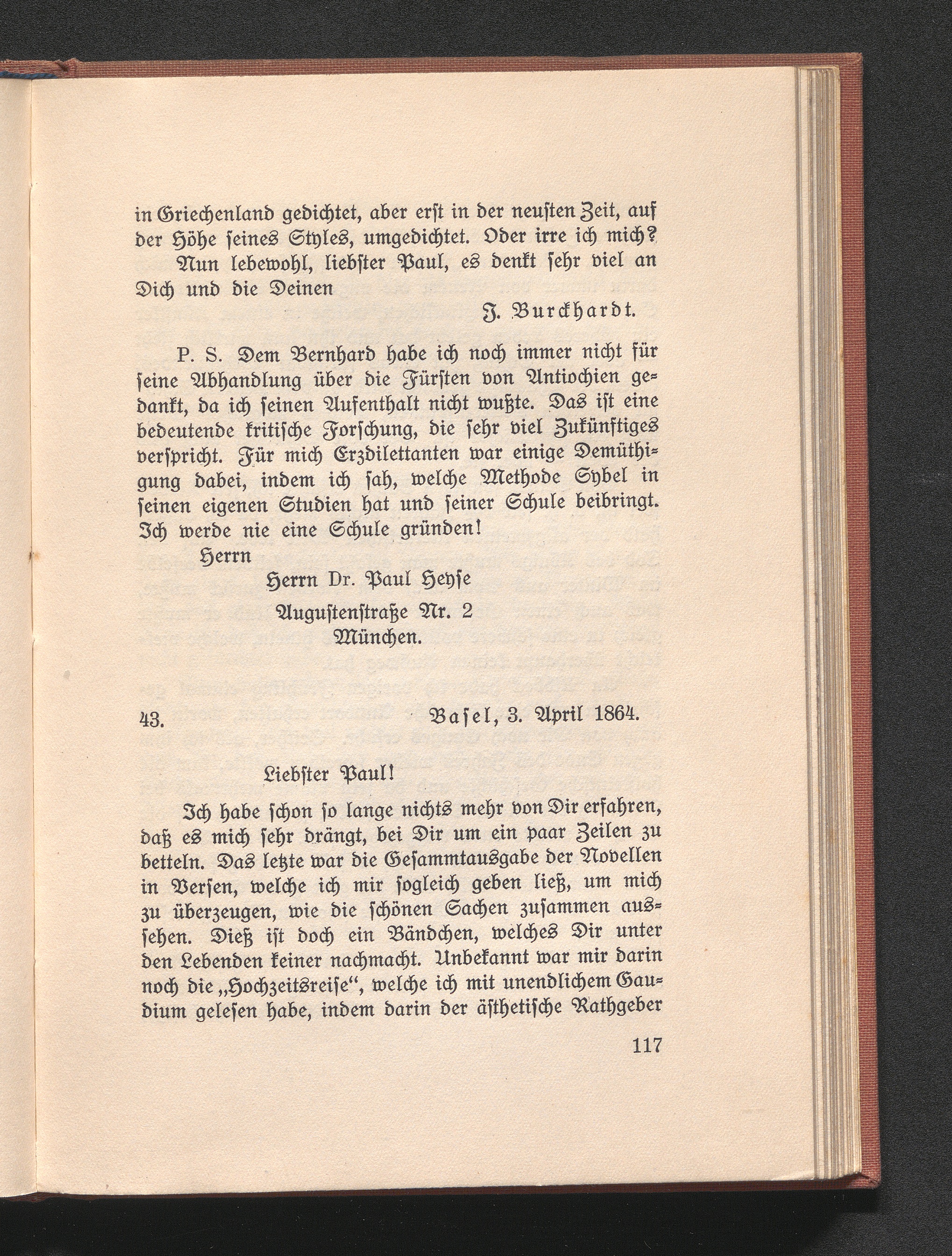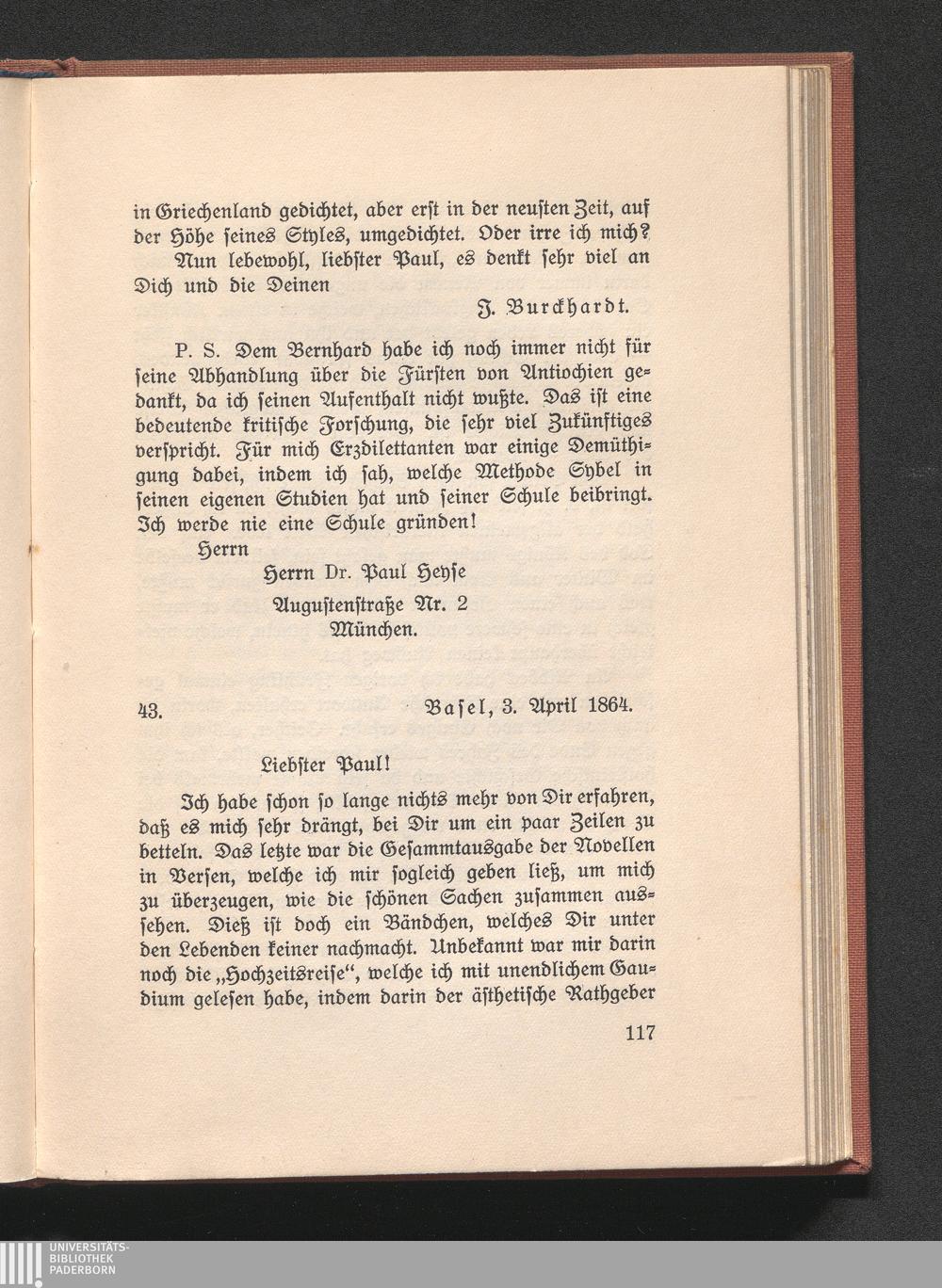 43. Burckhardt an Heyse. Basel 3. April 1864