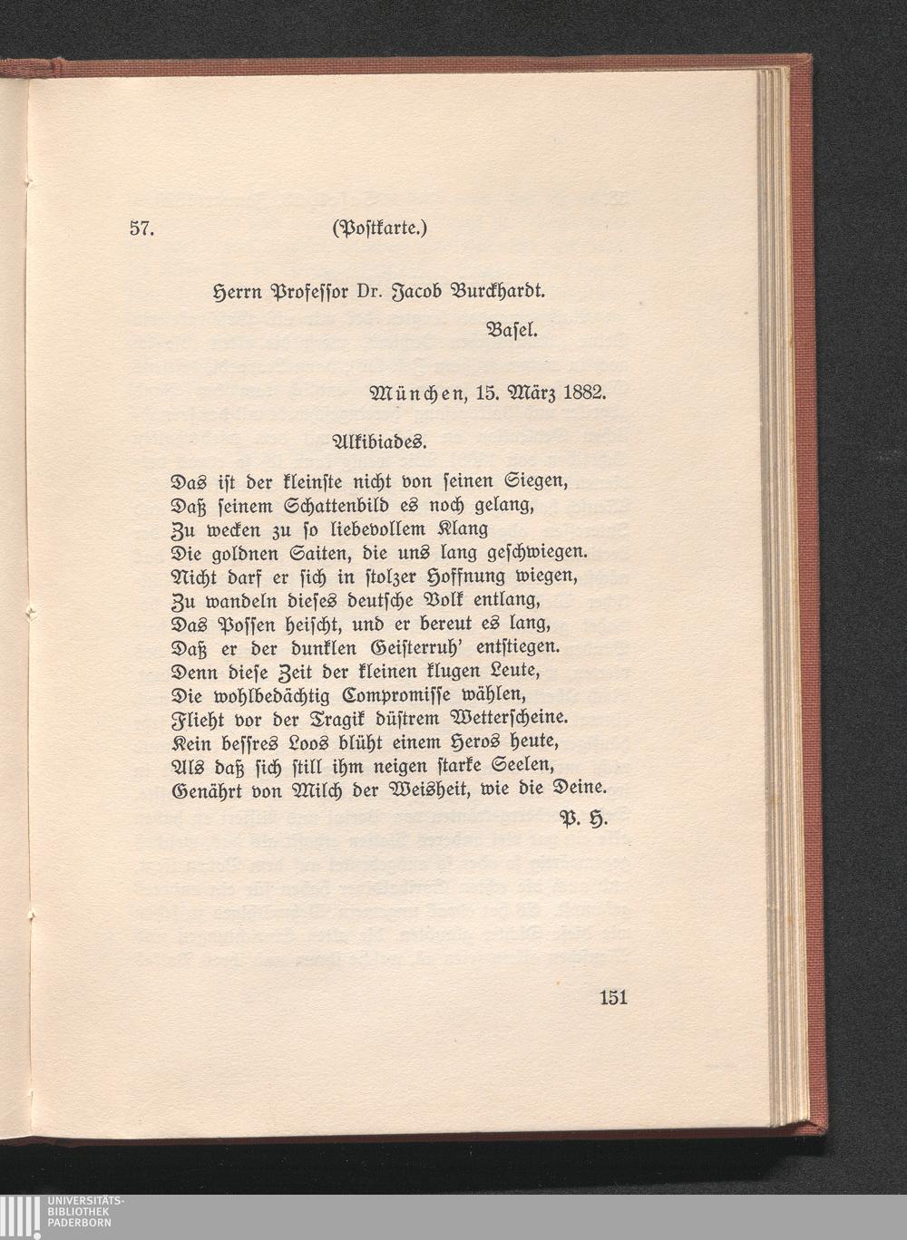 57. Heyse an Burckhardt. München 15. März 1882