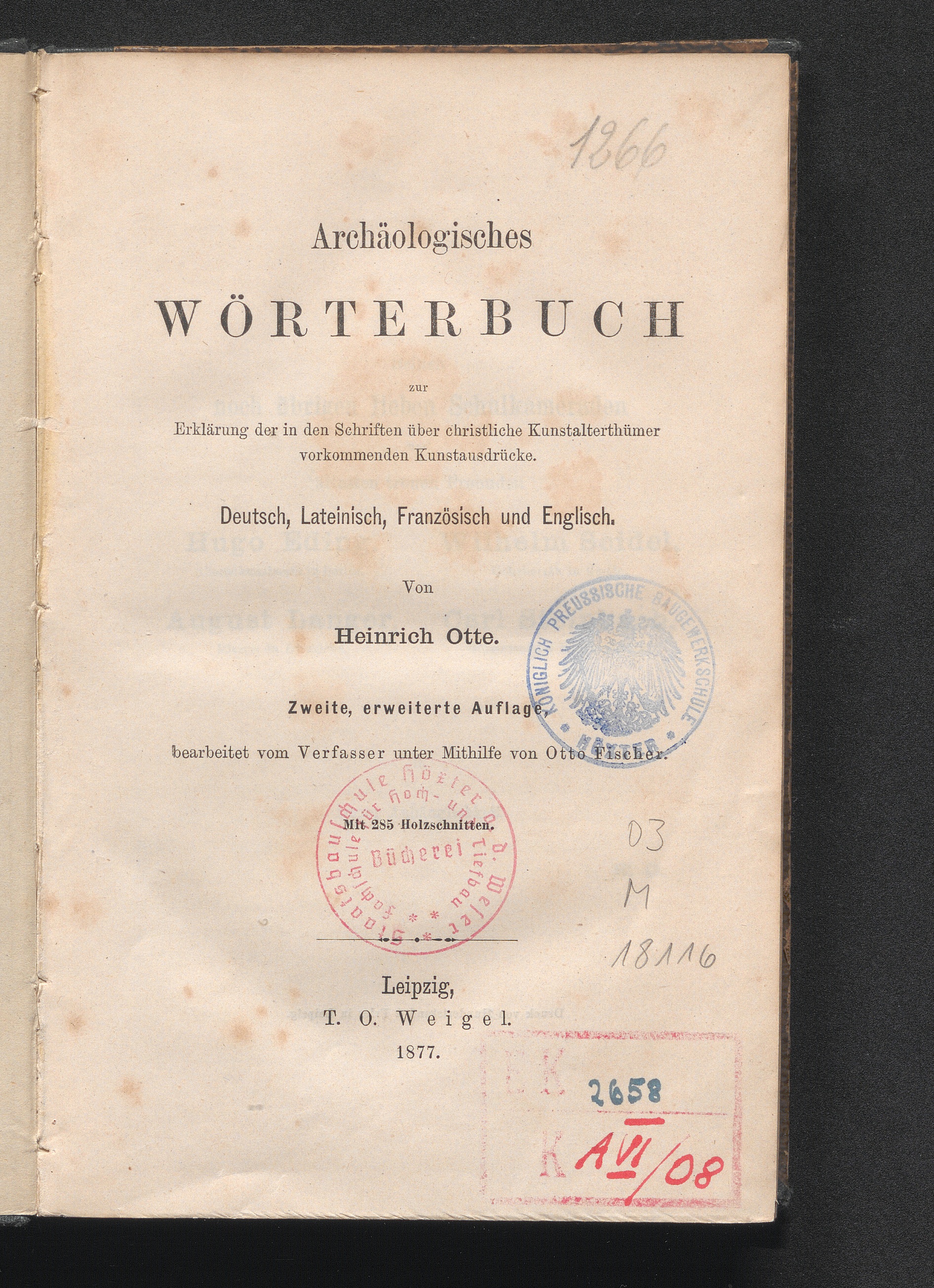 Archäologisches Wörterbuch zur Erklärung der in den Schriften über christliche Kunstalterthümer vorkommenden Kunstausdrücke : Deutsch, Lateinisch, Französisch und Englisch / von Heinrich Otte