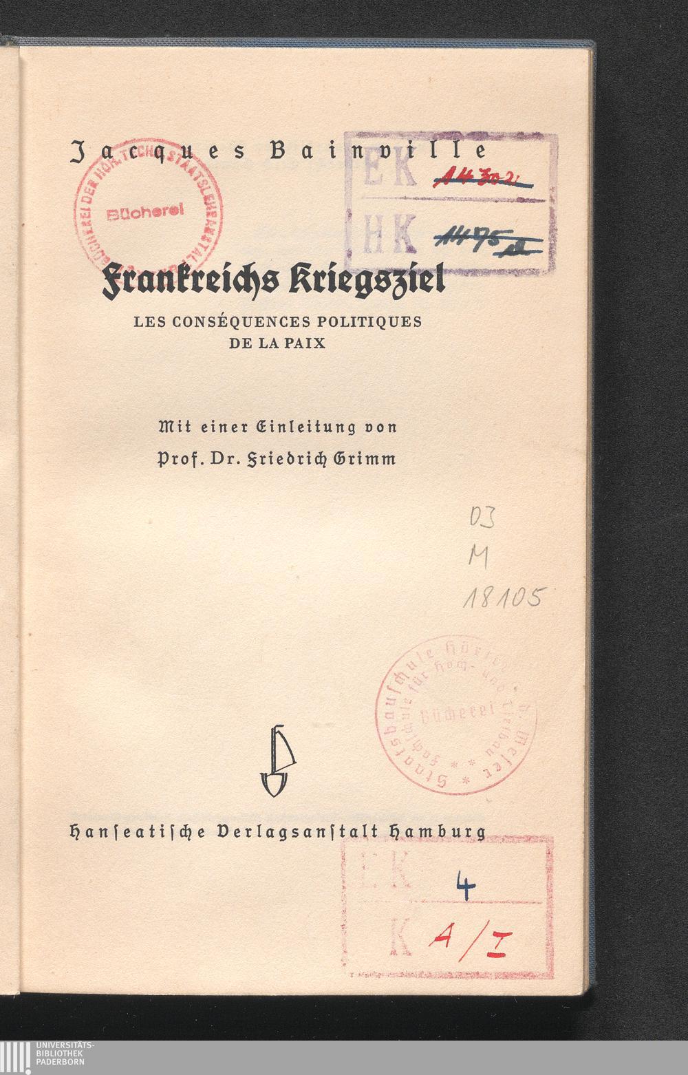 Frankreichs Kriegsziel / Jacques Bainville. Mit einer Einleitung von Prof. Dr. Friedrich Grimm. [Aus dem Französischen übertragen von Albrecht Erich Günther]