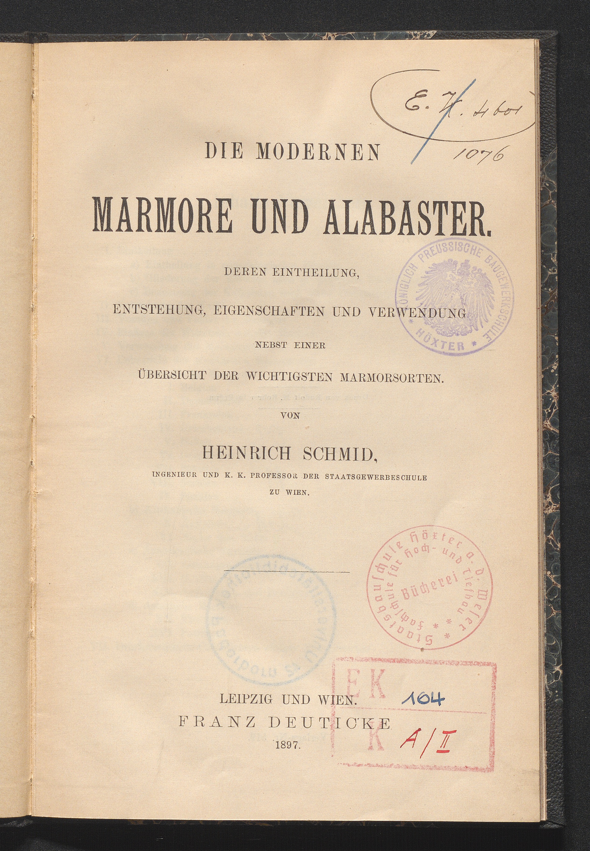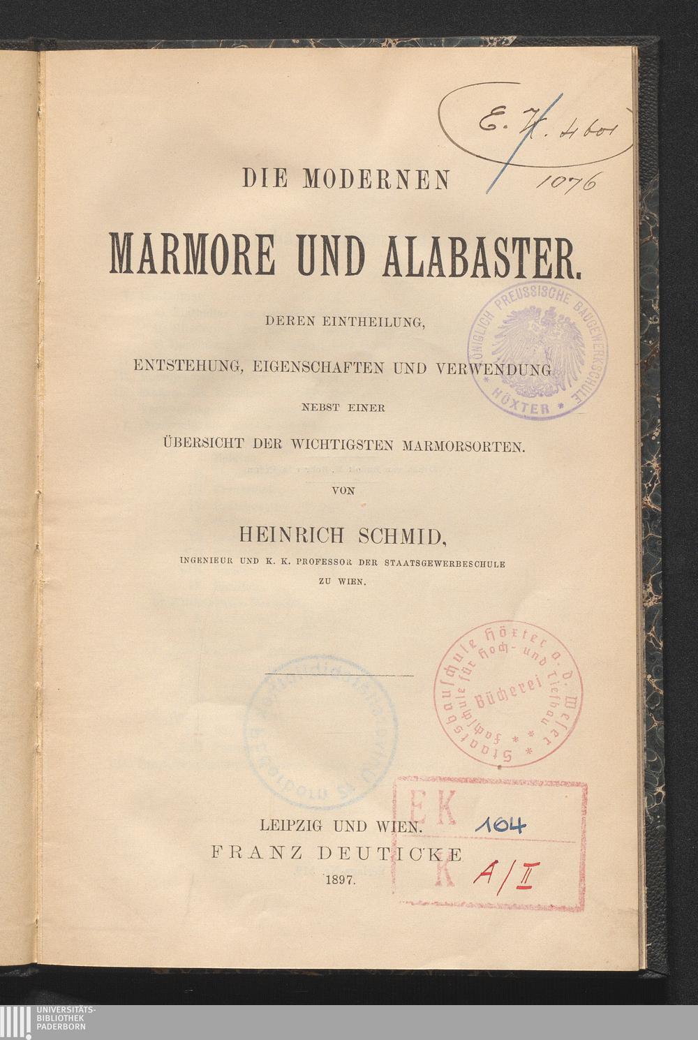 Die modernen Marmore und Alabaster : deren Eintheilung, Entstehung, Eigenschaften und Verwendung nebst einer Übersicht der wichtigsten Marmorsorten / von Heinrich Schmid