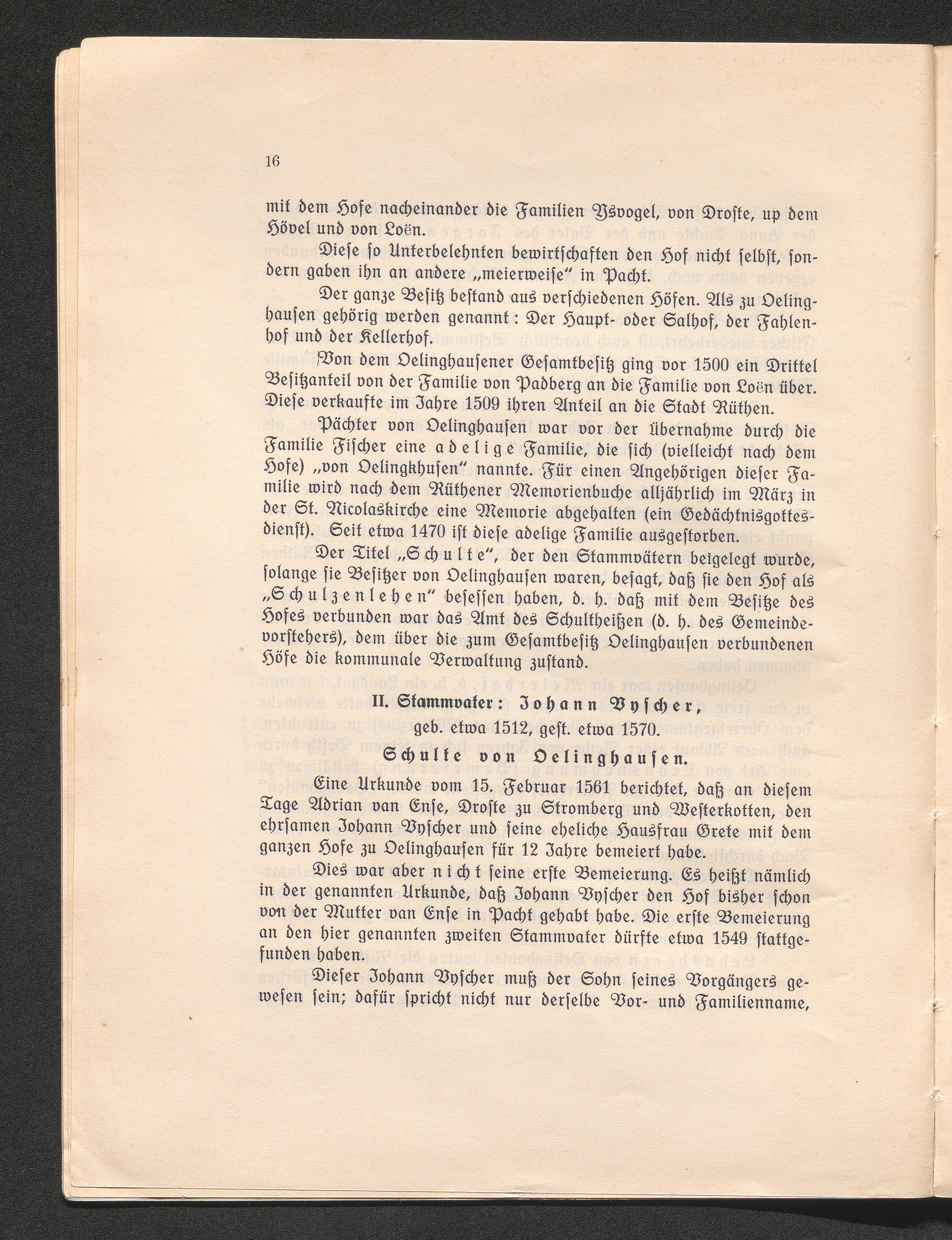 II. Stammvater: Johann Vyscher, geb. etwa 1512, gest. etwa 1570. Schulte von Oel[...]