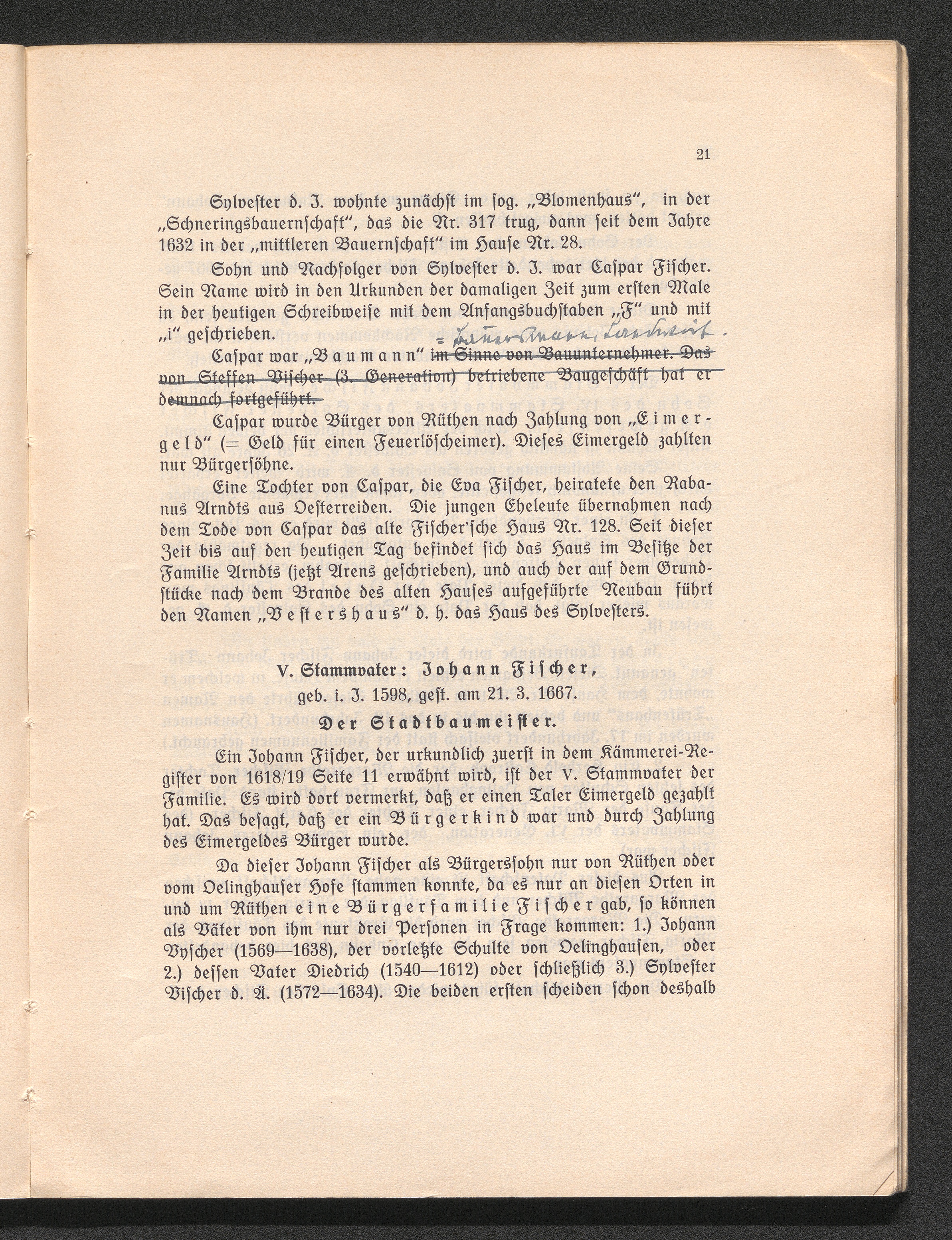 V. Stammvater: Johann Fischer, geb. i. J. 1598, gest. am 21. 3. 1667. Der Stadtb[...]