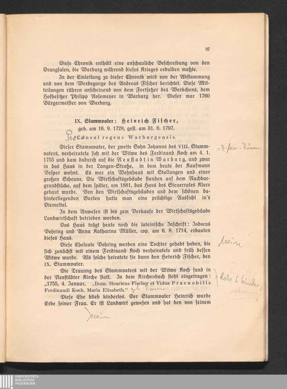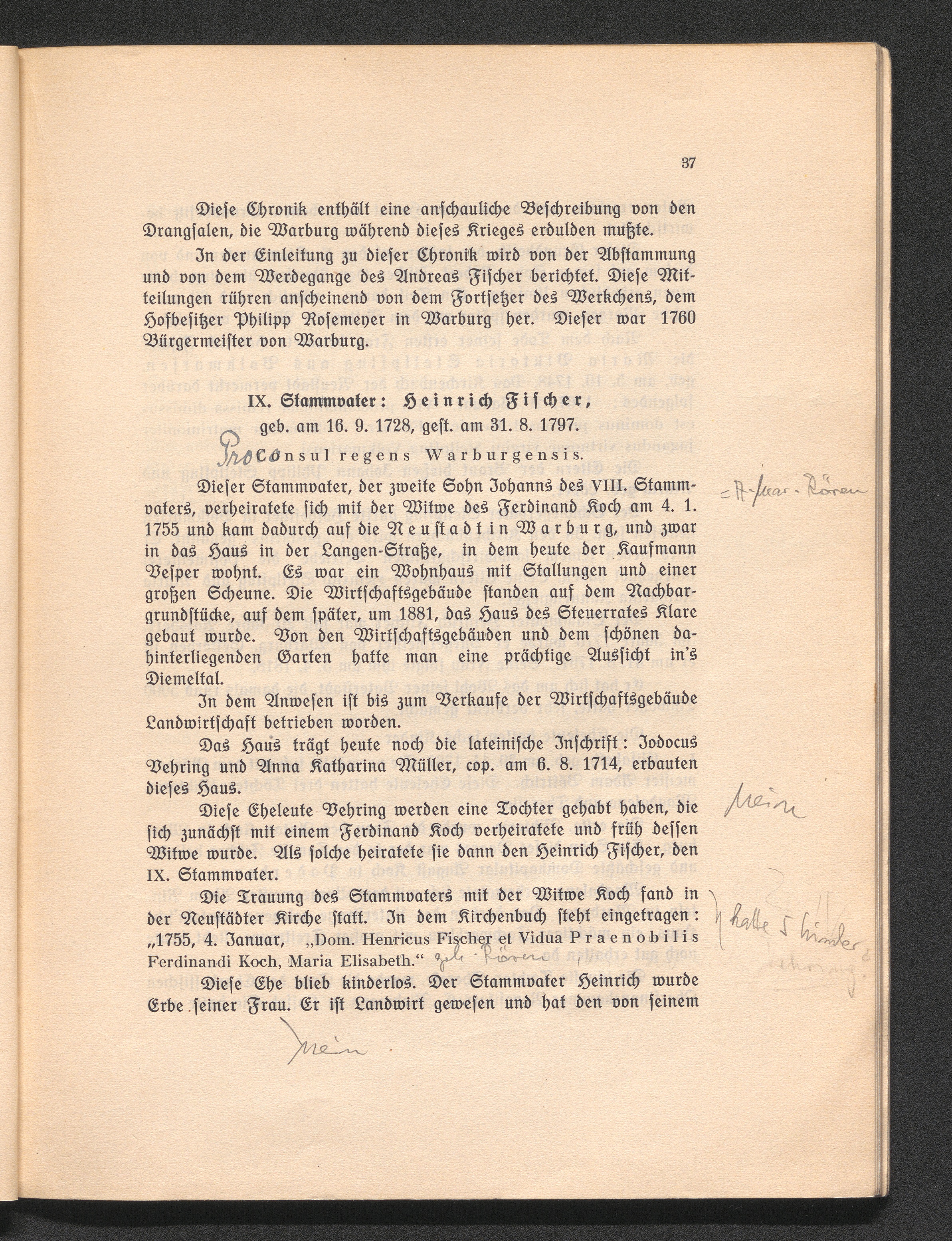 IX. Stammvater: Heinrich Fischer, geb. am 16.9.1728, gest. am 31.8.1797. Consul regens[...]