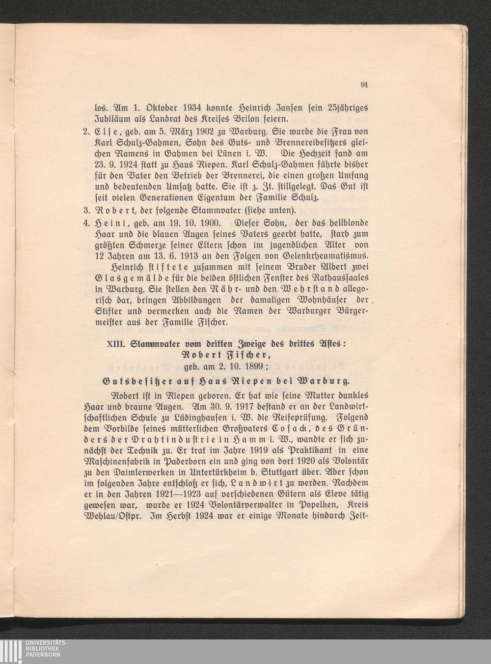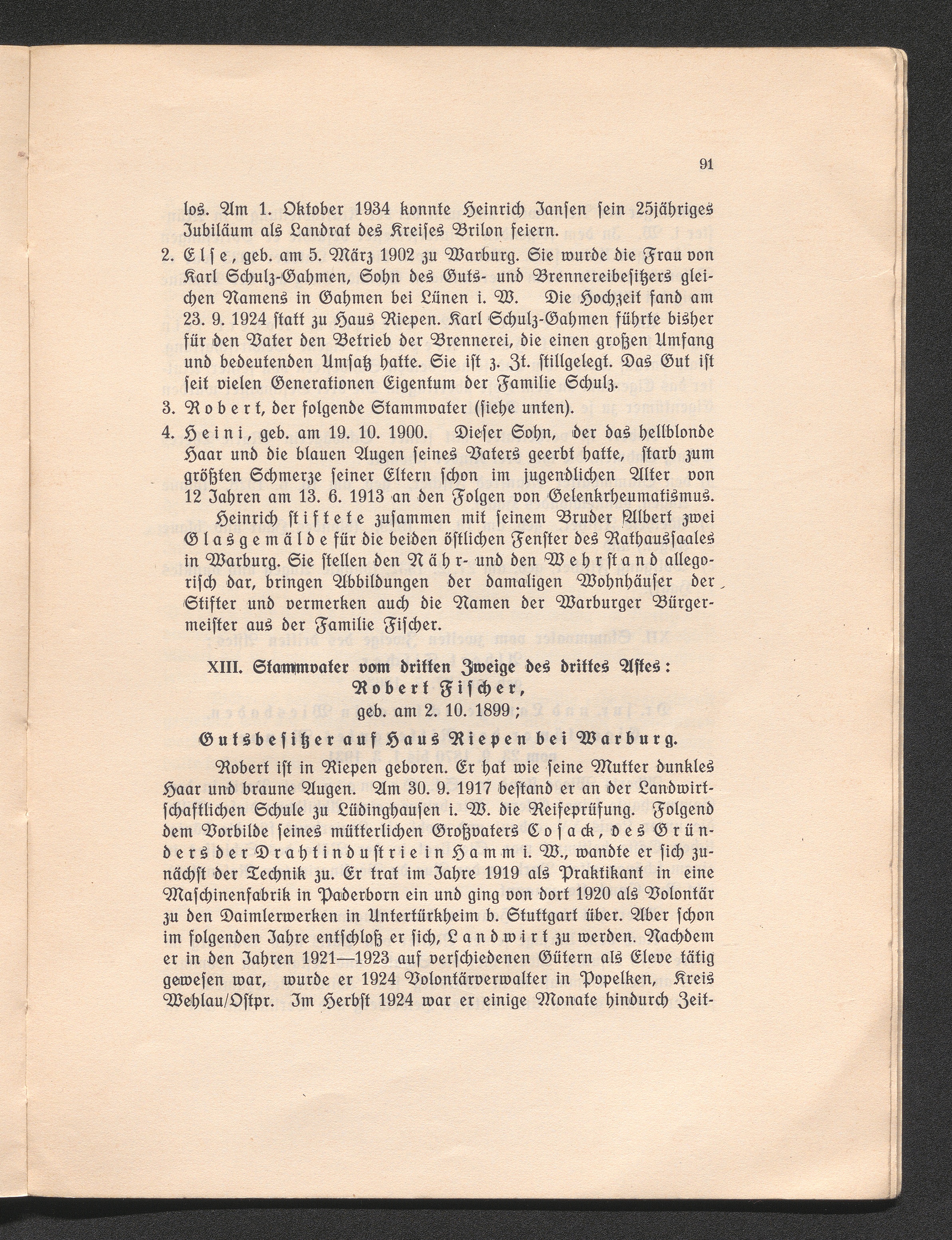 XIII. Stammvater vom dritten Zweige des dritten Astes: Robert Fischer, geb. am 2.10.1899;[...]