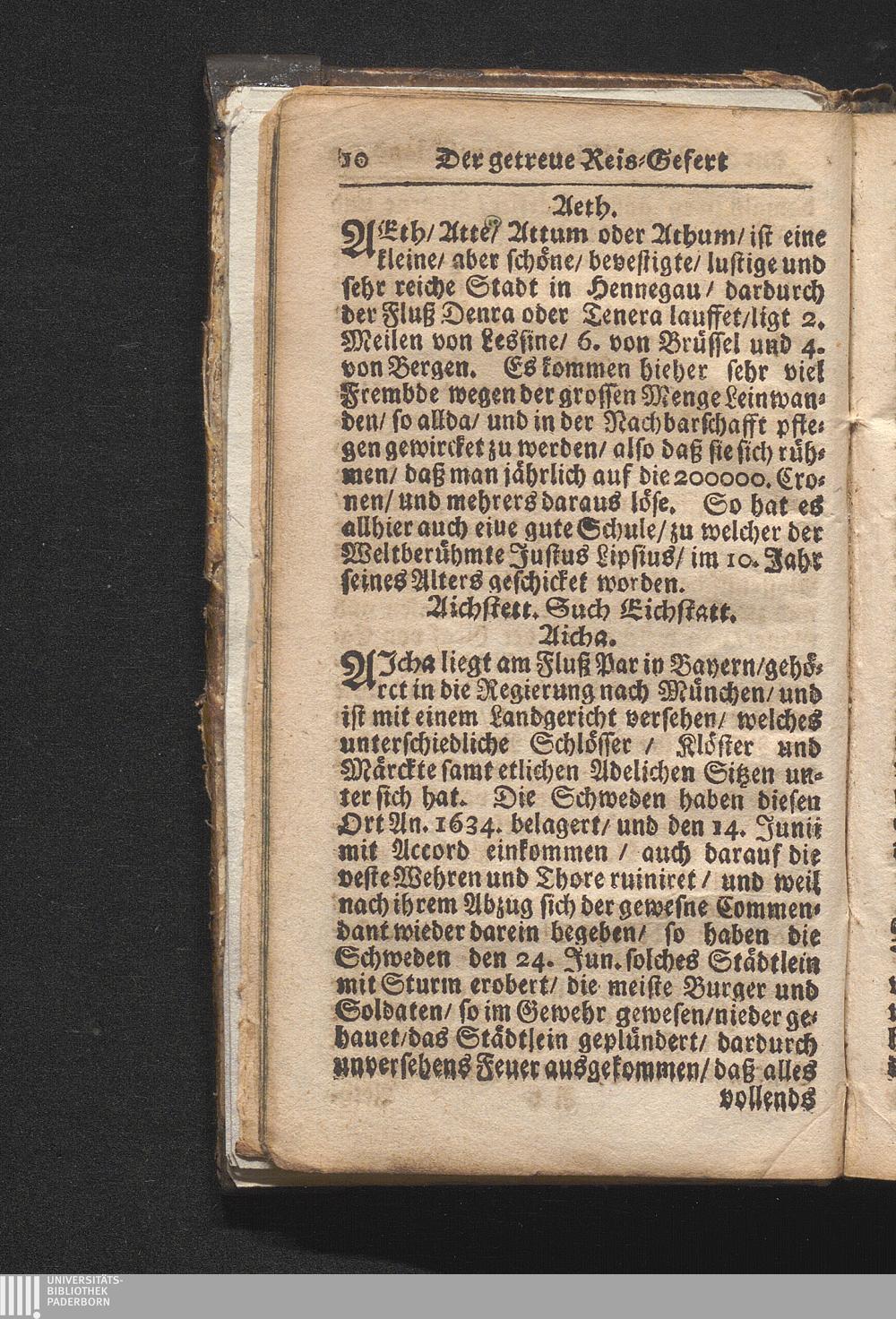 Der getreue Reiß-Gefert durch Ober- und Nieder-Teutschland : Das ist: Grundrichtige und ausführliche Abhandlung derer jenigen Residenzien/ Städte/ Schlösser/ Vestungen/ Städtlein und nahmhafften Markflecken/ welche so wol in Ober- als Nieder-Teutschland/ einem Reisenden sich hin und wieder vorstellig machen und zwar solcher Gestalt/ daß darinn derer Ursprung/ Aufnahm/ Fortification/ Raritäten/ herrliche Gebäue/ und Glück- und Unglücks-Fälle bis auf gegenwärtige Zeit fortgesetzt enthalten. Dabey auch noch über das ein absonderlicher kurz-gefasster Weegweiser angehänget zu finden/ worinnen klärlich zu sehen, wie viel Meilen ein Ort von dem andern entlegen. Alles aus denen bewährtesten Scribenten hervorgesuchet/ zum Nutz-Ergötzen mitgetheilet ...