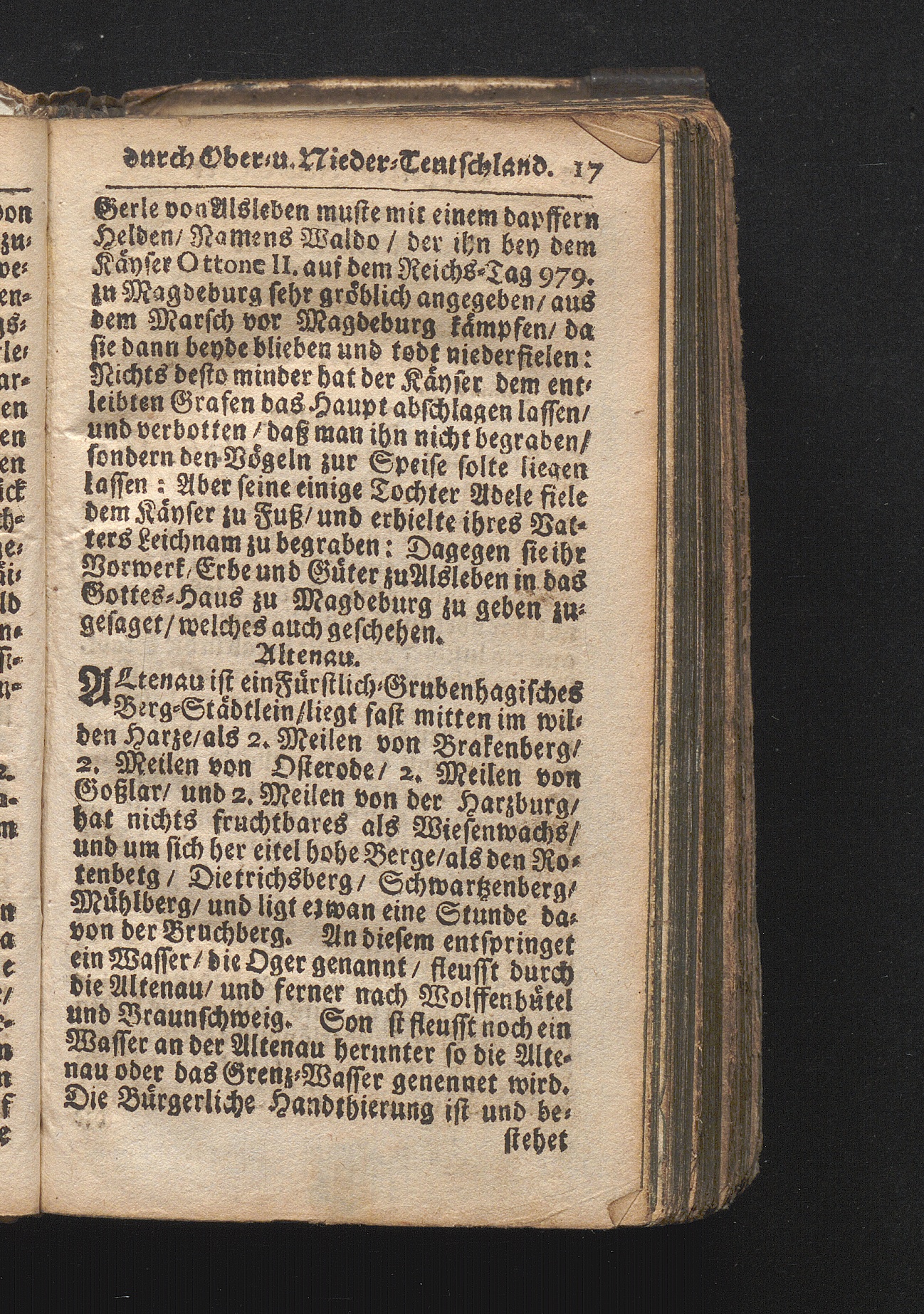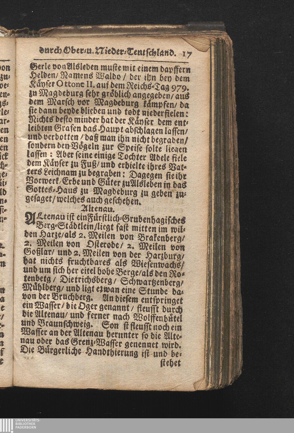 Der getreue Reiß-Gefert durch Ober- und Nieder-Teutschland : Das ist: Grundrichtige und ausführliche Abhandlung derer jenigen Residenzien/ Städte/ Schlösser/ Vestungen/ Städtlein und nahmhafften Markflecken/ welche so wol in Ober- als Nieder-Teutschland/ einem Reisenden sich hin und wieder vorstellig machen und zwar solcher Gestalt/ daß darinn derer Ursprung/ Aufnahm/ Fortification/ Raritäten/ herrliche Gebäue/ und Glück- und Unglücks-Fälle bis auf gegenwärtige Zeit fortgesetzt enthalten. Dabey auch noch über das ein absonderlicher kurz-gefasster Weegweiser angehänget zu finden/ worinnen klärlich zu sehen, wie viel Meilen ein Ort von dem andern entlegen. Alles aus denen bewährtesten Scribenten hervorgesuchet/ zum Nutz-Ergötzen mitgetheilet ...