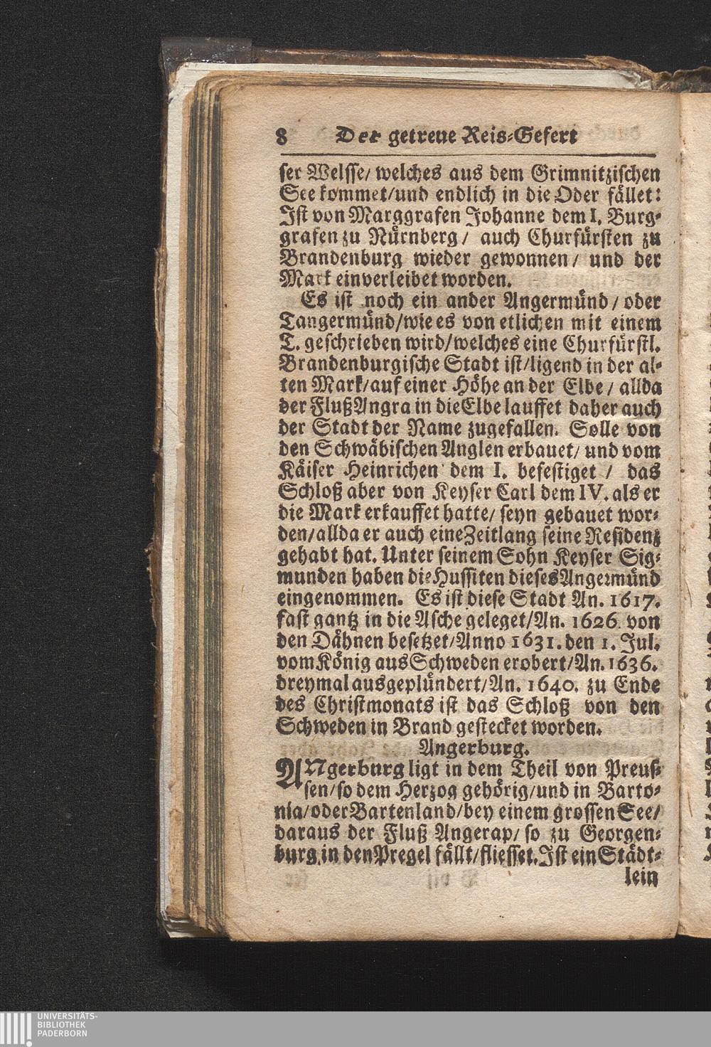 Der getreue Reiß-Gefert durch Ober- und Nieder-Teutschland : Das ist: Grundrichtige und ausführliche Abhandlung derer jenigen Residenzien/ Städte/ Schlösser/ Vestungen/ Städtlein und nahmhafften Markflecken/ welche so wol in Ober- als Nieder-Teutschland/ einem Reisenden sich hin und wieder vorstellig machen und zwar solcher Gestalt/ daß darinn derer Ursprung/ Aufnahm/ Fortification/ Raritäten/ herrliche Gebäue/ und Glück- und Unglücks-Fälle bis auf gegenwärtige Zeit fortgesetzt enthalten. Dabey auch noch über das ein absonderlicher kurz-gefasster Weegweiser angehänget zu finden/ worinnen klärlich zu sehen, wie viel Meilen ein Ort von dem andern entlegen. Alles aus denen bewährtesten Scribenten hervorgesuchet/ zum Nutz-Ergötzen mitgetheilet ...