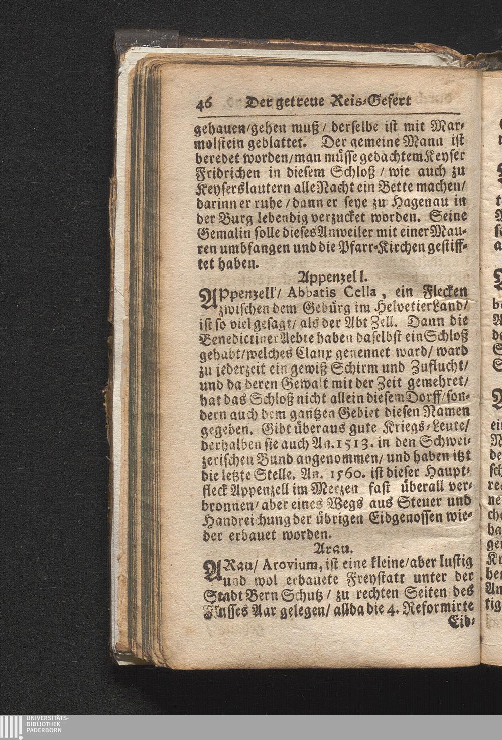 Der getreue Reiß-Gefert durch Ober- und Nieder-Teutschland : Das ist: Grundrichtige und ausführliche Abhandlung derer jenigen Residenzien/ Städte/ Schlösser/ Vestungen/ Städtlein und nahmhafften Markflecken/ welche so wol in Ober- als Nieder-Teutschland/ einem Reisenden sich hin und wieder vorstellig machen und zwar solcher Gestalt/ daß darinn derer Ursprung/ Aufnahm/ Fortification/ Raritäten/ herrliche Gebäue/ und Glück- und Unglücks-Fälle bis auf gegenwärtige Zeit fortgesetzt enthalten. Dabey auch noch über das ein absonderlicher kurz-gefasster Weegweiser angehänget zu finden/ worinnen klärlich zu sehen, wie viel Meilen ein Ort von dem andern entlegen. Alles aus denen bewährtesten Scribenten hervorgesuchet/ zum Nutz-Ergötzen mitgetheilet ...