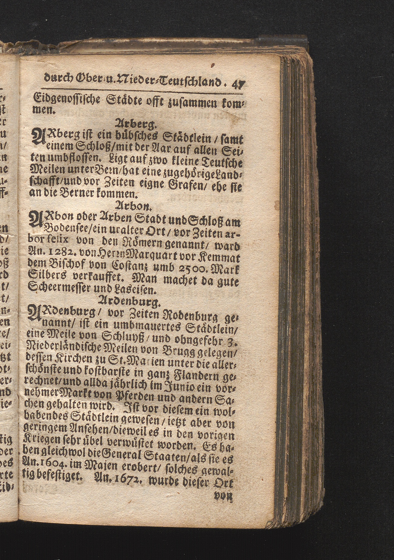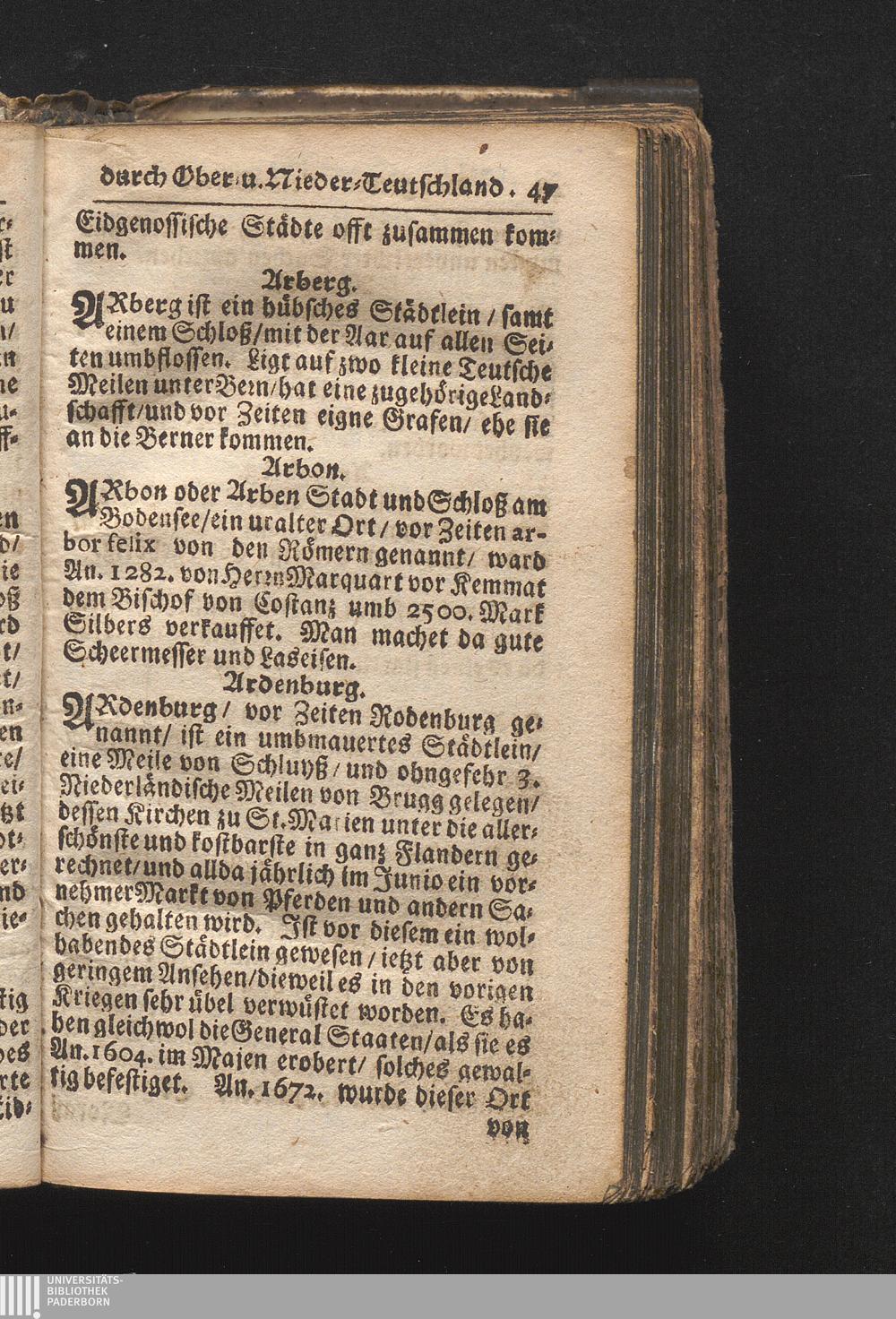Der getreue Reiß-Gefert durch Ober- und Nieder-Teutschland : Das ist: Grundrichtige und ausführliche Abhandlung derer jenigen Residenzien/ Städte/ Schlösser/ Vestungen/ Städtlein und nahmhafften Markflecken/ welche so wol in Ober- als Nieder-Teutschland/ einem Reisenden sich hin und wieder vorstellig machen und zwar solcher Gestalt/ daß darinn derer Ursprung/ Aufnahm/ Fortification/ Raritäten/ herrliche Gebäue/ und Glück- und Unglücks-Fälle bis auf gegenwärtige Zeit fortgesetzt enthalten. Dabey auch noch über das ein absonderlicher kurz-gefasster Weegweiser angehänget zu finden/ worinnen klärlich zu sehen, wie viel Meilen ein Ort von dem andern entlegen. Alles aus denen bewährtesten Scribenten hervorgesuchet/ zum Nutz-Ergötzen mitgetheilet ...