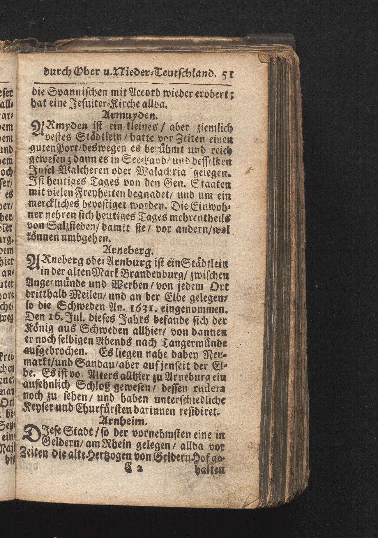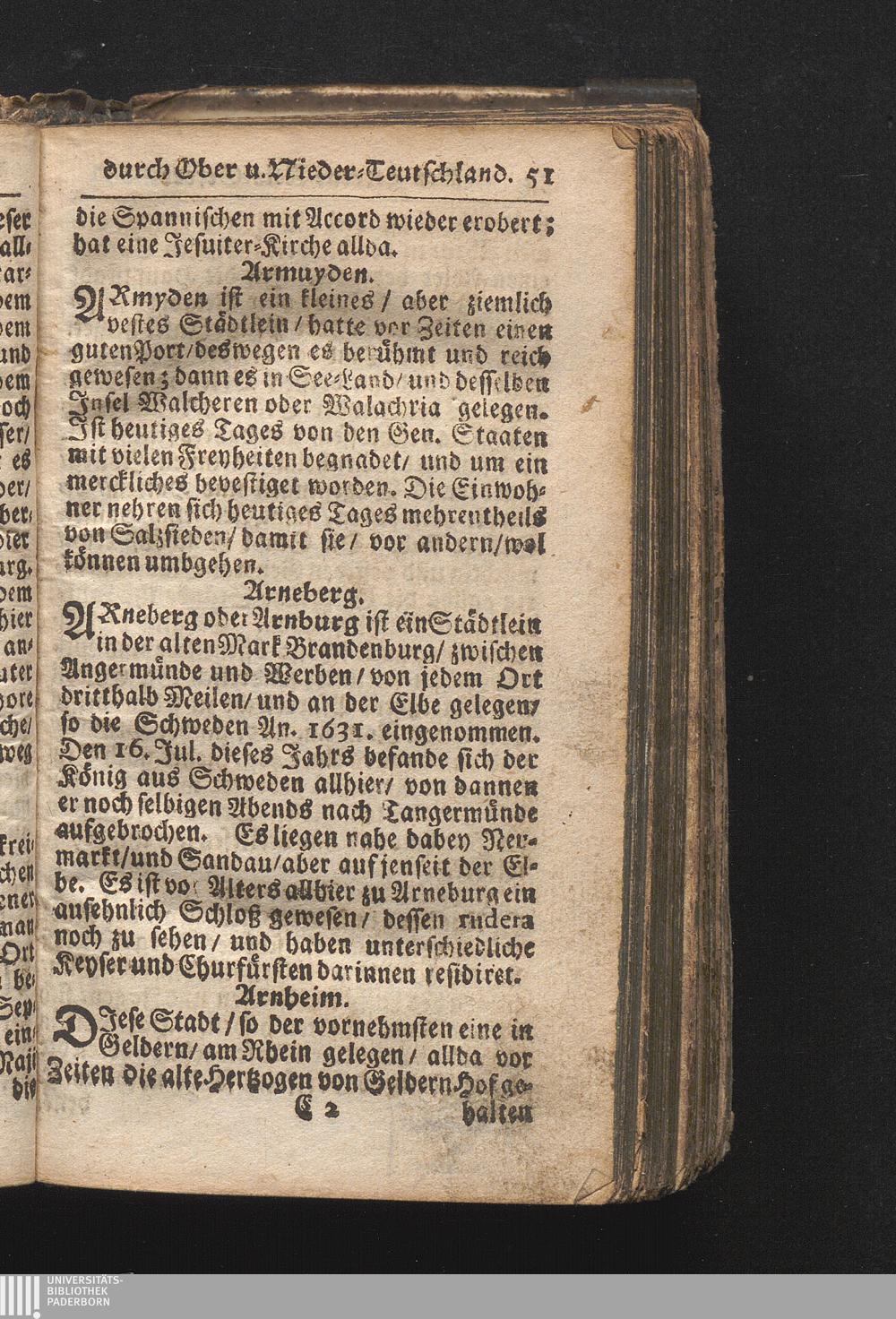 Der getreue Reiß-Gefert durch Ober- und Nieder-Teutschland : Das ist: Grundrichtige und ausführliche Abhandlung derer jenigen Residenzien/ Städte/ Schlösser/ Vestungen/ Städtlein und nahmhafften Markflecken/ welche so wol in Ober- als Nieder-Teutschland/ einem Reisenden sich hin und wieder vorstellig machen und zwar solcher Gestalt/ daß darinn derer Ursprung/ Aufnahm/ Fortification/ Raritäten/ herrliche Gebäue/ und Glück- und Unglücks-Fälle bis auf gegenwärtige Zeit fortgesetzt enthalten. Dabey auch noch über das ein absonderlicher kurz-gefasster Weegweiser angehänget zu finden/ worinnen klärlich zu sehen, wie viel Meilen ein Ort von dem andern entlegen. Alles aus denen bewährtesten Scribenten hervorgesuchet/ zum Nutz-Ergötzen mitgetheilet ...