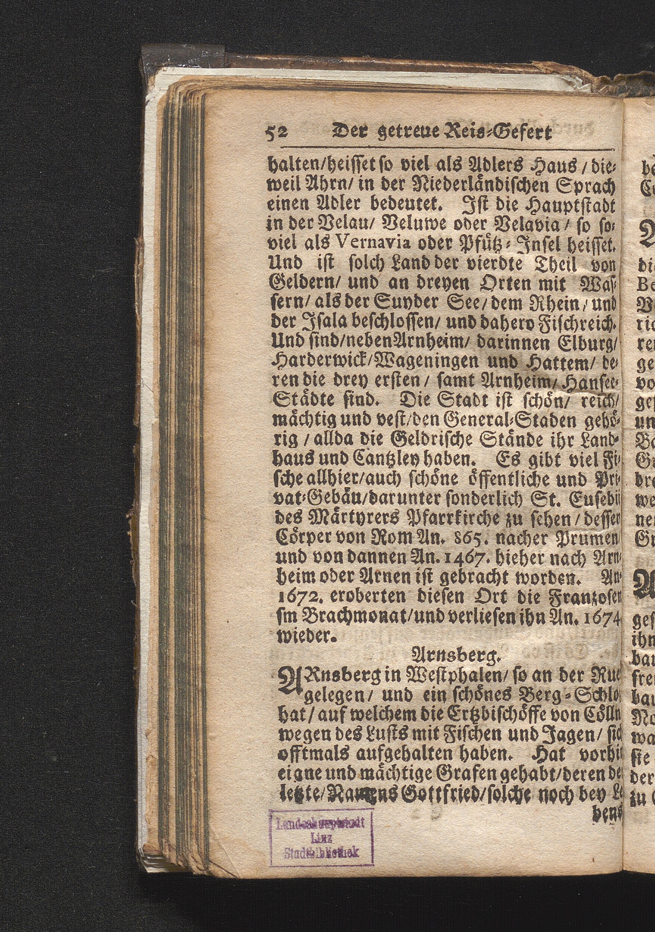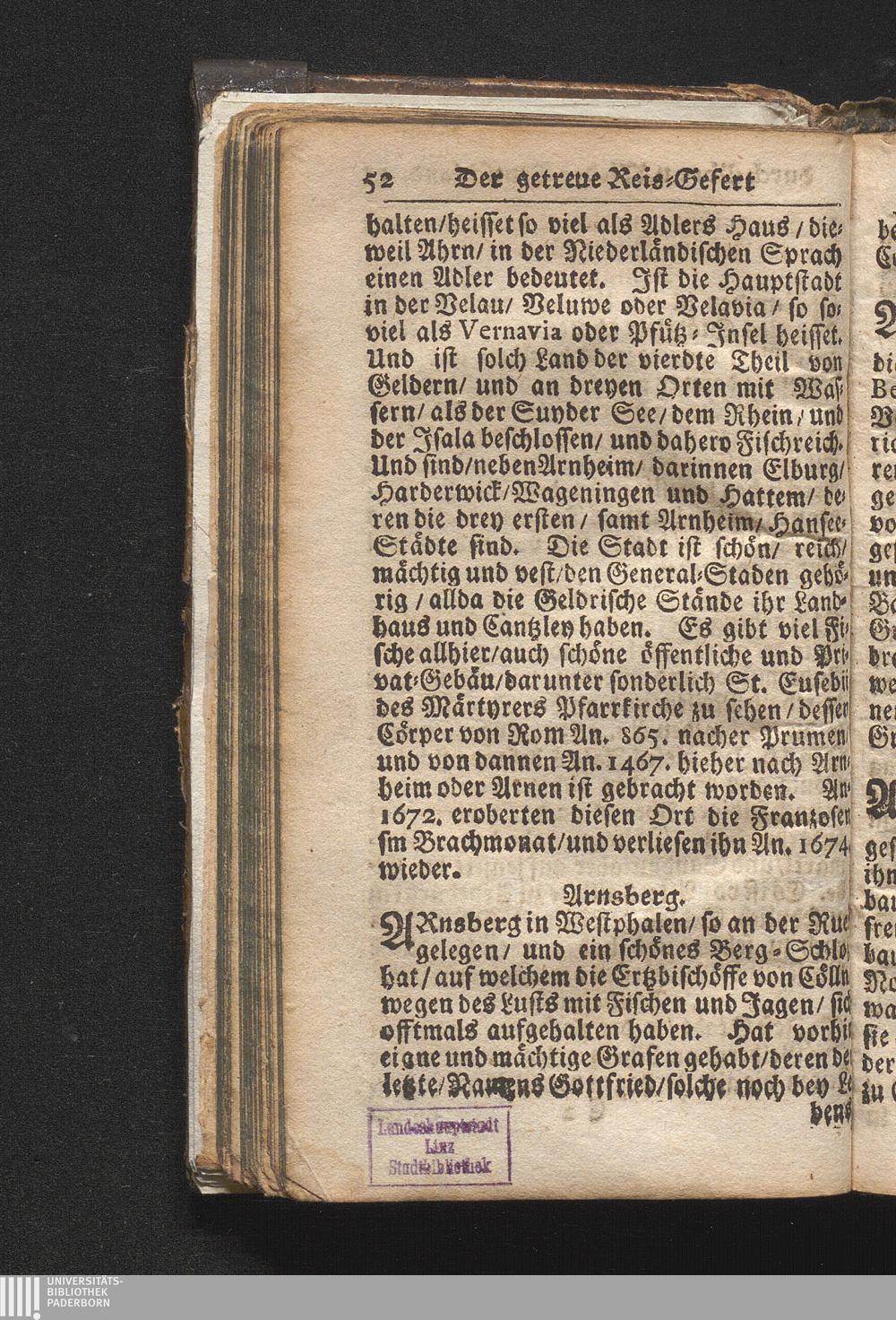 Der getreue Reiß-Gefert durch Ober- und Nieder-Teutschland : Das ist: Grundrichtige und ausführliche Abhandlung derer jenigen Residenzien/ Städte/ Schlösser/ Vestungen/ Städtlein und nahmhafften Markflecken/ welche so wol in Ober- als Nieder-Teutschland/ einem Reisenden sich hin und wieder vorstellig machen und zwar solcher Gestalt/ daß darinn derer Ursprung/ Aufnahm/ Fortification/ Raritäten/ herrliche Gebäue/ und Glück- und Unglücks-Fälle bis auf gegenwärtige Zeit fortgesetzt enthalten. Dabey auch noch über das ein absonderlicher kurz-gefasster Weegweiser angehänget zu finden/ worinnen klärlich zu sehen, wie viel Meilen ein Ort von dem andern entlegen. Alles aus denen bewährtesten Scribenten hervorgesuchet/ zum Nutz-Ergötzen mitgetheilet ...