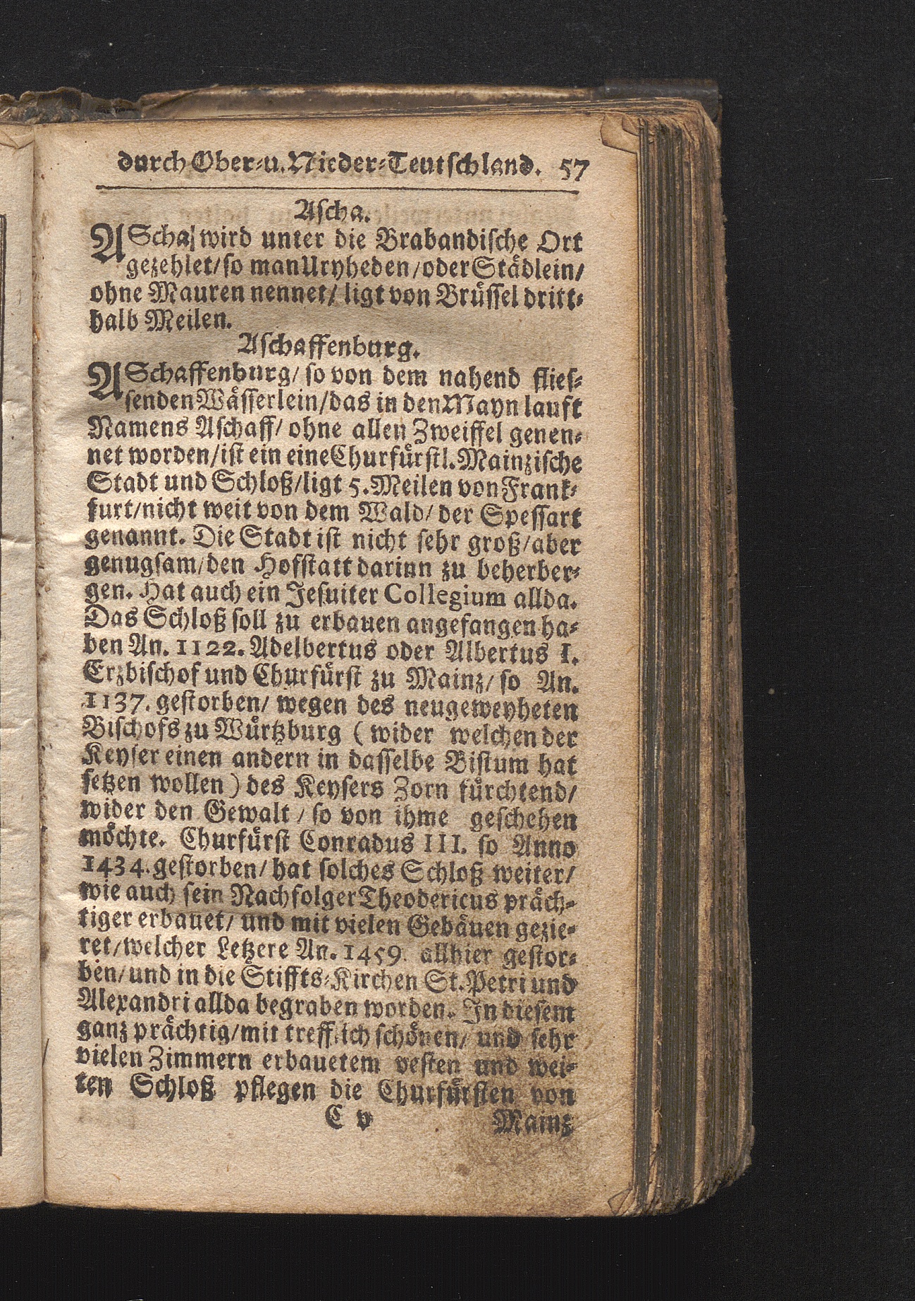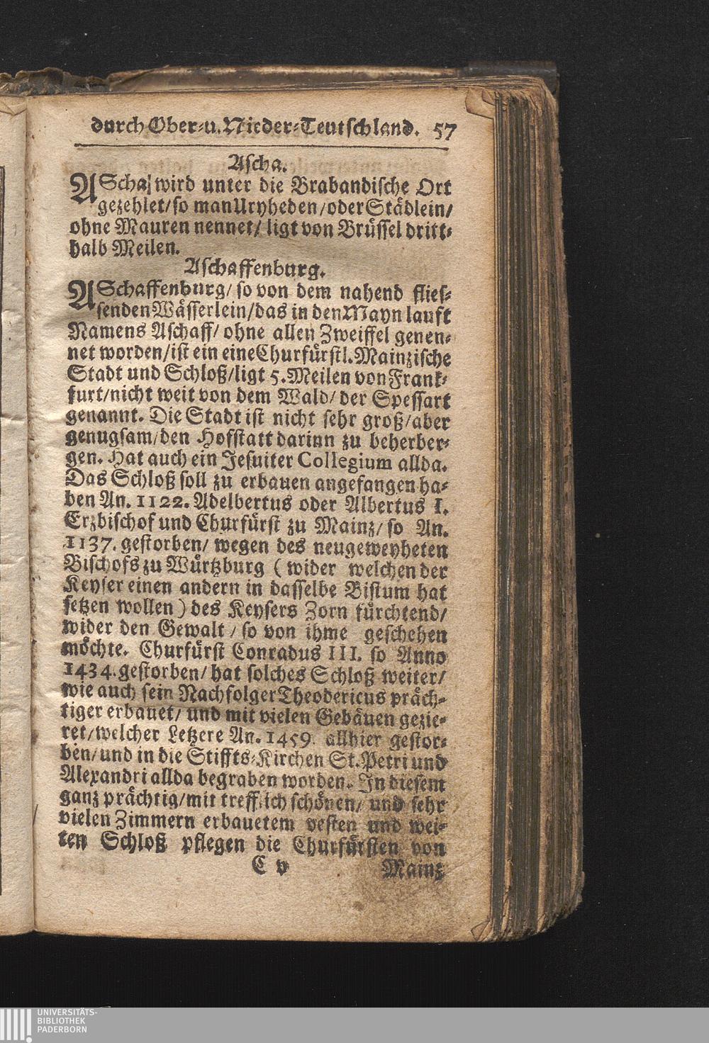 Der getreue Reiß-Gefert durch Ober- und Nieder-Teutschland : Das ist: Grundrichtige und ausführliche Abhandlung derer jenigen Residenzien/ Städte/ Schlösser/ Vestungen/ Städtlein und nahmhafften Markflecken/ welche so wol in Ober- als Nieder-Teutschland/ einem Reisenden sich hin und wieder vorstellig machen und zwar solcher Gestalt/ daß darinn derer Ursprung/ Aufnahm/ Fortification/ Raritäten/ herrliche Gebäue/ und Glück- und Unglücks-Fälle bis auf gegenwärtige Zeit fortgesetzt enthalten. Dabey auch noch über das ein absonderlicher kurz-gefasster Weegweiser angehänget zu finden/ worinnen klärlich zu sehen, wie viel Meilen ein Ort von dem andern entlegen. Alles aus denen bewährtesten Scribenten hervorgesuchet/ zum Nutz-Ergötzen mitgetheilet ...