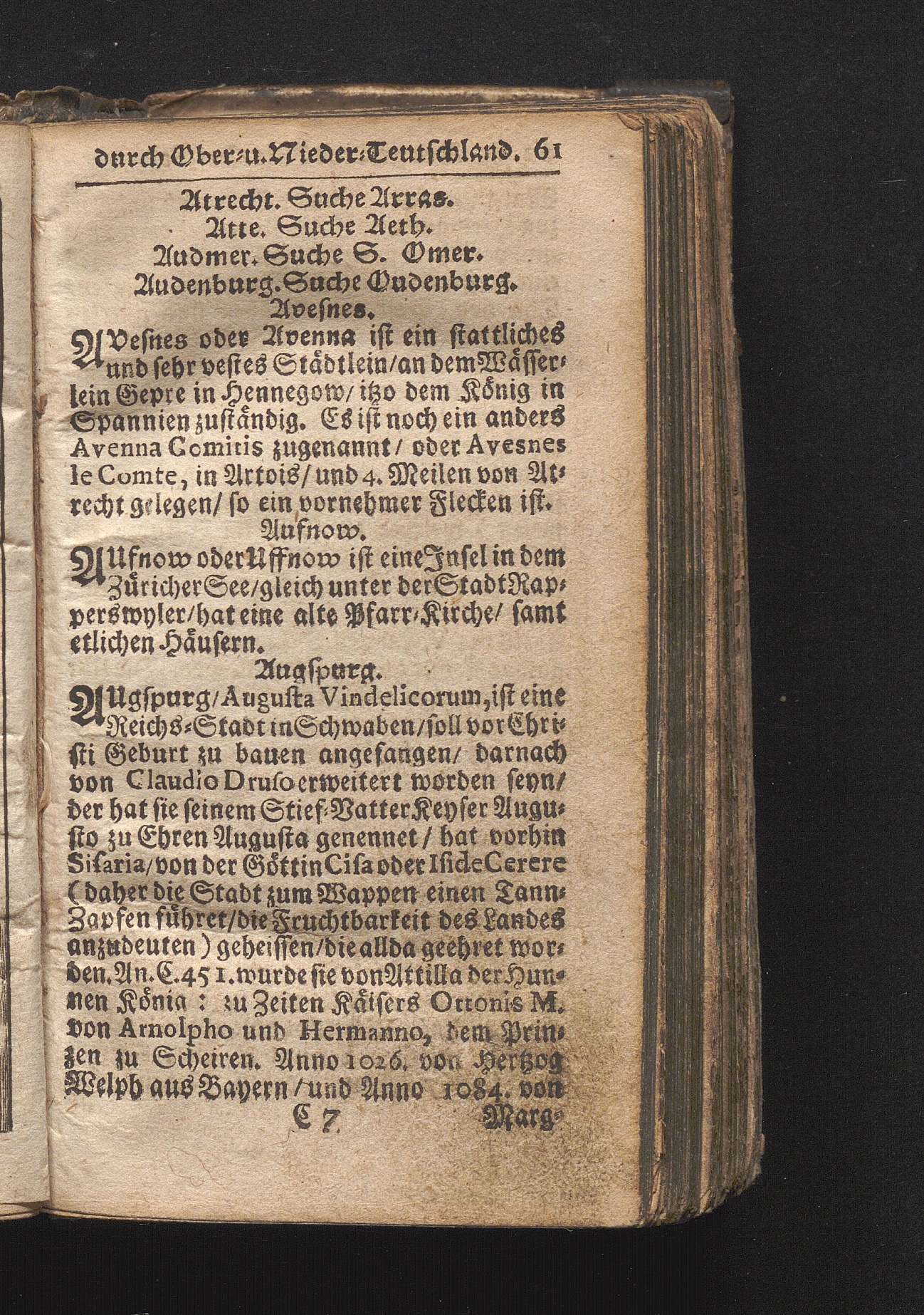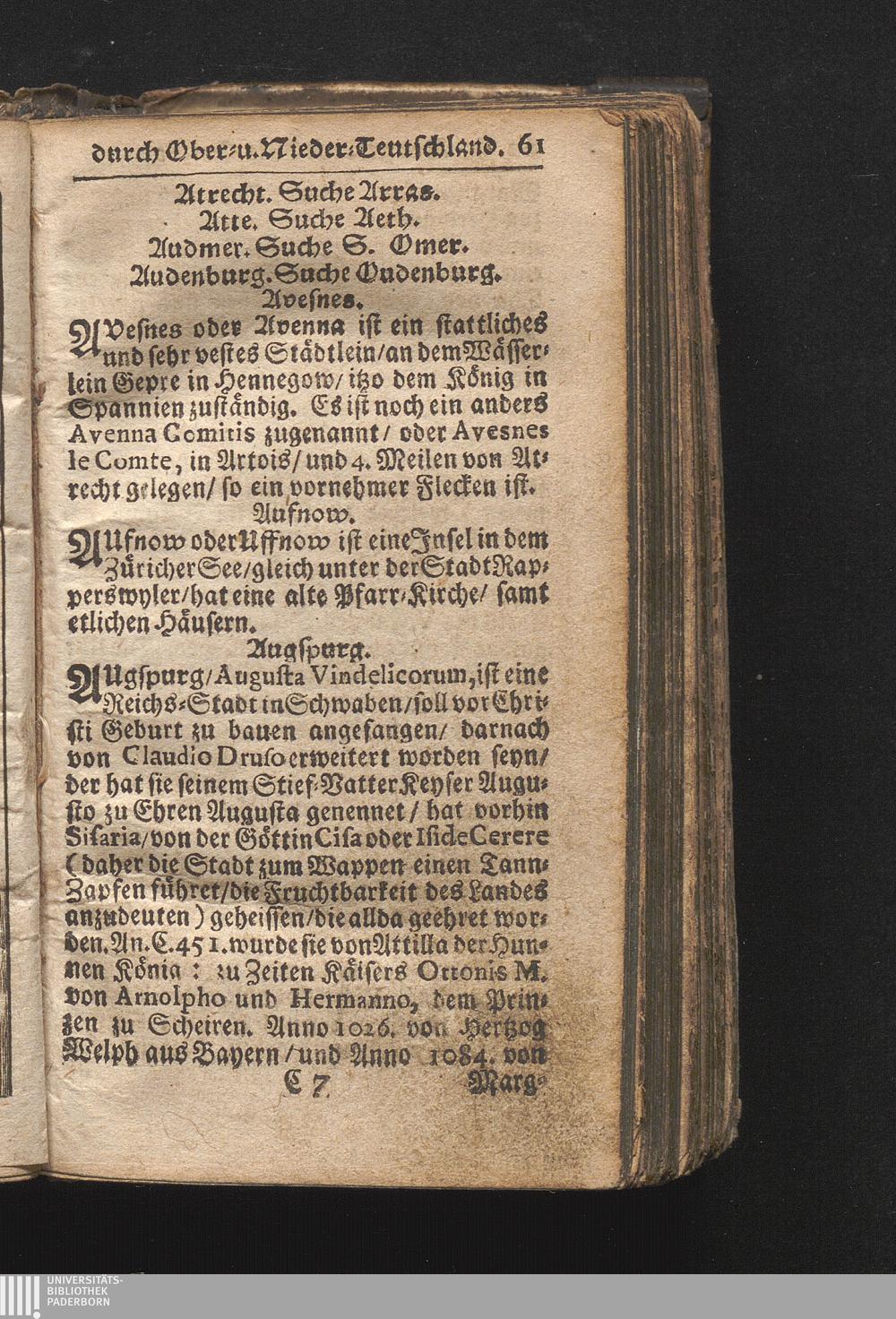 Der getreue Reiß-Gefert durch Ober- und Nieder-Teutschland : Das ist: Grundrichtige und ausführliche Abhandlung derer jenigen Residenzien/ Städte/ Schlösser/ Vestungen/ Städtlein und nahmhafften Markflecken/ welche so wol in Ober- als Nieder-Teutschland/ einem Reisenden sich hin und wieder vorstellig machen und zwar solcher Gestalt/ daß darinn derer Ursprung/ Aufnahm/ Fortification/ Raritäten/ herrliche Gebäue/ und Glück- und Unglücks-Fälle bis auf gegenwärtige Zeit fortgesetzt enthalten. Dabey auch noch über das ein absonderlicher kurz-gefasster Weegweiser angehänget zu finden/ worinnen klärlich zu sehen, wie viel Meilen ein Ort von dem andern entlegen. Alles aus denen bewährtesten Scribenten hervorgesuchet/ zum Nutz-Ergötzen mitgetheilet ...