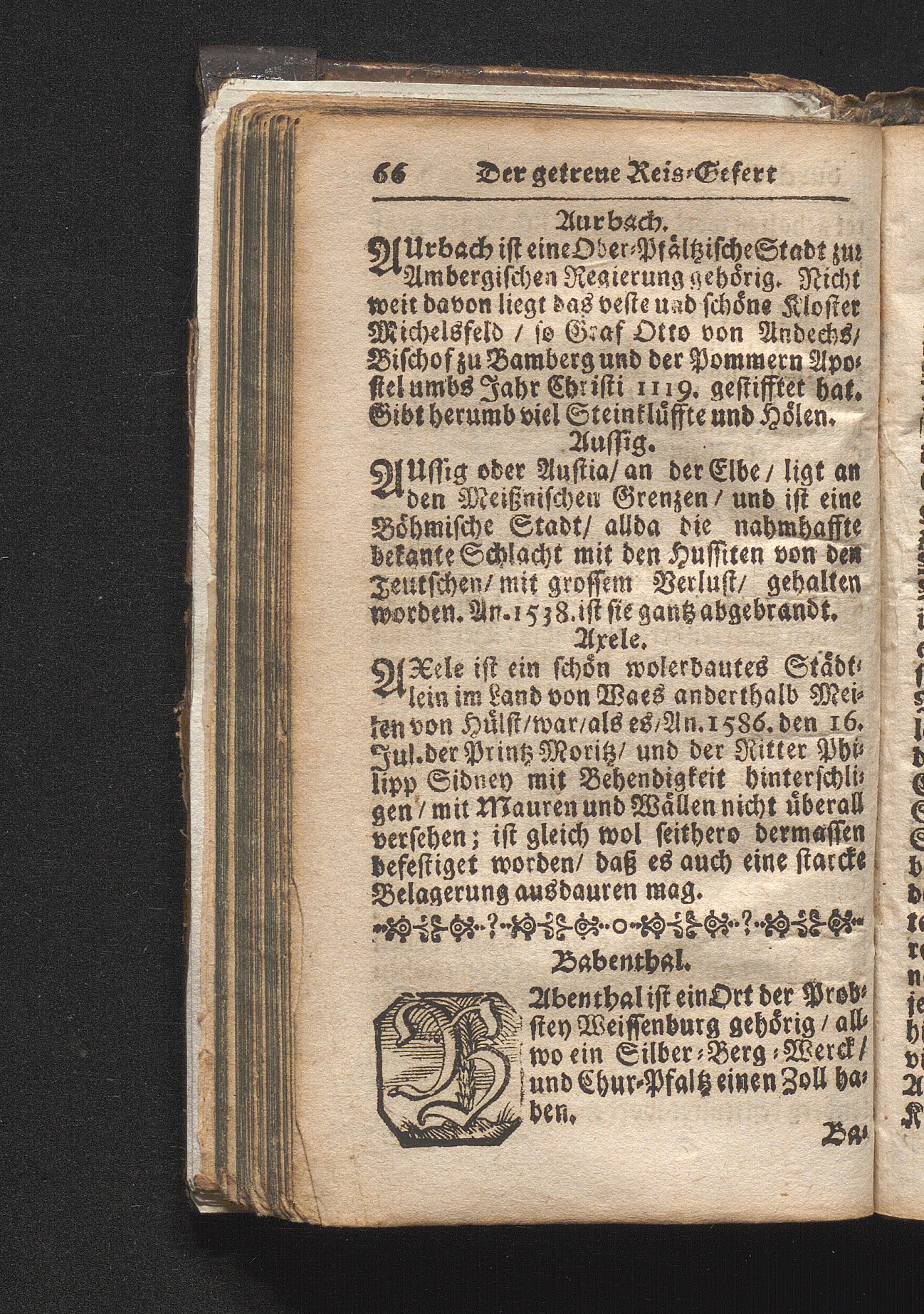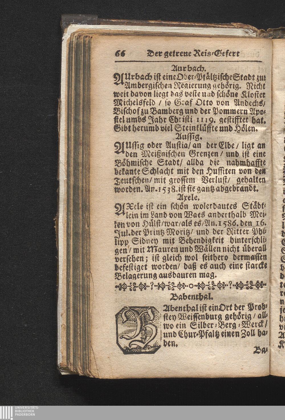 Der getreue Reiß-Gefert durch Ober- und Nieder-Teutschland : Das ist: Grundrichtige und ausführliche Abhandlung derer jenigen Residenzien/ Städte/ Schlösser/ Vestungen/ Städtlein und nahmhafften Markflecken/ welche so wol in Ober- als Nieder-Teutschland/ einem Reisenden sich hin und wieder vorstellig machen und zwar solcher Gestalt/ daß darinn derer Ursprung/ Aufnahm/ Fortification/ Raritäten/ herrliche Gebäue/ und Glück- und Unglücks-Fälle bis auf gegenwärtige Zeit fortgesetzt enthalten. Dabey auch noch über das ein absonderlicher kurz-gefasster Weegweiser angehänget zu finden/ worinnen klärlich zu sehen, wie viel Meilen ein Ort von dem andern entlegen. Alles aus denen bewährtesten Scribenten hervorgesuchet/ zum Nutz-Ergötzen mitgetheilet ...