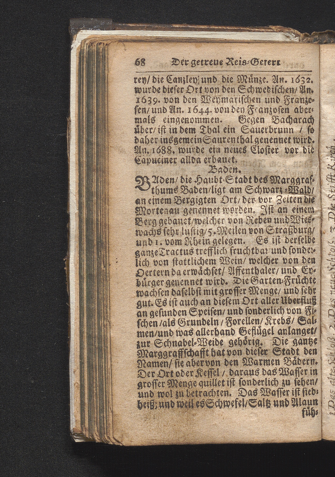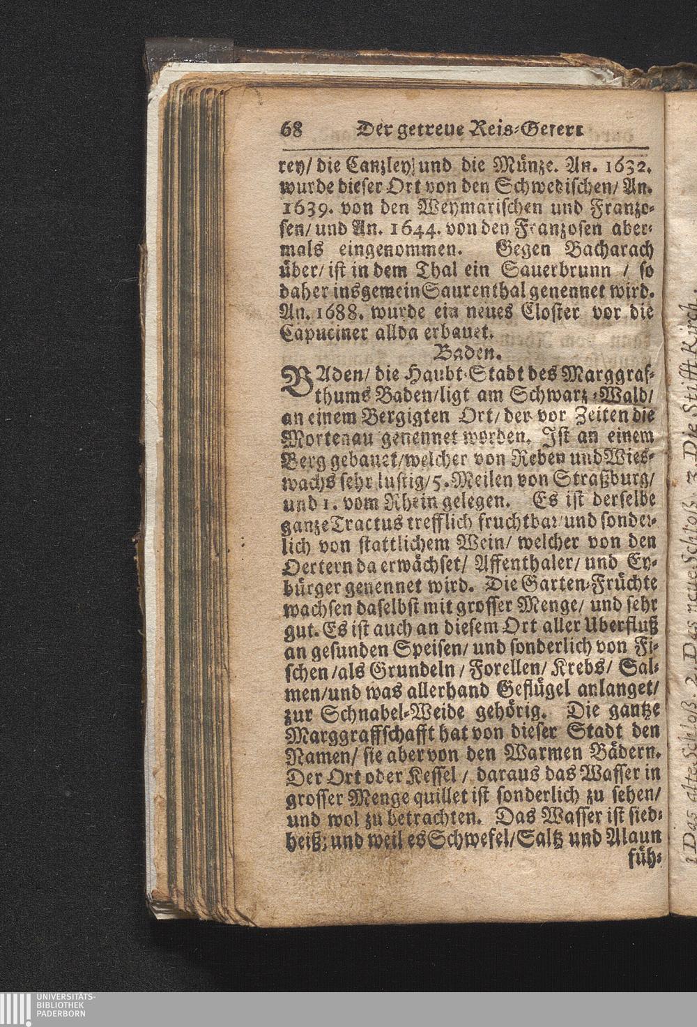 Der getreue Reiß-Gefert durch Ober- und Nieder-Teutschland : Das ist: Grundrichtige und ausführliche Abhandlung derer jenigen Residenzien/ Städte/ Schlösser/ Vestungen/ Städtlein und nahmhafften Markflecken/ welche so wol in Ober- als Nieder-Teutschland/ einem Reisenden sich hin und wieder vorstellig machen und zwar solcher Gestalt/ daß darinn derer Ursprung/ Aufnahm/ Fortification/ Raritäten/ herrliche Gebäue/ und Glück- und Unglücks-Fälle bis auf gegenwärtige Zeit fortgesetzt enthalten. Dabey auch noch über das ein absonderlicher kurz-gefasster Weegweiser angehänget zu finden/ worinnen klärlich zu sehen, wie viel Meilen ein Ort von dem andern entlegen. Alles aus denen bewährtesten Scribenten hervorgesuchet/ zum Nutz-Ergötzen mitgetheilet ...