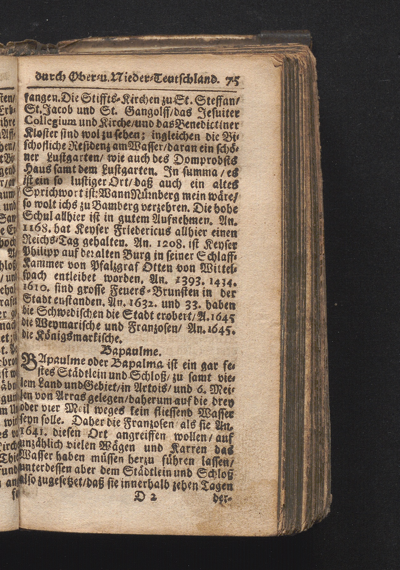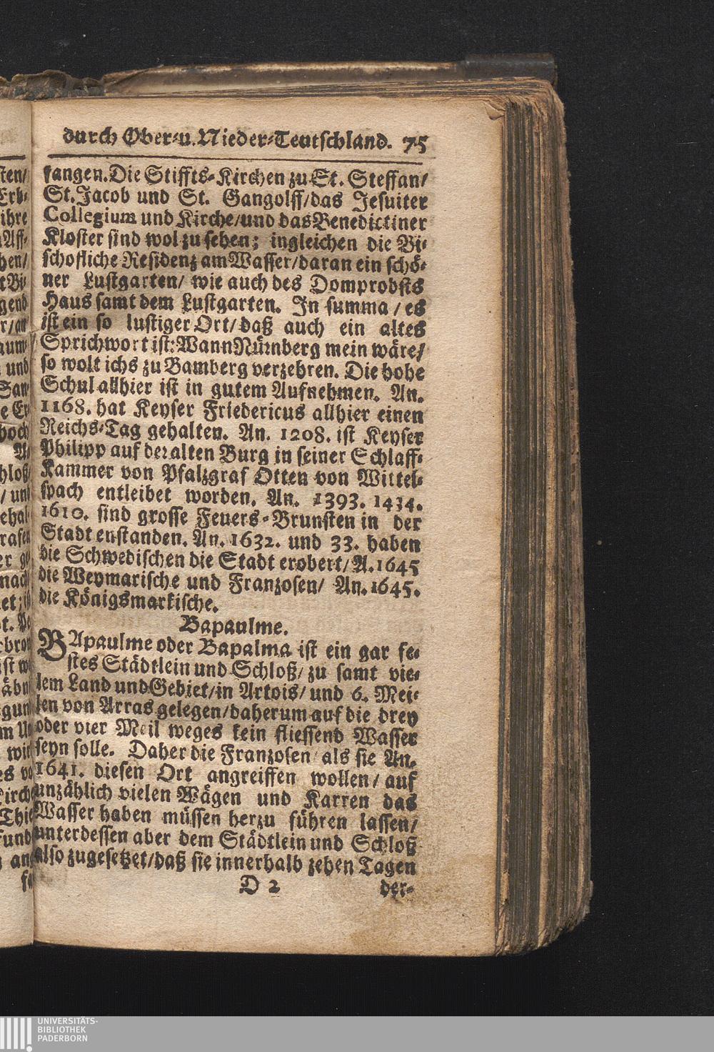 Der getreue Reiß-Gefert durch Ober- und Nieder-Teutschland : Das ist: Grundrichtige und ausführliche Abhandlung derer jenigen Residenzien/ Städte/ Schlösser/ Vestungen/ Städtlein und nahmhafften Markflecken/ welche so wol in Ober- als Nieder-Teutschland/ einem Reisenden sich hin und wieder vorstellig machen und zwar solcher Gestalt/ daß darinn derer Ursprung/ Aufnahm/ Fortification/ Raritäten/ herrliche Gebäue/ und Glück- und Unglücks-Fälle bis auf gegenwärtige Zeit fortgesetzt enthalten. Dabey auch noch über das ein absonderlicher kurz-gefasster Weegweiser angehänget zu finden/ worinnen klärlich zu sehen, wie viel Meilen ein Ort von dem andern entlegen. Alles aus denen bewährtesten Scribenten hervorgesuchet/ zum Nutz-Ergötzen mitgetheilet ...