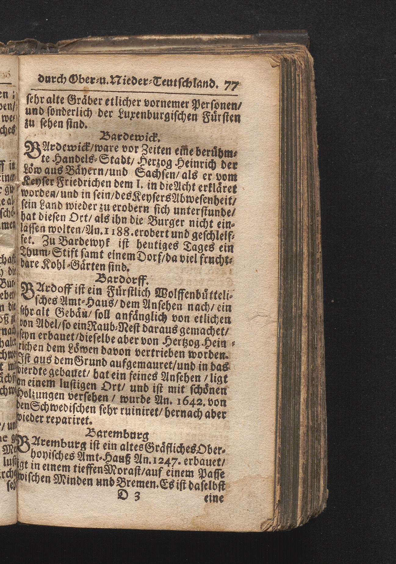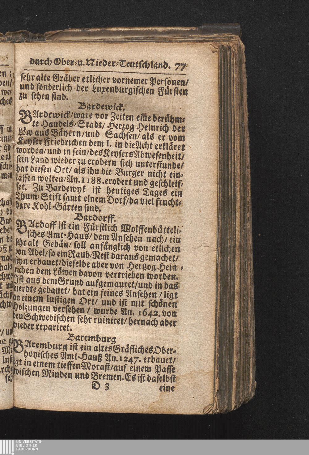 Der getreue Reiß-Gefert durch Ober- und Nieder-Teutschland : Das ist: Grundrichtige und ausführliche Abhandlung derer jenigen Residenzien/ Städte/ Schlösser/ Vestungen/ Städtlein und nahmhafften Markflecken/ welche so wol in Ober- als Nieder-Teutschland/ einem Reisenden sich hin und wieder vorstellig machen und zwar solcher Gestalt/ daß darinn derer Ursprung/ Aufnahm/ Fortification/ Raritäten/ herrliche Gebäue/ und Glück- und Unglücks-Fälle bis auf gegenwärtige Zeit fortgesetzt enthalten. Dabey auch noch über das ein absonderlicher kurz-gefasster Weegweiser angehänget zu finden/ worinnen klärlich zu sehen, wie viel Meilen ein Ort von dem andern entlegen. Alles aus denen bewährtesten Scribenten hervorgesuchet/ zum Nutz-Ergötzen mitgetheilet ...
