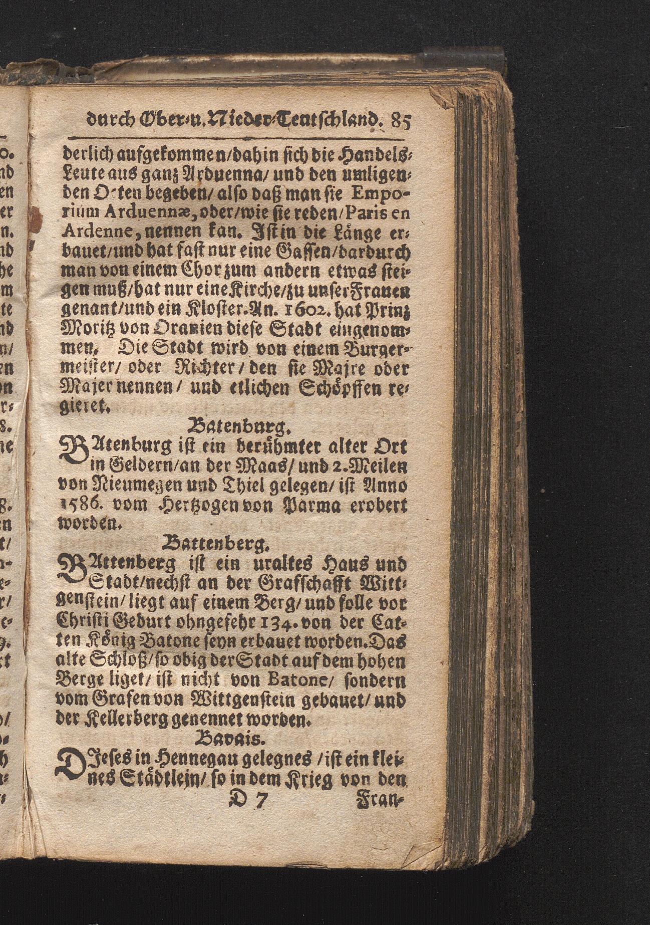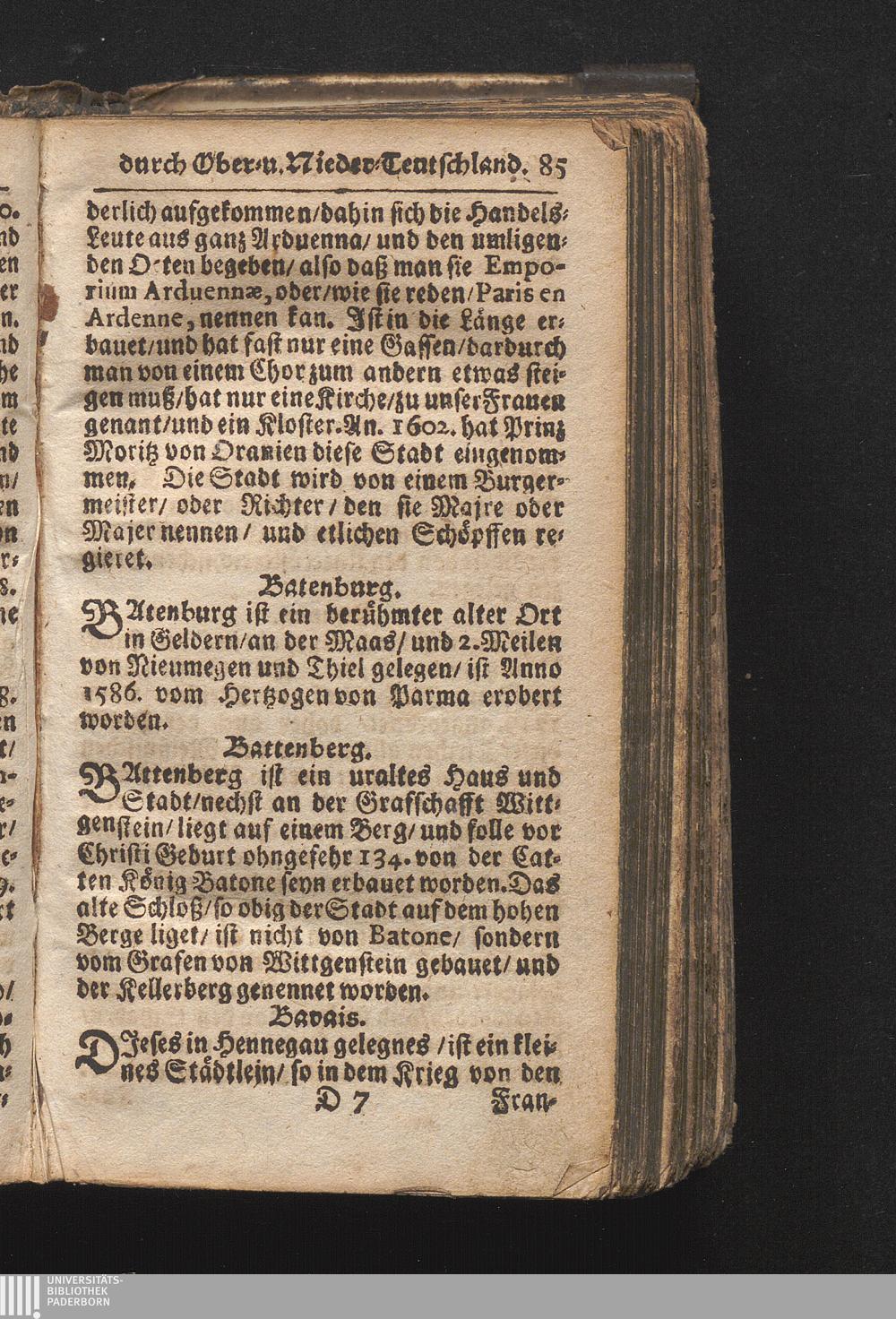 Der getreue Reiß-Gefert durch Ober- und Nieder-Teutschland : Das ist: Grundrichtige und ausführliche Abhandlung derer jenigen Residenzien/ Städte/ Schlösser/ Vestungen/ Städtlein und nahmhafften Markflecken/ welche so wol in Ober- als Nieder-Teutschland/ einem Reisenden sich hin und wieder vorstellig machen und zwar solcher Gestalt/ daß darinn derer Ursprung/ Aufnahm/ Fortification/ Raritäten/ herrliche Gebäue/ und Glück- und Unglücks-Fälle bis auf gegenwärtige Zeit fortgesetzt enthalten. Dabey auch noch über das ein absonderlicher kurz-gefasster Weegweiser angehänget zu finden/ worinnen klärlich zu sehen, wie viel Meilen ein Ort von dem andern entlegen. Alles aus denen bewährtesten Scribenten hervorgesuchet/ zum Nutz-Ergötzen mitgetheilet ...