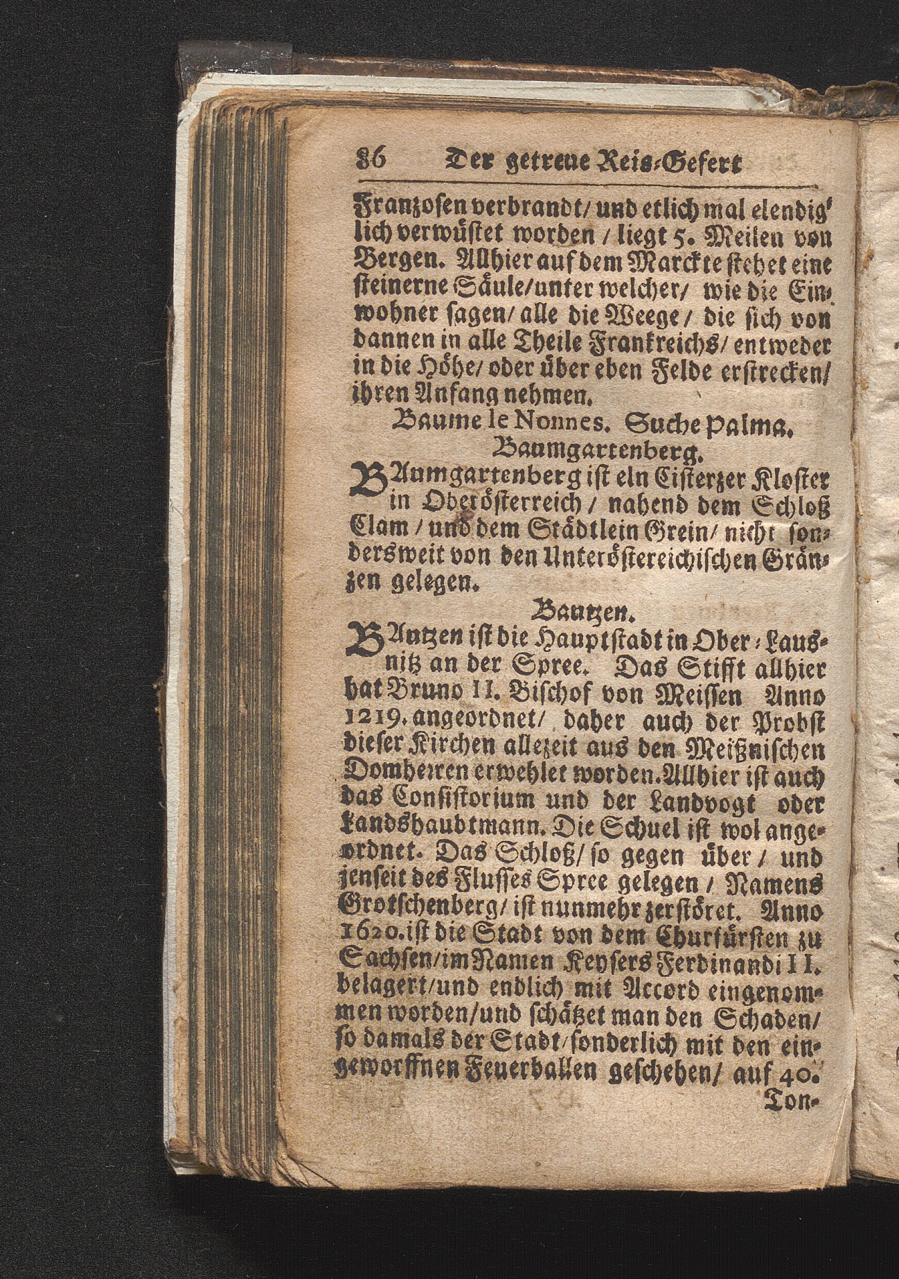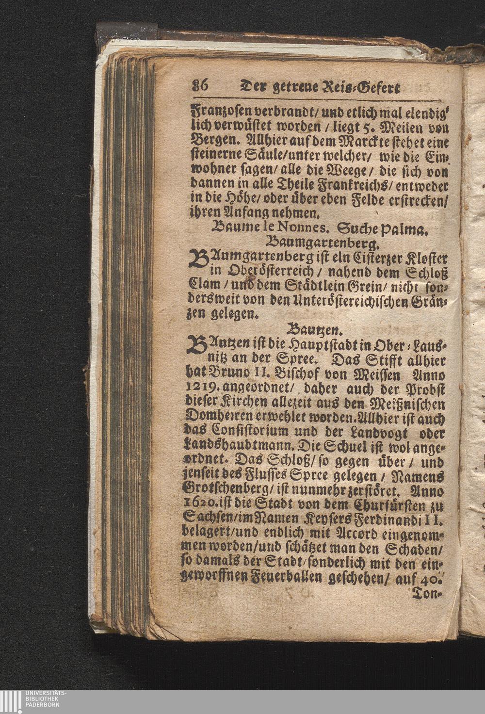 Der getreue Reiß-Gefert durch Ober- und Nieder-Teutschland : Das ist: Grundrichtige und ausführliche Abhandlung derer jenigen Residenzien/ Städte/ Schlösser/ Vestungen/ Städtlein und nahmhafften Markflecken/ welche so wol in Ober- als Nieder-Teutschland/ einem Reisenden sich hin und wieder vorstellig machen und zwar solcher Gestalt/ daß darinn derer Ursprung/ Aufnahm/ Fortification/ Raritäten/ herrliche Gebäue/ und Glück- und Unglücks-Fälle bis auf gegenwärtige Zeit fortgesetzt enthalten. Dabey auch noch über das ein absonderlicher kurz-gefasster Weegweiser angehänget zu finden/ worinnen klärlich zu sehen, wie viel Meilen ein Ort von dem andern entlegen. Alles aus denen bewährtesten Scribenten hervorgesuchet/ zum Nutz-Ergötzen mitgetheilet ...