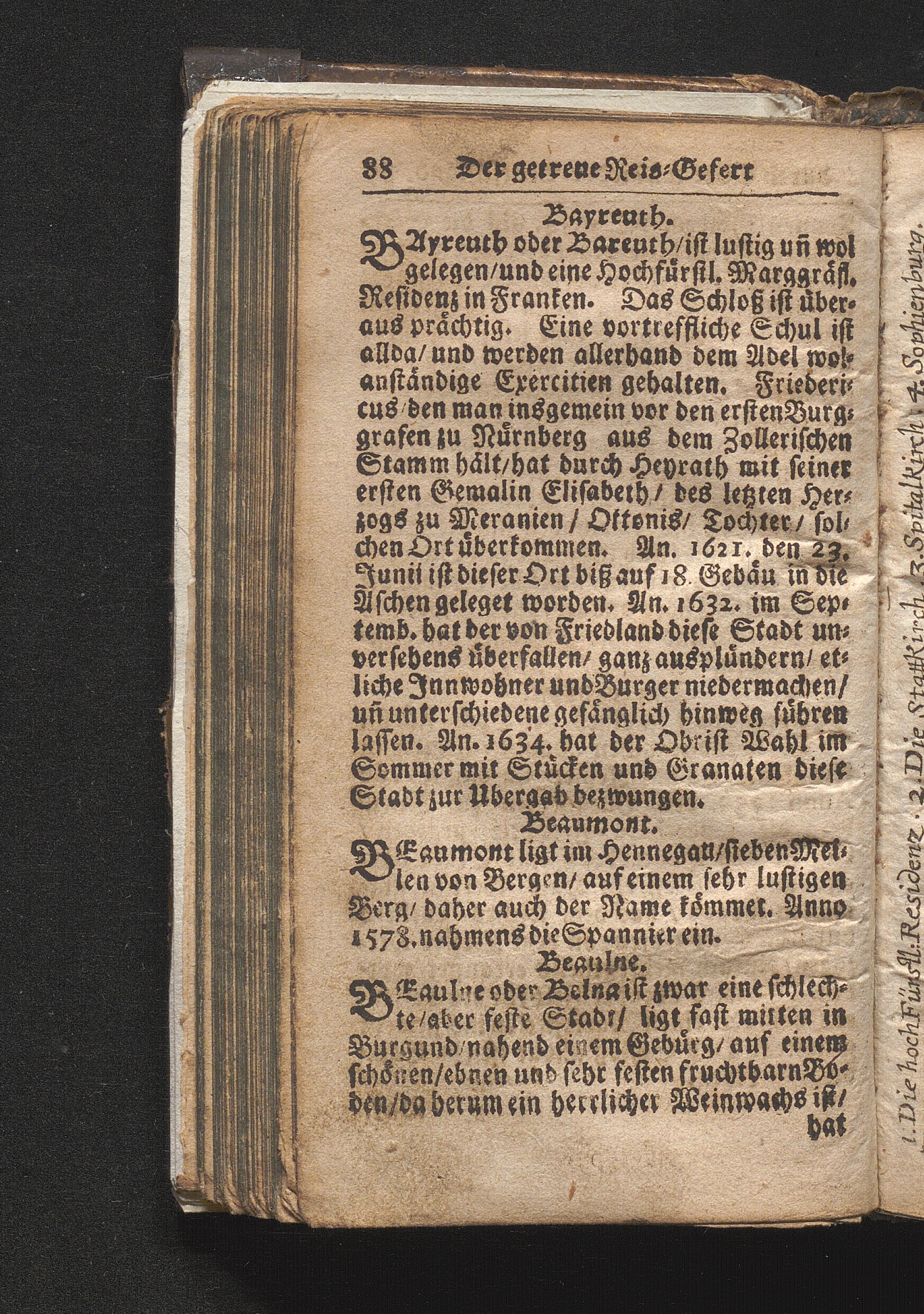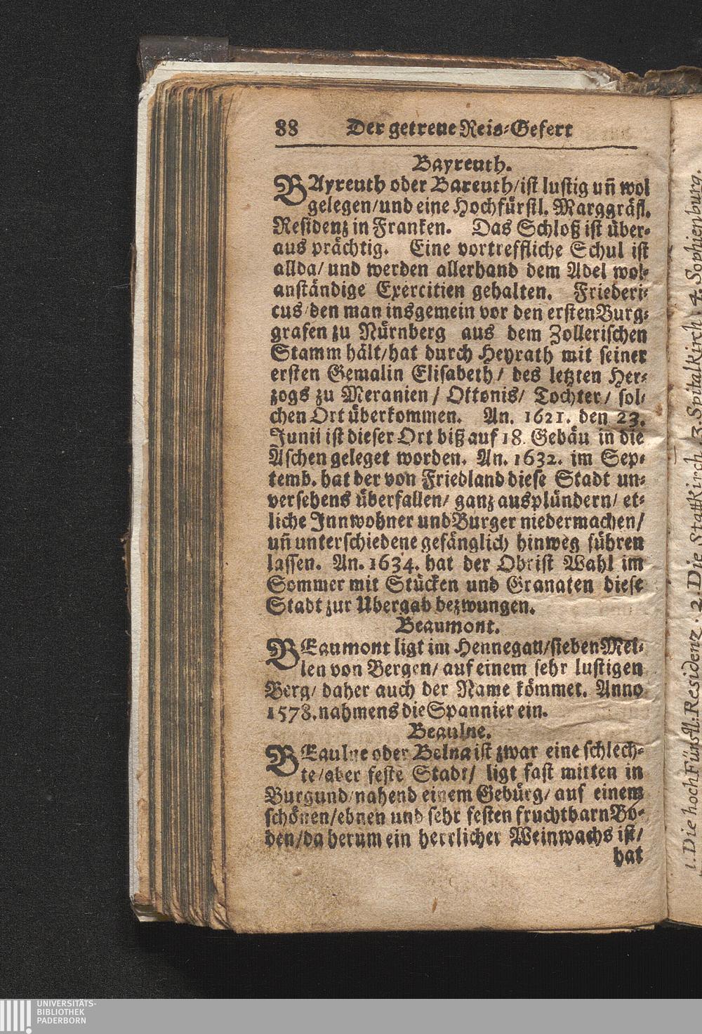 Der getreue Reiß-Gefert durch Ober- und Nieder-Teutschland : Das ist: Grundrichtige und ausführliche Abhandlung derer jenigen Residenzien/ Städte/ Schlösser/ Vestungen/ Städtlein und nahmhafften Markflecken/ welche so wol in Ober- als Nieder-Teutschland/ einem Reisenden sich hin und wieder vorstellig machen und zwar solcher Gestalt/ daß darinn derer Ursprung/ Aufnahm/ Fortification/ Raritäten/ herrliche Gebäue/ und Glück- und Unglücks-Fälle bis auf gegenwärtige Zeit fortgesetzt enthalten. Dabey auch noch über das ein absonderlicher kurz-gefasster Weegweiser angehänget zu finden/ worinnen klärlich zu sehen, wie viel Meilen ein Ort von dem andern entlegen. Alles aus denen bewährtesten Scribenten hervorgesuchet/ zum Nutz-Ergötzen mitgetheilet ...