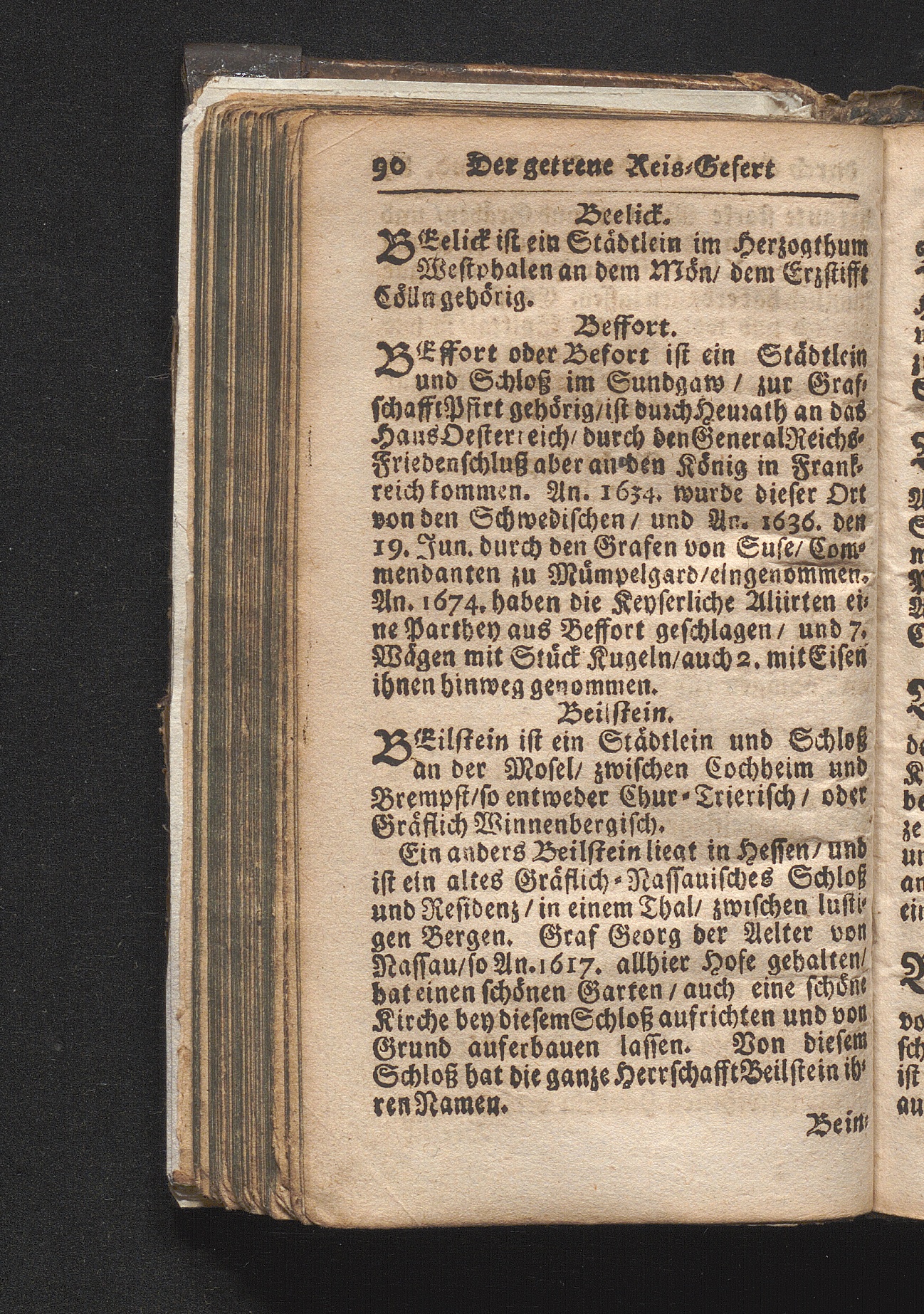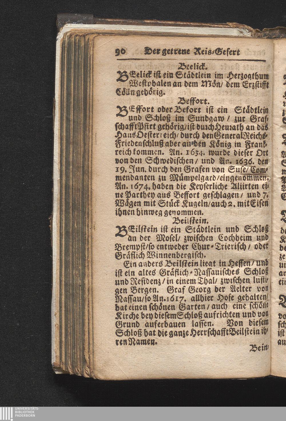 Der getreue Reiß-Gefert durch Ober- und Nieder-Teutschland : Das ist: Grundrichtige und ausführliche Abhandlung derer jenigen Residenzien/ Städte/ Schlösser/ Vestungen/ Städtlein und nahmhafften Markflecken/ welche so wol in Ober- als Nieder-Teutschland/ einem Reisenden sich hin und wieder vorstellig machen und zwar solcher Gestalt/ daß darinn derer Ursprung/ Aufnahm/ Fortification/ Raritäten/ herrliche Gebäue/ und Glück- und Unglücks-Fälle bis auf gegenwärtige Zeit fortgesetzt enthalten. Dabey auch noch über das ein absonderlicher kurz-gefasster Weegweiser angehänget zu finden/ worinnen klärlich zu sehen, wie viel Meilen ein Ort von dem andern entlegen. Alles aus denen bewährtesten Scribenten hervorgesuchet/ zum Nutz-Ergötzen mitgetheilet ...
