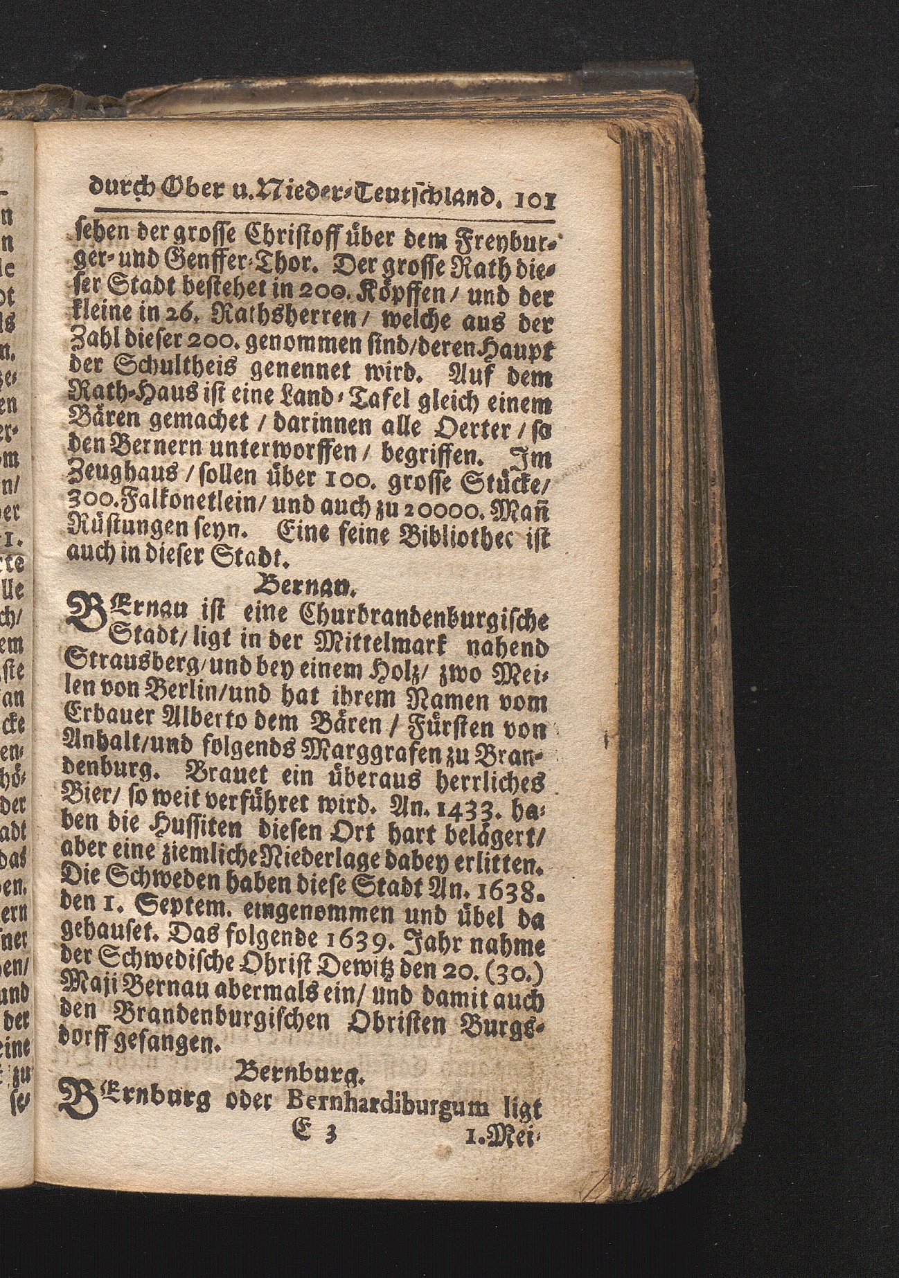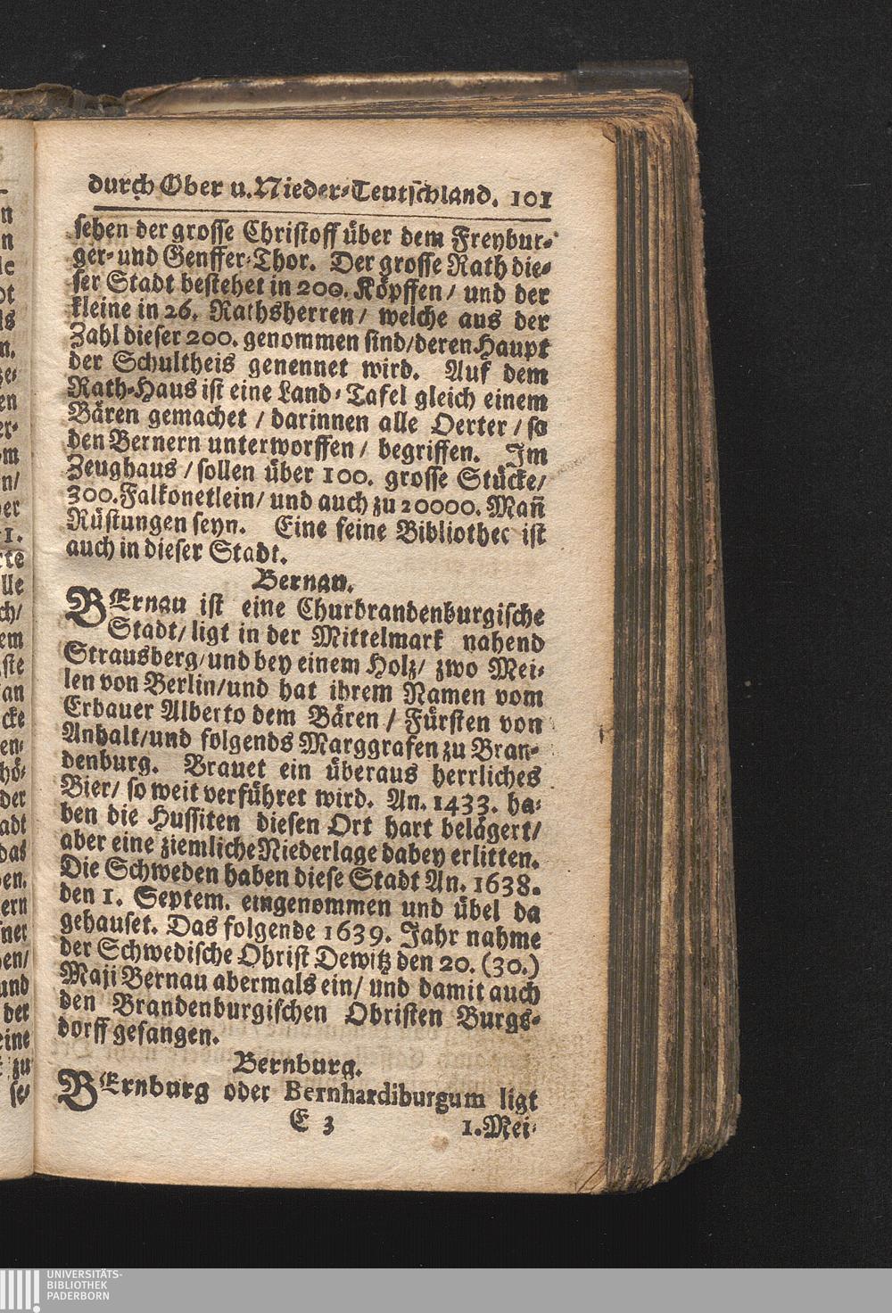 Der getreue Reiß-Gefert durch Ober- und Nieder-Teutschland : Das ist: Grundrichtige und ausführliche Abhandlung derer jenigen Residenzien/ Städte/ Schlösser/ Vestungen/ Städtlein und nahmhafften Markflecken/ welche so wol in Ober- als Nieder-Teutschland/ einem Reisenden sich hin und wieder vorstellig machen und zwar solcher Gestalt/ daß darinn derer Ursprung/ Aufnahm/ Fortification/ Raritäten/ herrliche Gebäue/ und Glück- und Unglücks-Fälle bis auf gegenwärtige Zeit fortgesetzt enthalten. Dabey auch noch über das ein absonderlicher kurz-gefasster Weegweiser angehänget zu finden/ worinnen klärlich zu sehen, wie viel Meilen ein Ort von dem andern entlegen. Alles aus denen bewährtesten Scribenten hervorgesuchet/ zum Nutz-Ergötzen mitgetheilet ...