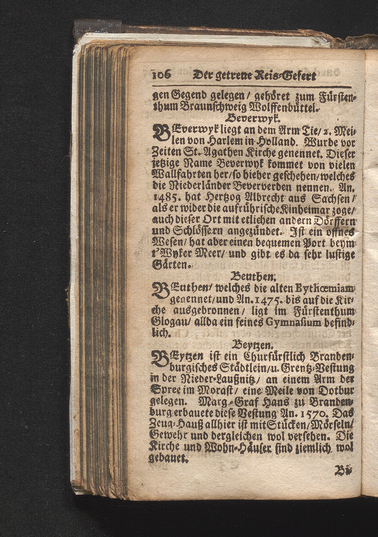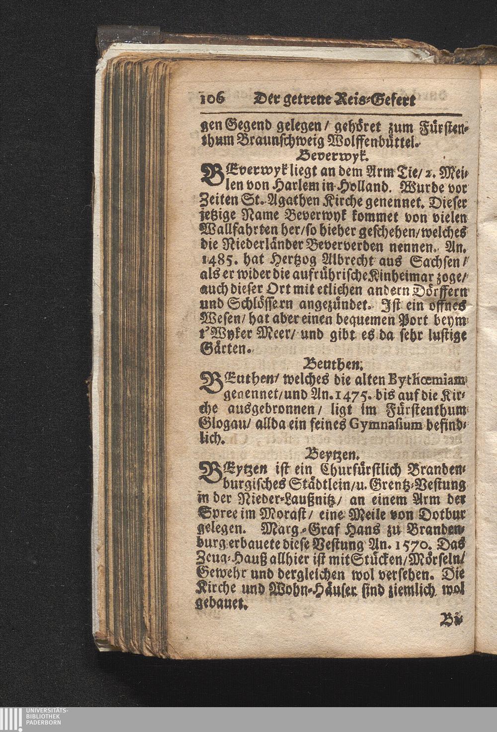 Der getreue Reiß-Gefert durch Ober- und Nieder-Teutschland : Das ist: Grundrichtige und ausführliche Abhandlung derer jenigen Residenzien/ Städte/ Schlösser/ Vestungen/ Städtlein und nahmhafften Markflecken/ welche so wol in Ober- als Nieder-Teutschland/ einem Reisenden sich hin und wieder vorstellig machen und zwar solcher Gestalt/ daß darinn derer Ursprung/ Aufnahm/ Fortification/ Raritäten/ herrliche Gebäue/ und Glück- und Unglücks-Fälle bis auf gegenwärtige Zeit fortgesetzt enthalten. Dabey auch noch über das ein absonderlicher kurz-gefasster Weegweiser angehänget zu finden/ worinnen klärlich zu sehen, wie viel Meilen ein Ort von dem andern entlegen. Alles aus denen bewährtesten Scribenten hervorgesuchet/ zum Nutz-Ergötzen mitgetheilet ...