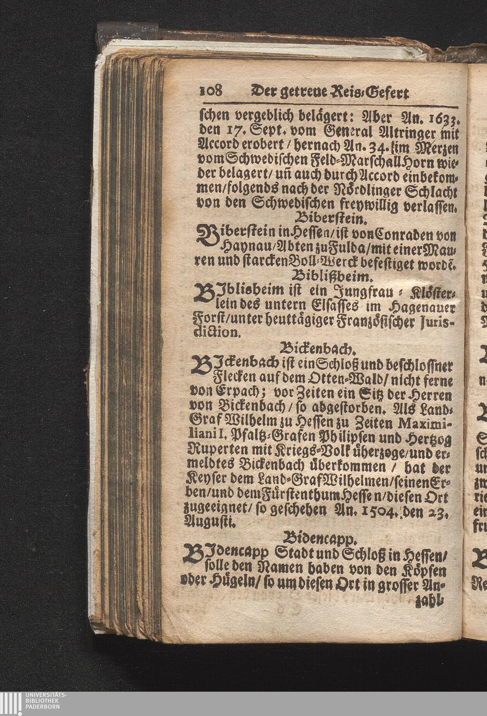 Der getreue Reiß-Gefert durch Ober- und Nieder-Teutschland : Das ist: Grundrichtige und ausführliche Abhandlung derer jenigen Residenzien/ Städte/ Schlösser/ Vestungen/ Städtlein und nahmhafften Markflecken/ welche so wol in Ober- als Nieder-Teutschland/ einem Reisenden sich hin und wieder vorstellig machen und zwar solcher Gestalt/ daß darinn derer Ursprung/ Aufnahm/ Fortification/ Raritäten/ herrliche Gebäue/ und Glück- und Unglücks-Fälle bis auf gegenwärtige Zeit fortgesetzt enthalten. Dabey auch noch über das ein absonderlicher kurz-gefasster Weegweiser angehänget zu finden/ worinnen klärlich zu sehen, wie viel Meilen ein Ort von dem andern entlegen. Alles aus denen bewährtesten Scribenten hervorgesuchet/ zum Nutz-Ergötzen mitgetheilet ...
