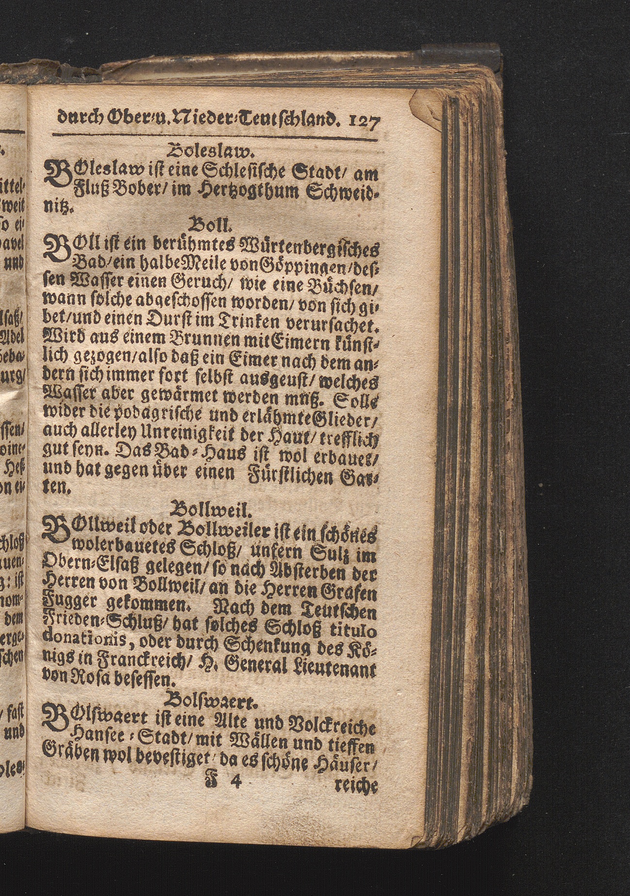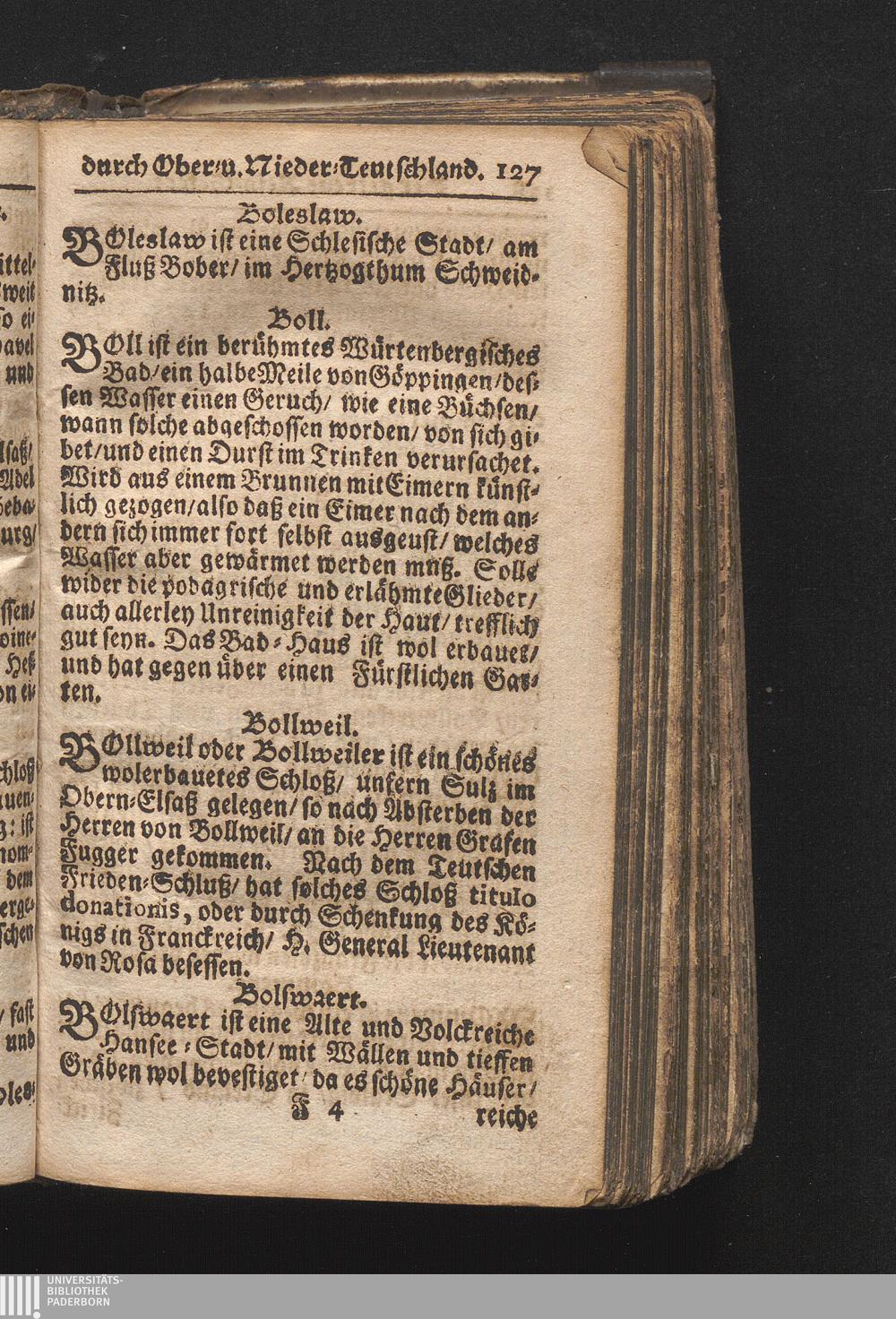 Der getreue Reiß-Gefert durch Ober- und Nieder-Teutschland : Das ist: Grundrichtige und ausführliche Abhandlung derer jenigen Residenzien/ Städte/ Schlösser/ Vestungen/ Städtlein und nahmhafften Markflecken/ welche so wol in Ober- als Nieder-Teutschland/ einem Reisenden sich hin und wieder vorstellig machen und zwar solcher Gestalt/ daß darinn derer Ursprung/ Aufnahm/ Fortification/ Raritäten/ herrliche Gebäue/ und Glück- und Unglücks-Fälle bis auf gegenwärtige Zeit fortgesetzt enthalten. Dabey auch noch über das ein absonderlicher kurz-gefasster Weegweiser angehänget zu finden/ worinnen klärlich zu sehen, wie viel Meilen ein Ort von dem andern entlegen. Alles aus denen bewährtesten Scribenten hervorgesuchet/ zum Nutz-Ergötzen mitgetheilet ...