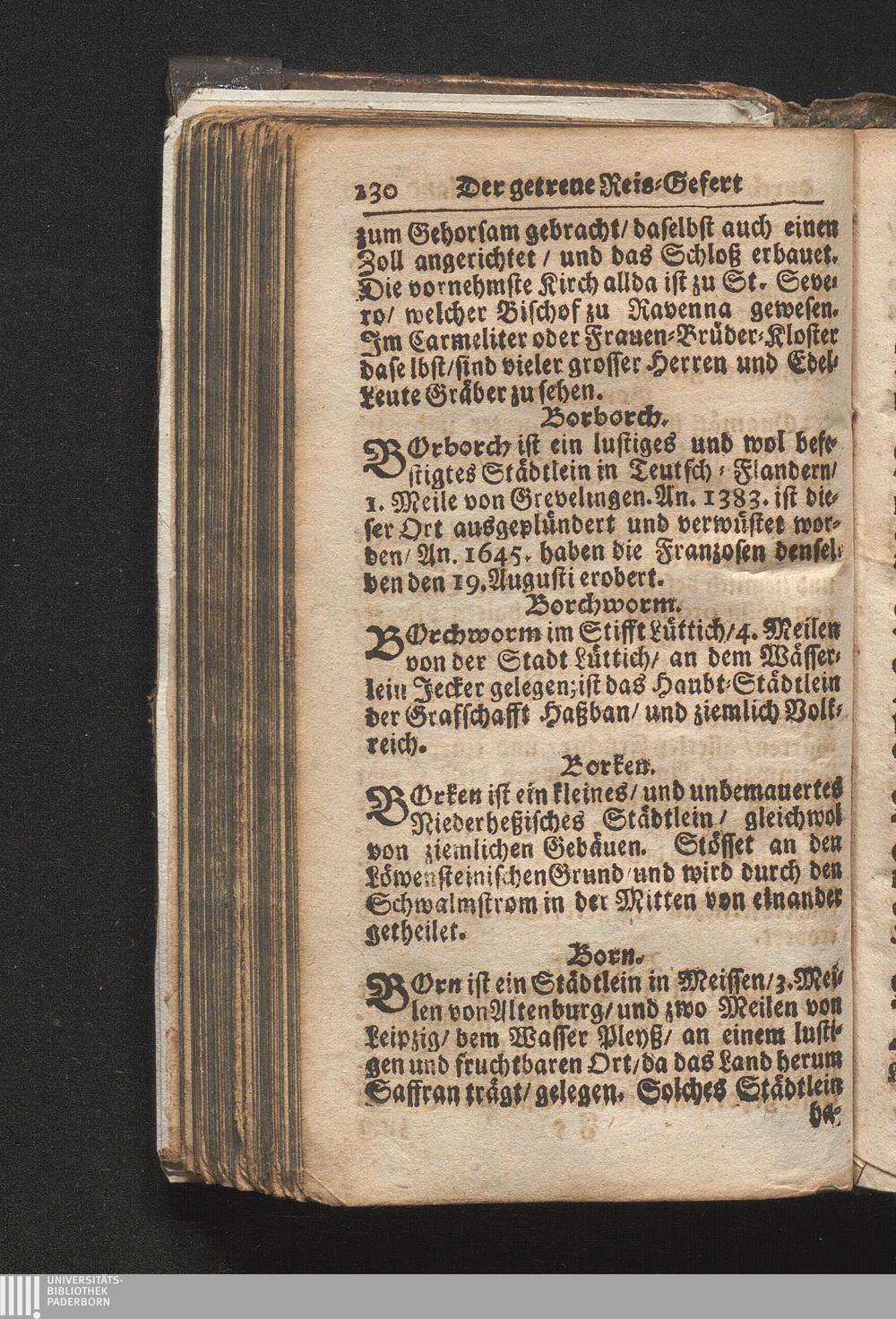 Der getreue Reiß-Gefert durch Ober- und Nieder-Teutschland : Das ist: Grundrichtige und ausführliche Abhandlung derer jenigen Residenzien/ Städte/ Schlösser/ Vestungen/ Städtlein und nahmhafften Markflecken/ welche so wol in Ober- als Nieder-Teutschland/ einem Reisenden sich hin und wieder vorstellig machen und zwar solcher Gestalt/ daß darinn derer Ursprung/ Aufnahm/ Fortification/ Raritäten/ herrliche Gebäue/ und Glück- und Unglücks-Fälle bis auf gegenwärtige Zeit fortgesetzt enthalten. Dabey auch noch über das ein absonderlicher kurz-gefasster Weegweiser angehänget zu finden/ worinnen klärlich zu sehen, wie viel Meilen ein Ort von dem andern entlegen. Alles aus denen bewährtesten Scribenten hervorgesuchet/ zum Nutz-Ergötzen mitgetheilet ...