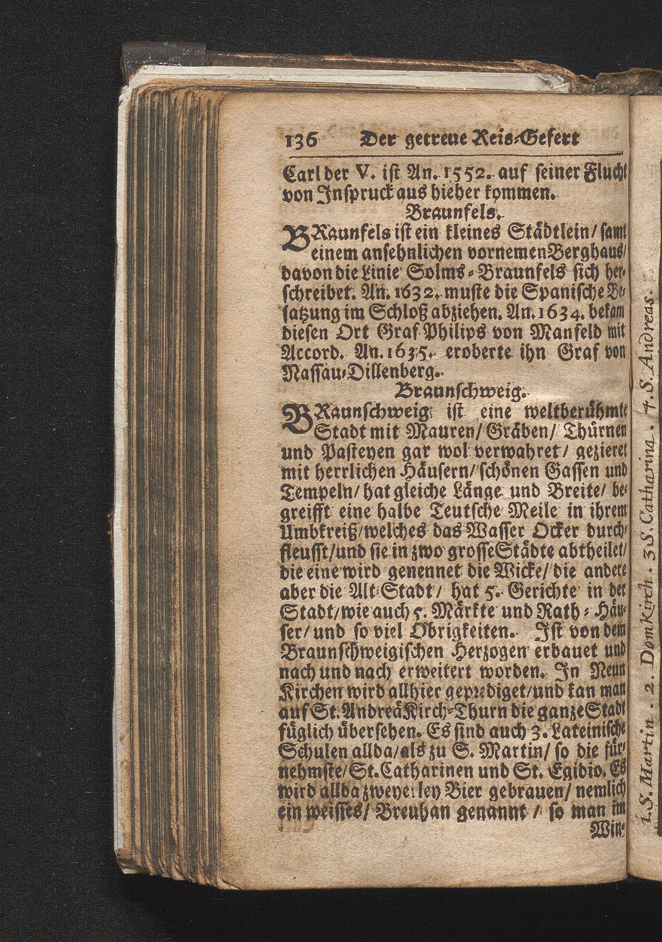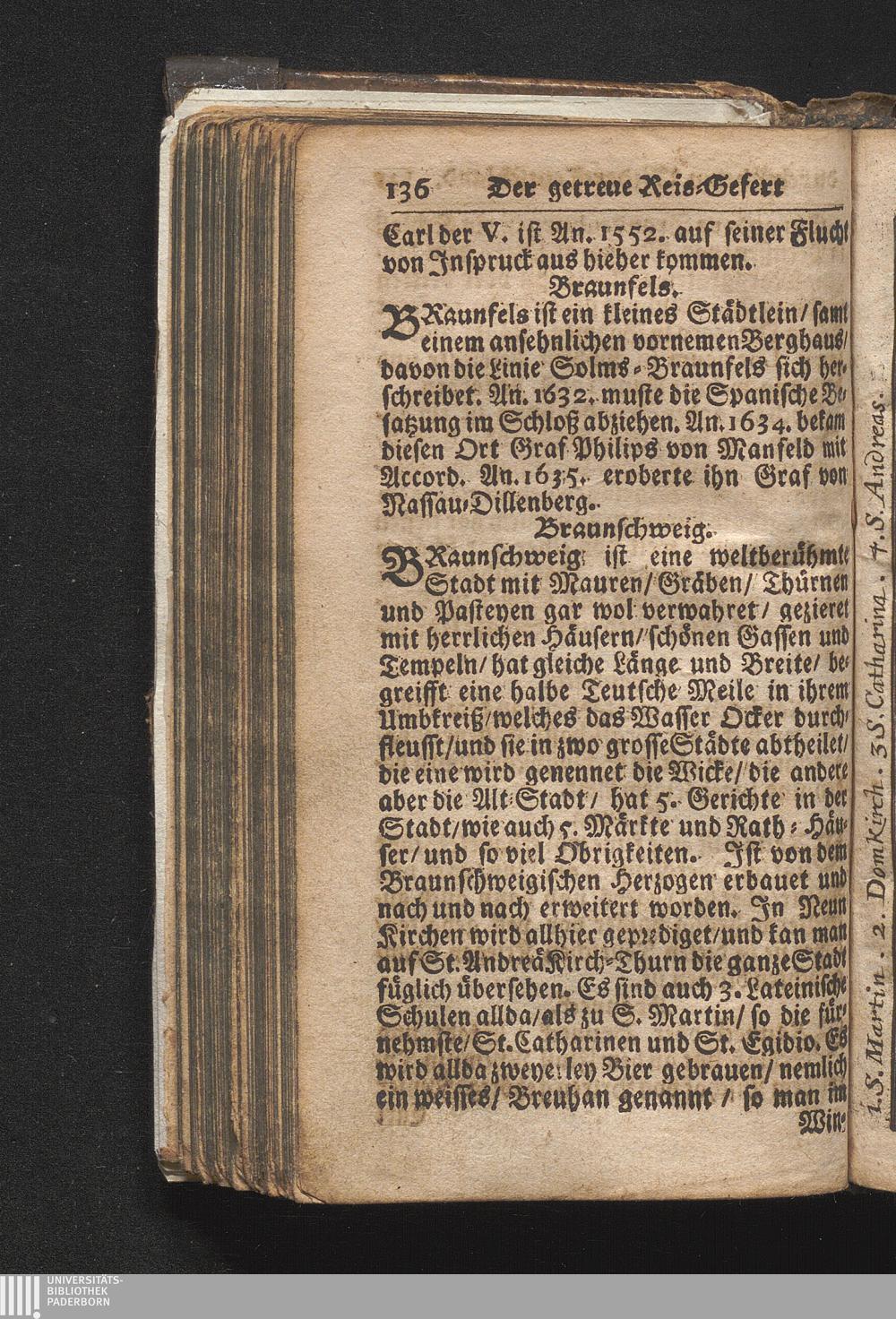 Der getreue Reiß-Gefert durch Ober- und Nieder-Teutschland : Das ist: Grundrichtige und ausführliche Abhandlung derer jenigen Residenzien/ Städte/ Schlösser/ Vestungen/ Städtlein und nahmhafften Markflecken/ welche so wol in Ober- als Nieder-Teutschland/ einem Reisenden sich hin und wieder vorstellig machen und zwar solcher Gestalt/ daß darinn derer Ursprung/ Aufnahm/ Fortification/ Raritäten/ herrliche Gebäue/ und Glück- und Unglücks-Fälle bis auf gegenwärtige Zeit fortgesetzt enthalten. Dabey auch noch über das ein absonderlicher kurz-gefasster Weegweiser angehänget zu finden/ worinnen klärlich zu sehen, wie viel Meilen ein Ort von dem andern entlegen. Alles aus denen bewährtesten Scribenten hervorgesuchet/ zum Nutz-Ergötzen mitgetheilet ...