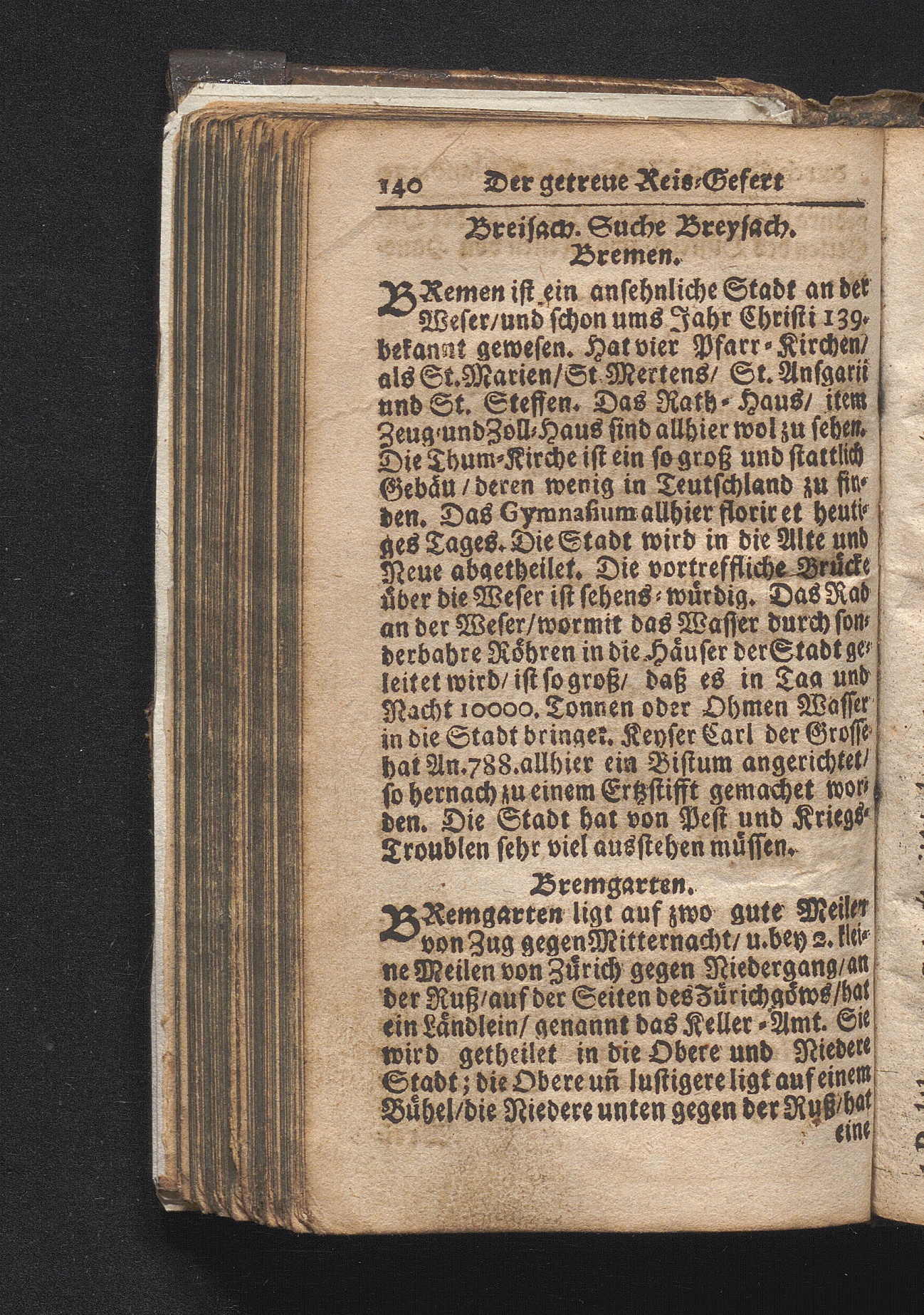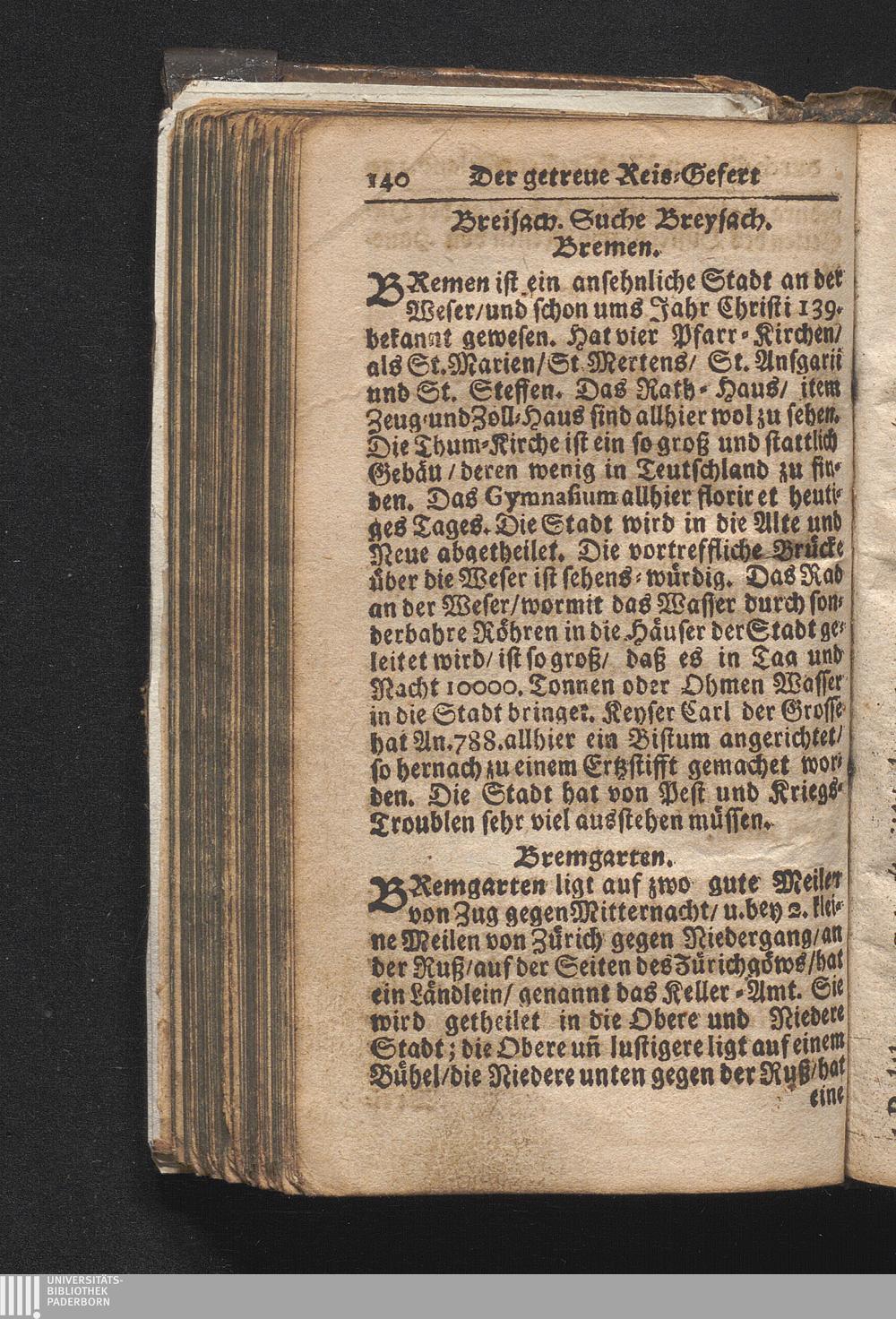 Der getreue Reiß-Gefert durch Ober- und Nieder-Teutschland : Das ist: Grundrichtige und ausführliche Abhandlung derer jenigen Residenzien/ Städte/ Schlösser/ Vestungen/ Städtlein und nahmhafften Markflecken/ welche so wol in Ober- als Nieder-Teutschland/ einem Reisenden sich hin und wieder vorstellig machen und zwar solcher Gestalt/ daß darinn derer Ursprung/ Aufnahm/ Fortification/ Raritäten/ herrliche Gebäue/ und Glück- und Unglücks-Fälle bis auf gegenwärtige Zeit fortgesetzt enthalten. Dabey auch noch über das ein absonderlicher kurz-gefasster Weegweiser angehänget zu finden/ worinnen klärlich zu sehen, wie viel Meilen ein Ort von dem andern entlegen. Alles aus denen bewährtesten Scribenten hervorgesuchet/ zum Nutz-Ergötzen mitgetheilet ...
