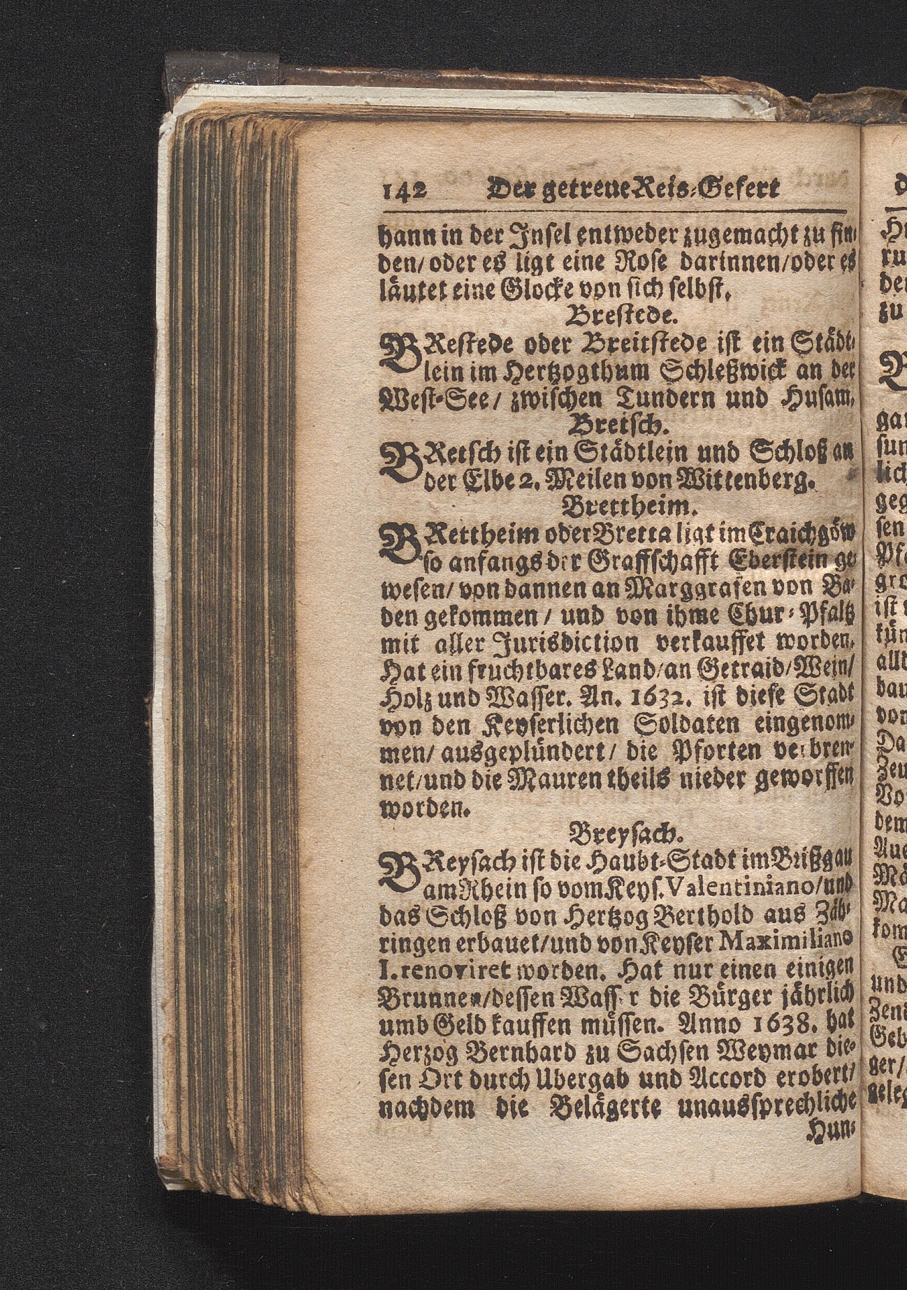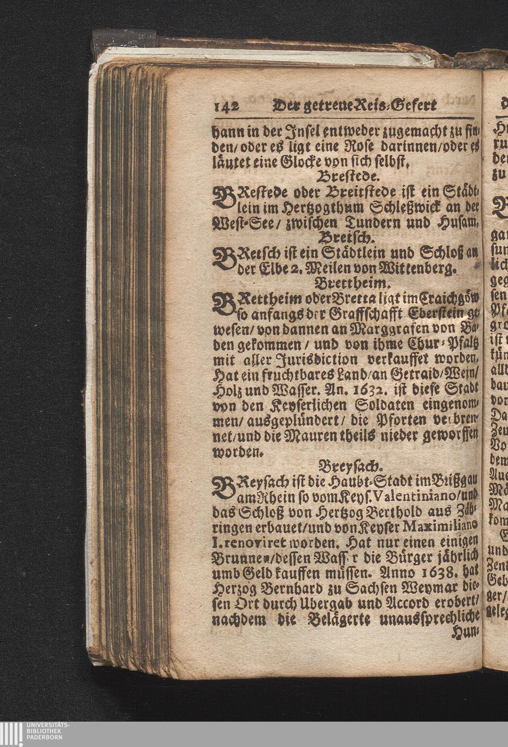 Der getreue Reiß-Gefert durch Ober- und Nieder-Teutschland : Das ist: Grundrichtige und ausführliche Abhandlung derer jenigen Residenzien/ Städte/ Schlösser/ Vestungen/ Städtlein und nahmhafften Markflecken/ welche so wol in Ober- als Nieder-Teutschland/ einem Reisenden sich hin und wieder vorstellig machen und zwar solcher Gestalt/ daß darinn derer Ursprung/ Aufnahm/ Fortification/ Raritäten/ herrliche Gebäue/ und Glück- und Unglücks-Fälle bis auf gegenwärtige Zeit fortgesetzt enthalten. Dabey auch noch über das ein absonderlicher kurz-gefasster Weegweiser angehänget zu finden/ worinnen klärlich zu sehen, wie viel Meilen ein Ort von dem andern entlegen. Alles aus denen bewährtesten Scribenten hervorgesuchet/ zum Nutz-Ergötzen mitgetheilet ...