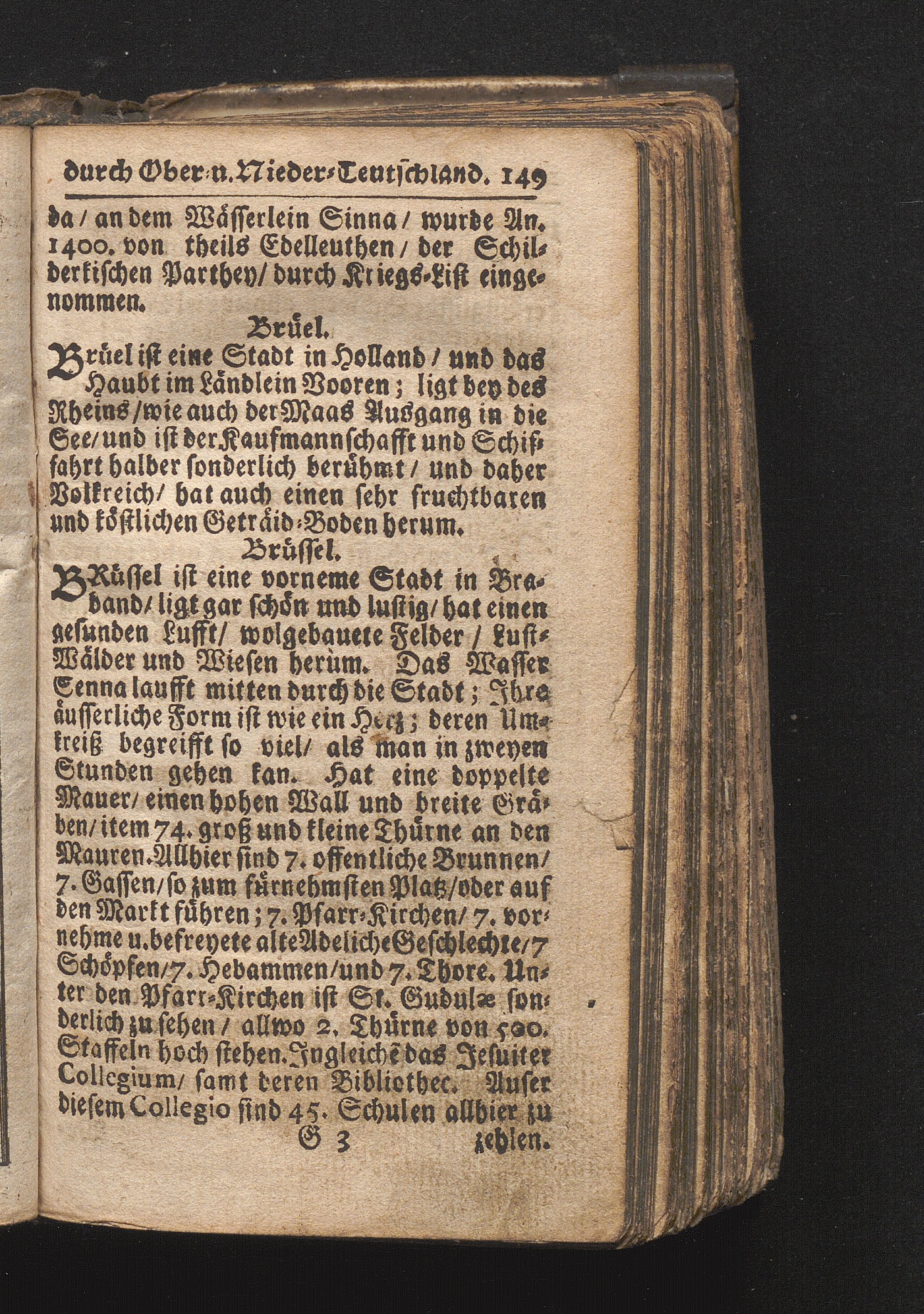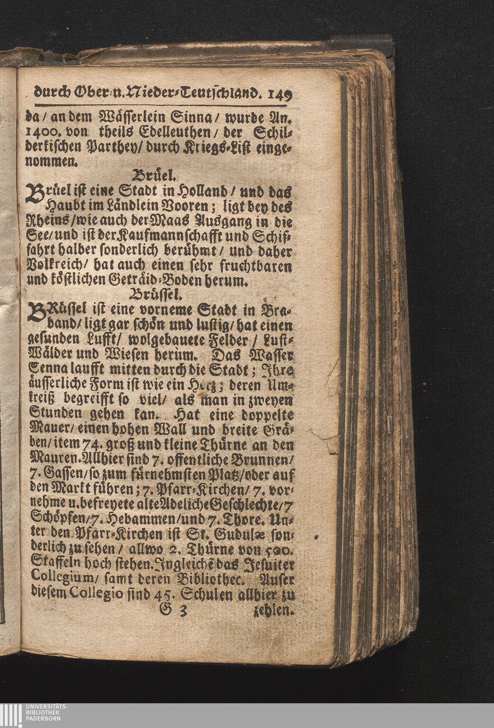 Der getreue Reiß-Gefert durch Ober- und Nieder-Teutschland : Das ist: Grundrichtige und ausführliche Abhandlung derer jenigen Residenzien/ Städte/ Schlösser/ Vestungen/ Städtlein und nahmhafften Markflecken/ welche so wol in Ober- als Nieder-Teutschland/ einem Reisenden sich hin und wieder vorstellig machen und zwar solcher Gestalt/ daß darinn derer Ursprung/ Aufnahm/ Fortification/ Raritäten/ herrliche Gebäue/ und Glück- und Unglücks-Fälle bis auf gegenwärtige Zeit fortgesetzt enthalten. Dabey auch noch über das ein absonderlicher kurz-gefasster Weegweiser angehänget zu finden/ worinnen klärlich zu sehen, wie viel Meilen ein Ort von dem andern entlegen. Alles aus denen bewährtesten Scribenten hervorgesuchet/ zum Nutz-Ergötzen mitgetheilet ...