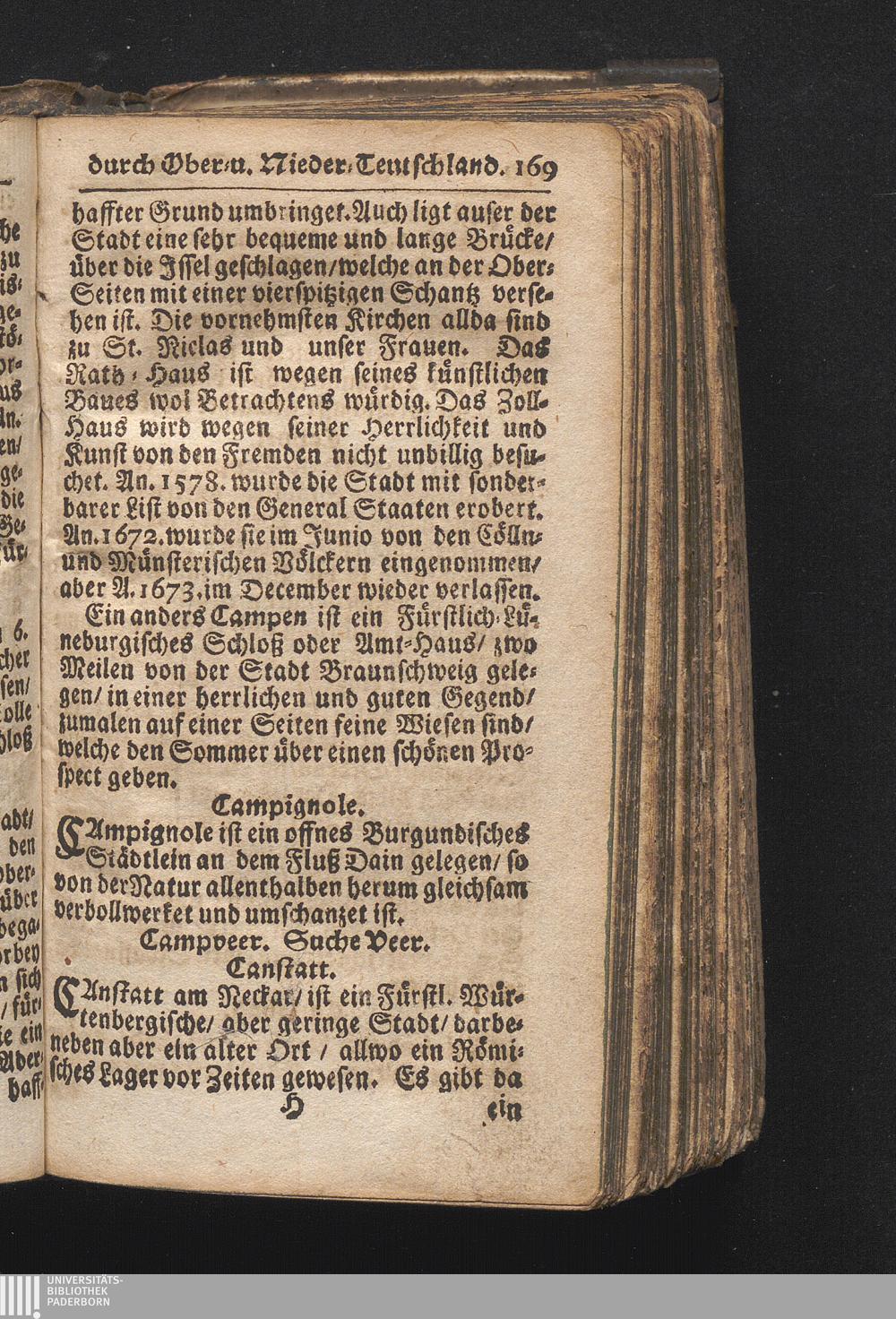 Der getreue Reiß-Gefert durch Ober- und Nieder-Teutschland : Das ist: Grundrichtige und ausführliche Abhandlung derer jenigen Residenzien/ Städte/ Schlösser/ Vestungen/ Städtlein und nahmhafften Markflecken/ welche so wol in Ober- als Nieder-Teutschland/ einem Reisenden sich hin und wieder vorstellig machen und zwar solcher Gestalt/ daß darinn derer Ursprung/ Aufnahm/ Fortification/ Raritäten/ herrliche Gebäue/ und Glück- und Unglücks-Fälle bis auf gegenwärtige Zeit fortgesetzt enthalten. Dabey auch noch über das ein absonderlicher kurz-gefasster Weegweiser angehänget zu finden/ worinnen klärlich zu sehen, wie viel Meilen ein Ort von dem andern entlegen. Alles aus denen bewährtesten Scribenten hervorgesuchet/ zum Nutz-Ergötzen mitgetheilet ...