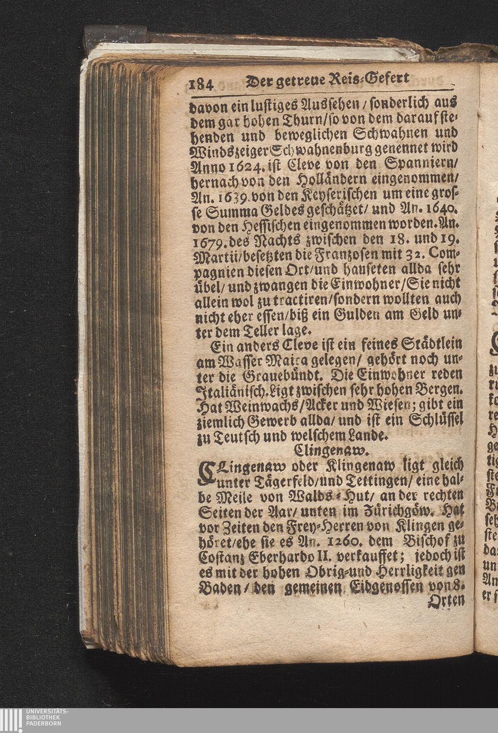 Der getreue Reiß-Gefert durch Ober- und Nieder-Teutschland : Das ist: Grundrichtige und ausführliche Abhandlung derer jenigen Residenzien/ Städte/ Schlösser/ Vestungen/ Städtlein und nahmhafften Markflecken/ welche so wol in Ober- als Nieder-Teutschland/ einem Reisenden sich hin und wieder vorstellig machen und zwar solcher Gestalt/ daß darinn derer Ursprung/ Aufnahm/ Fortification/ Raritäten/ herrliche Gebäue/ und Glück- und Unglücks-Fälle bis auf gegenwärtige Zeit fortgesetzt enthalten. Dabey auch noch über das ein absonderlicher kurz-gefasster Weegweiser angehänget zu finden/ worinnen klärlich zu sehen, wie viel Meilen ein Ort von dem andern entlegen. Alles aus denen bewährtesten Scribenten hervorgesuchet/ zum Nutz-Ergötzen mitgetheilet ...