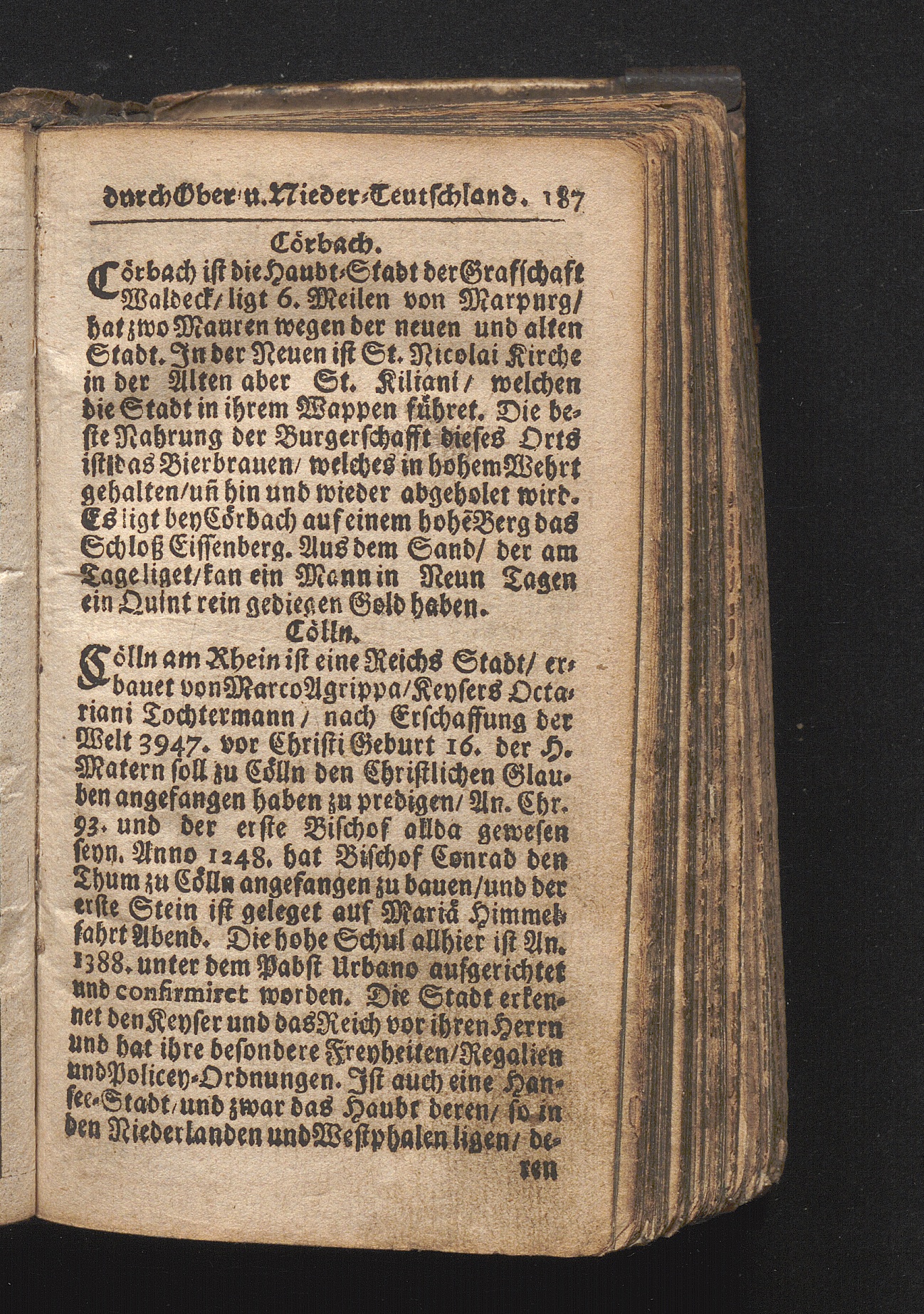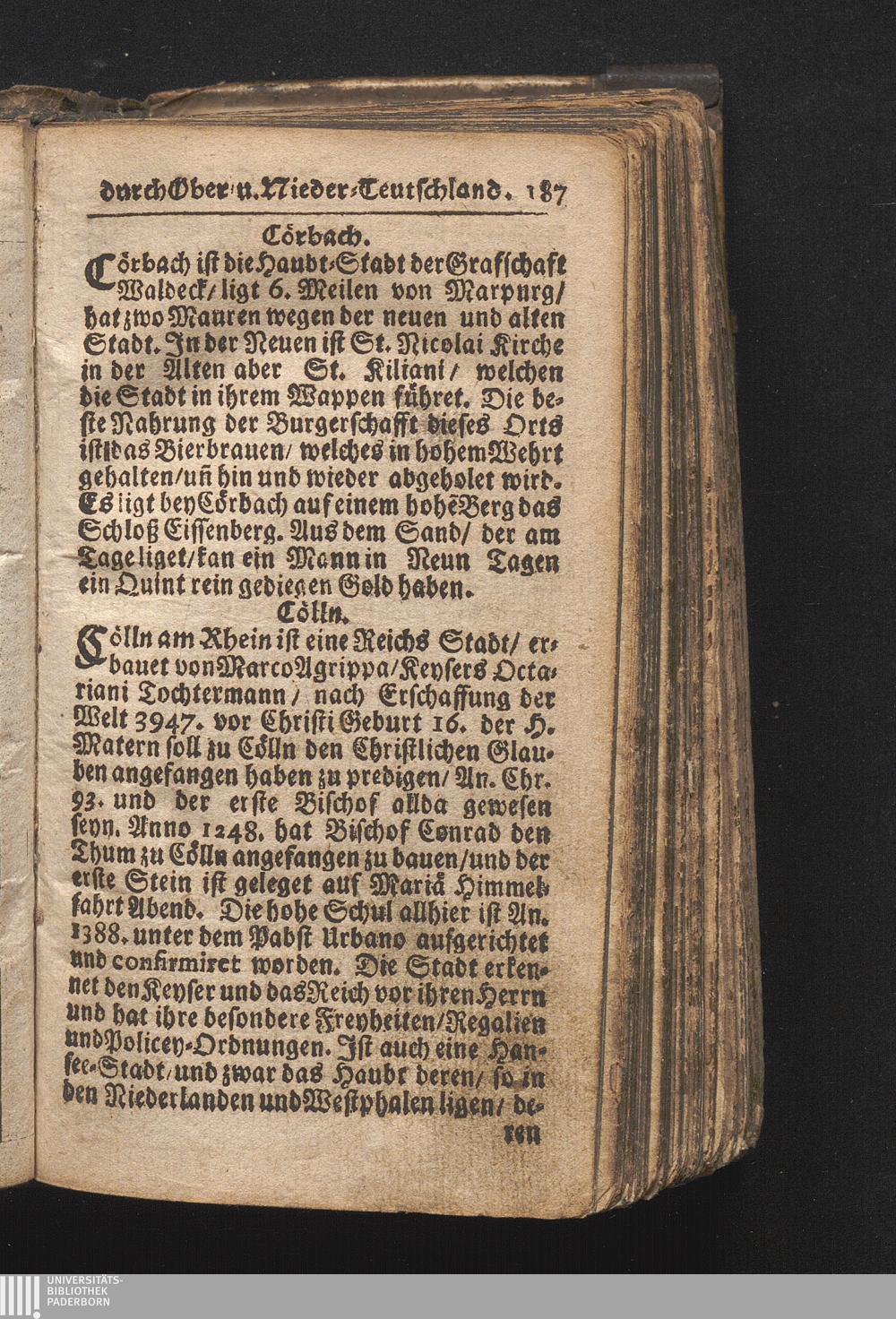 Der getreue Reiß-Gefert durch Ober- und Nieder-Teutschland : Das ist: Grundrichtige und ausführliche Abhandlung derer jenigen Residenzien/ Städte/ Schlösser/ Vestungen/ Städtlein und nahmhafften Markflecken/ welche so wol in Ober- als Nieder-Teutschland/ einem Reisenden sich hin und wieder vorstellig machen und zwar solcher Gestalt/ daß darinn derer Ursprung/ Aufnahm/ Fortification/ Raritäten/ herrliche Gebäue/ und Glück- und Unglücks-Fälle bis auf gegenwärtige Zeit fortgesetzt enthalten. Dabey auch noch über das ein absonderlicher kurz-gefasster Weegweiser angehänget zu finden/ worinnen klärlich zu sehen, wie viel Meilen ein Ort von dem andern entlegen. Alles aus denen bewährtesten Scribenten hervorgesuchet/ zum Nutz-Ergötzen mitgetheilet ...